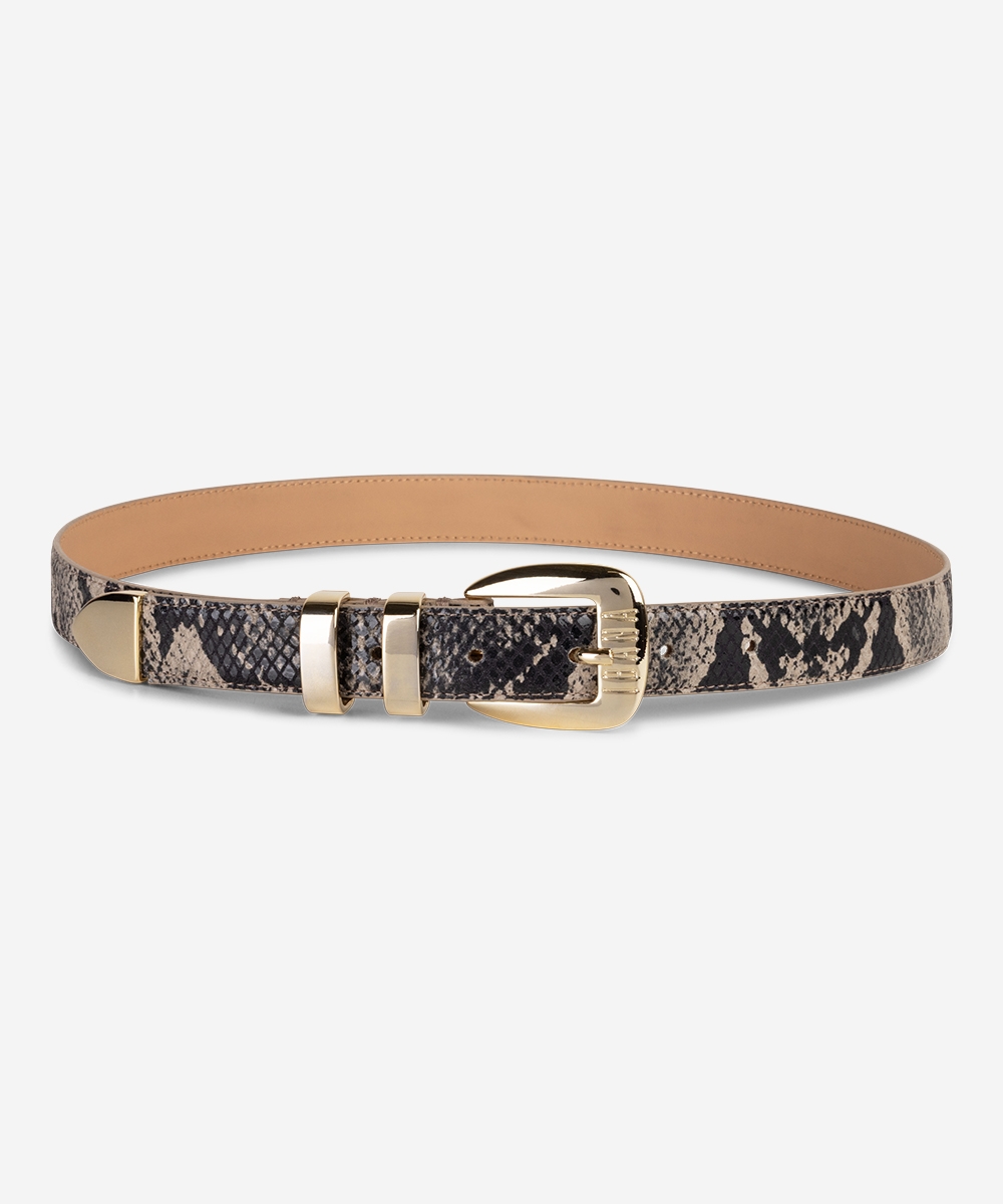 De leren Acro riem is een elegante riem met slangenprint in de kleur Grijs. Deze stijlvolle musthave is voorzien van gouden details en geeft elke outfit net dat beetje extra. Verkrijgbaar in maten S (75 cm), M (85 cm) en L (95 cm).| Afmeting: | S: 75cm M: 85cm L: 95cm |
