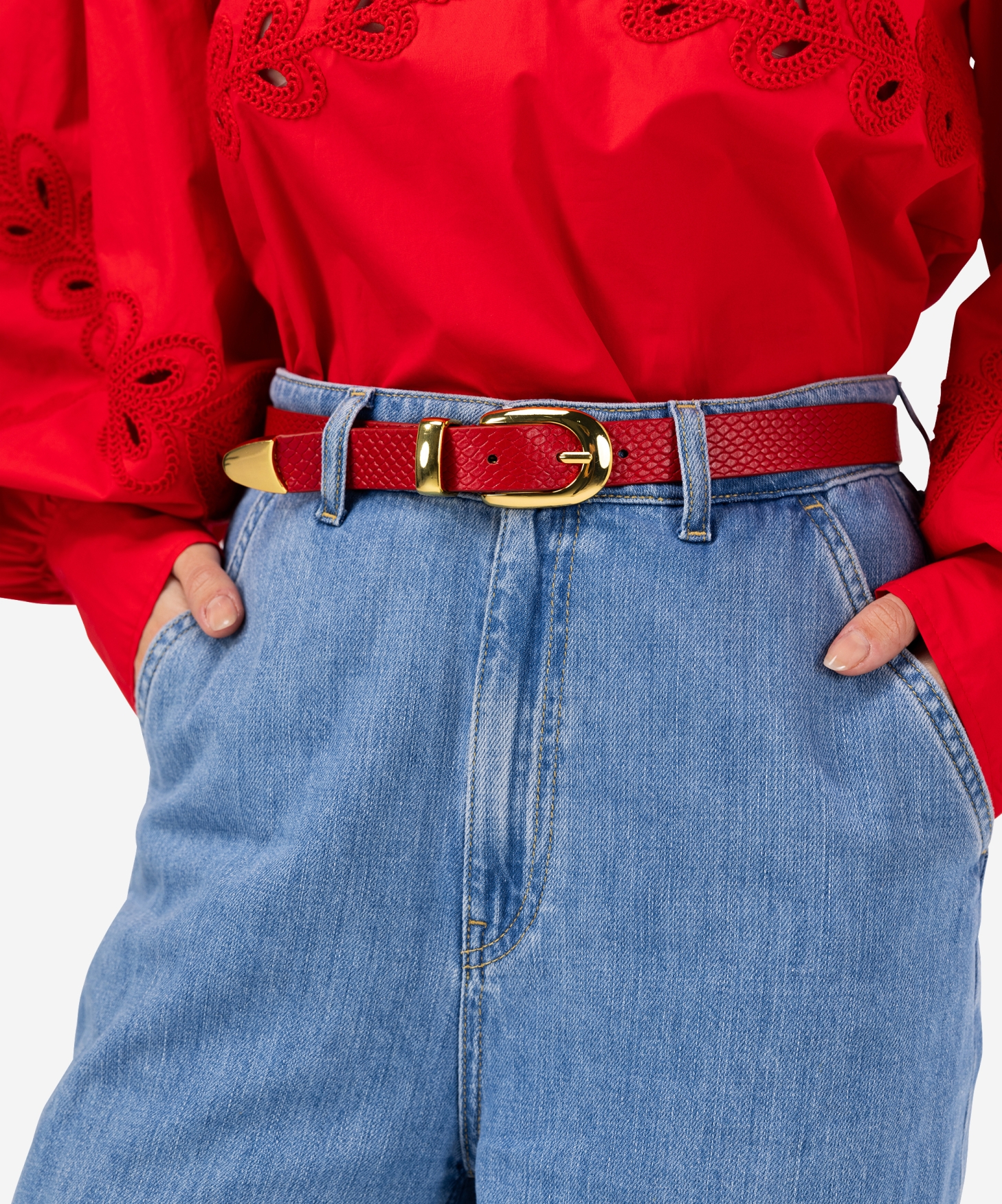Voeg kleur toe aan je outfit met de Amara Belt in Barbados Cherry. Deze riem is gemaakt van hoogwaardig leer en afgewerkt met een gouden gesp en mooi reliëf. De perfecte finishing touch voor jouw favoriete jurken of broeken. Verkrijgbaar in maten S (75 cm), M (85 cm) en L (95 cm).| Afmeting: | S: 75cm M: 85cm L: 95cm |