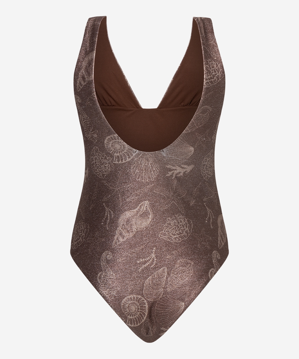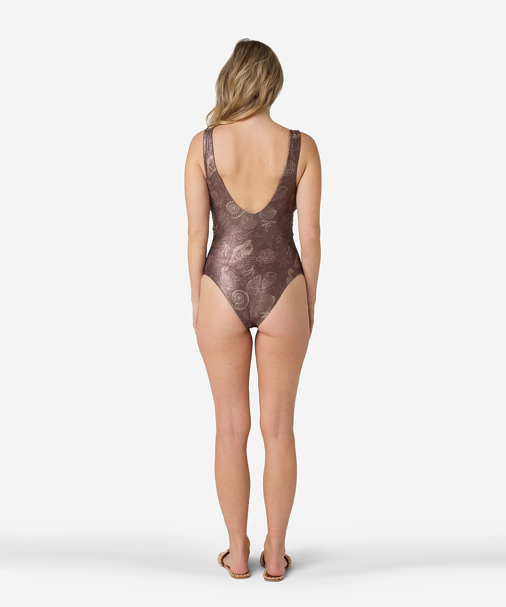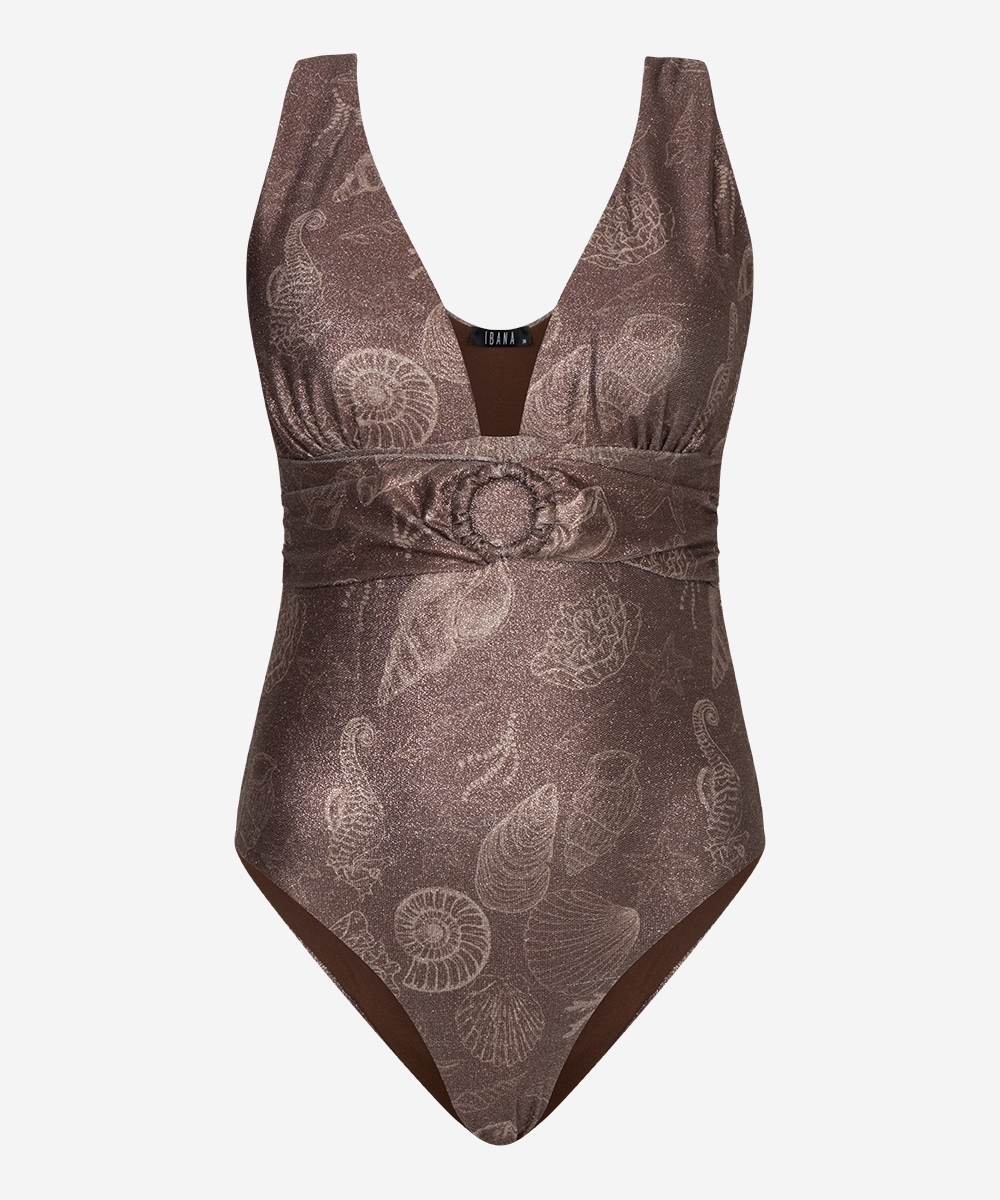 Het Avana badpak in de kleur Shell Maron heeft een vrouwelijke en elegante uitstraling. Het ontwerp is uitgevoerd met een diepe V-hals en een flatterende belijning. De stretch stof zorgt voor een comfortabele fit en een mooi aansluitend effect. Het subtiele ringdetail in de taille geeft het badpak een verfijnde, zomerse touch. Perfect voor zowel strand- als poolside momenten. Stylingtip: draag de Avana badpak met een luchtige kimono of oversized blouse en sandalen voor een stijlvolle beach look.