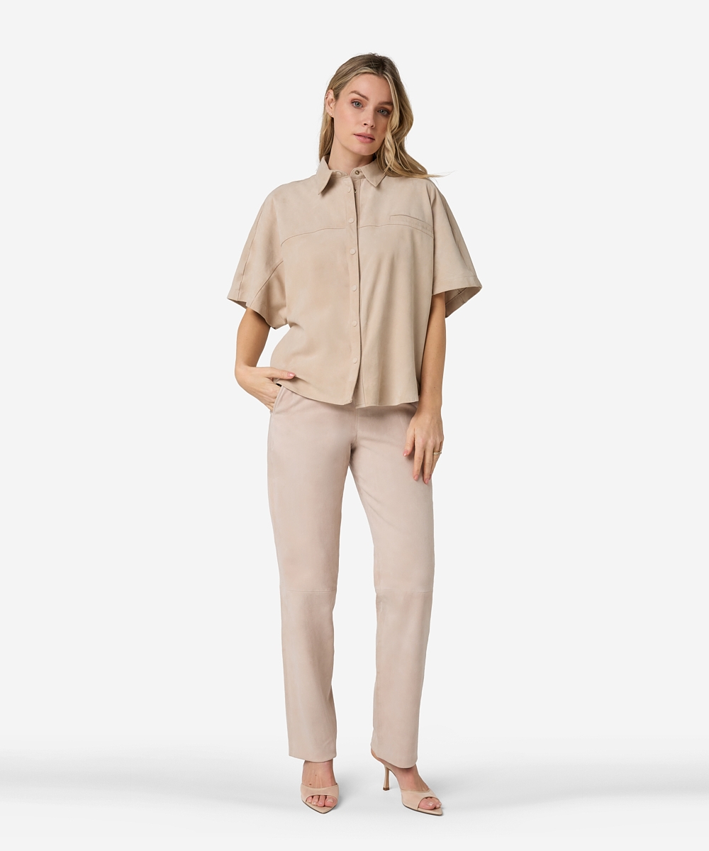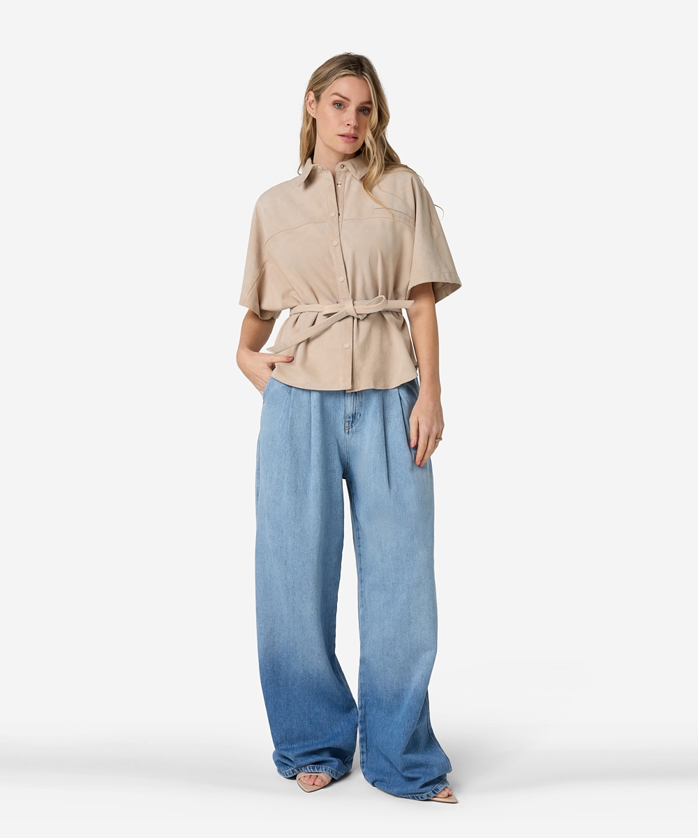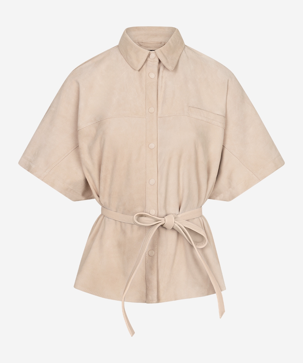 De Blaire Suede blouse in de kleur Ostra Beige heeft een verfijnde kraag en een getailleerde fit. De blouse is gemaakt van leer (suède) en uitgevoerd met vleermuismouwen. Dankzij de non-stretch afwerking behoudt de blouse zijn vorm en luxe look. Een statement piece dat klasse toevoegt aan elke outfit. Stylingtip: combineer de Blaire Suede blouse met de Pristina jeans.