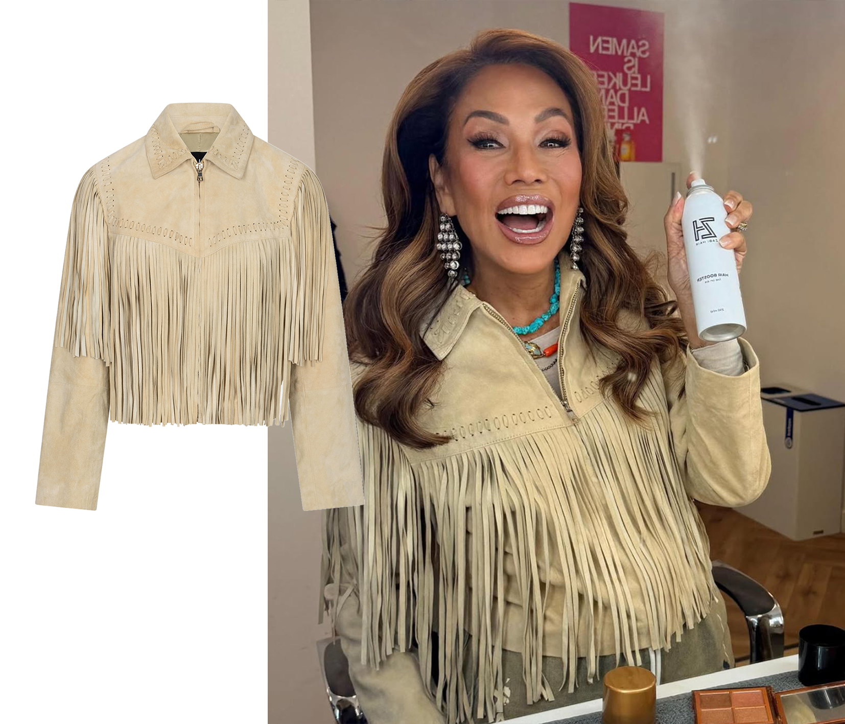 Janine Kho straalt in de Joyce suede jacket, een item die direct opvalt door zijn verfijnde silhouet en rijke suède. De ceintuur in de taille zorgt voor een vrouwelijk accent en geeft de look een elegante, maar krachtige uitstraling. De afneembare mouwen maken dit ontwerp extra veelzijdig: draag het als jacket voor een klassieke look of als gilet voor een meer gelaagde, eigentijdse styling.