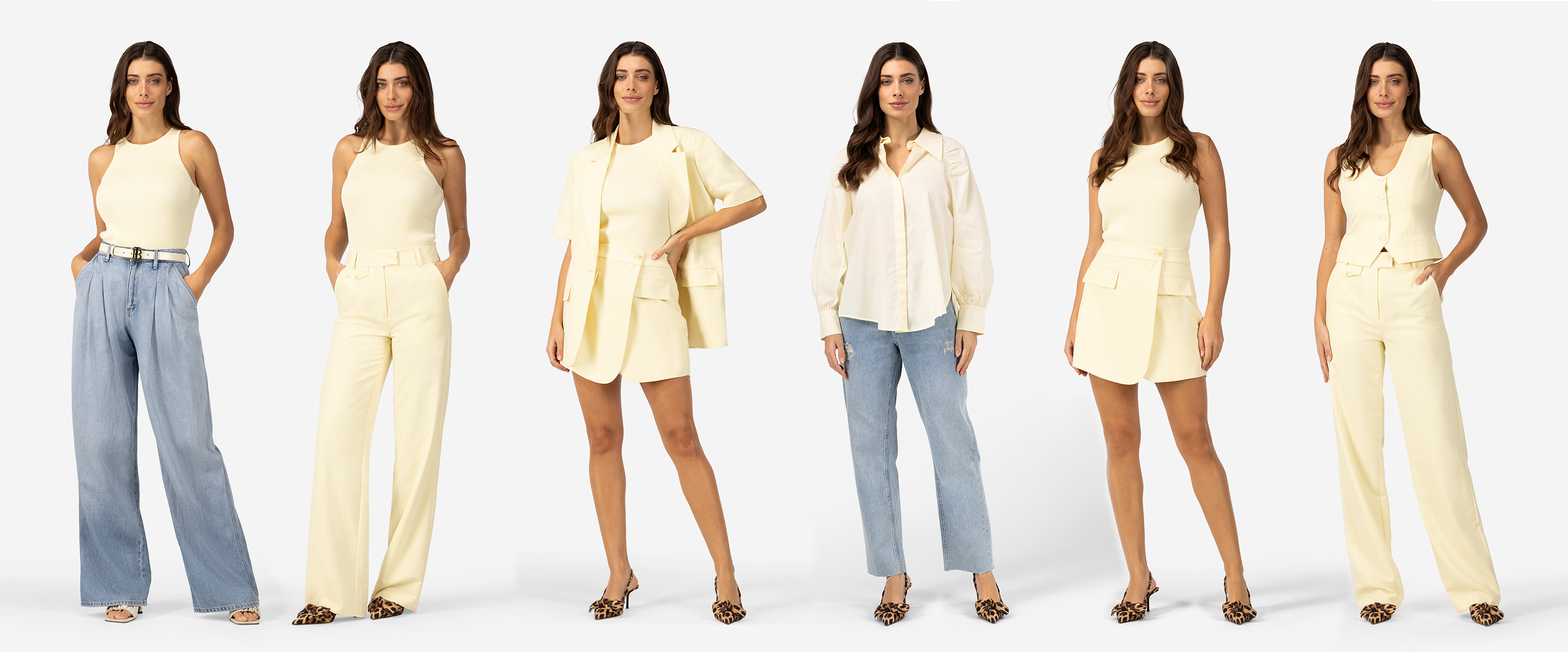 - Ton-sur-ton: Combineer de Giallo Tenue items met elkaar voor een elegante, vrouwelijke en tonale look.