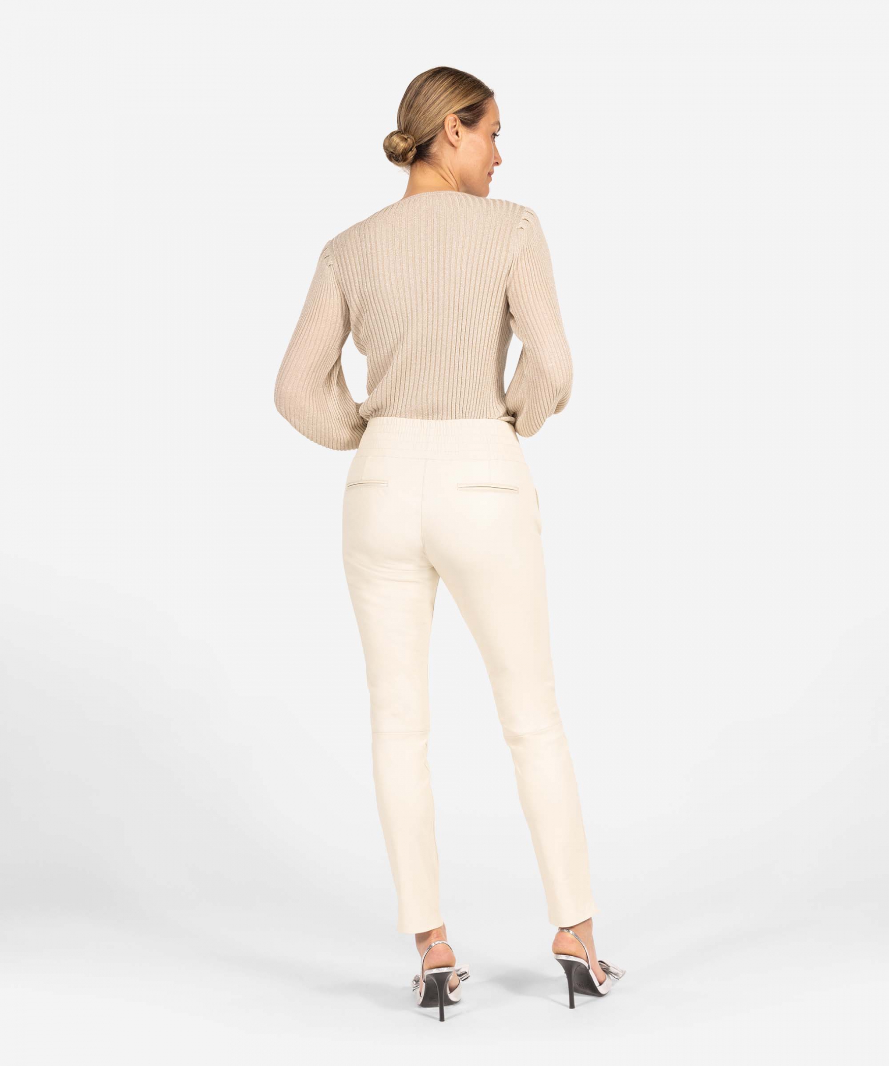 De Colette in Coco White is een echte must-have dit seizoen. Deze mid-waist broek is gemaakt van hoogwaardige leer gecombineerd met stretchstof, wat zorgt voor de ultieme pasvorm en comfort. De elastische band rondom de taille biedt extra flexibiliteit en een perfecte fit. Met twee handige zakken aan de zijkant is de Colette zowel praktisch als stijlvol. De Colette kan voor meerdere gelegenheden worden gedragen, of je nu kiest voor een chiquere look met onze Totie top in Coco White en hakken of een casual look met sneakers.| Buitenzakken: | Twee zijzakken |