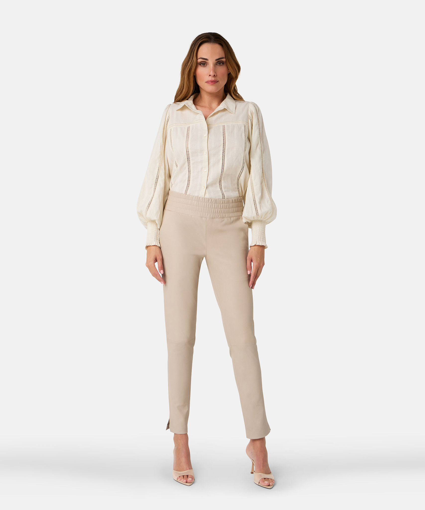 De Colette pants in Sandstone is een van onze bestverkochte leren stretchbroeken, bekend om haar flatterende skinny fit en hoge elastische tailleband. De kleine splitjes aan de onderkant maken het aan- en uittrekken extra makkelijk. Deze klassieker keert elk seizoen terug in nieuwe kleuren en blijft een veelzijdige favoriet. Combineer net als op de foto met de Briley blouse voor een ton-sur-ton look. Of combineer met onze Tessa denim top.Binnenbeenlengte: | 74cm |