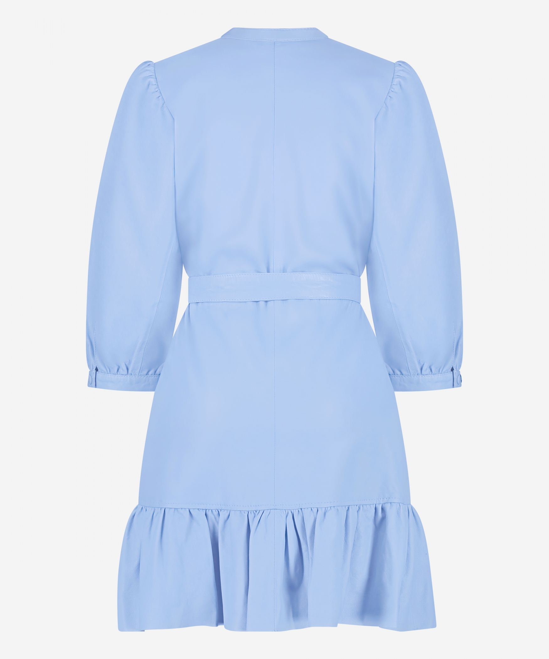 Dit is de leren jurk Danielle in de kleur Airy Blue. Gemaakt van hoogwaardige leer kwaliteit biedt deze jurk een combinatie van elegantie en verfijning. Met V-hals en bijpassend ceintuur voor rondom de taille, benadrukt deze jurk de vrouwelijke vormen. De jurk heeft driekwart mouwen en aan de onderkant van de jurk loopt de jurk uit in een strook met ruffles. De Danielle is eenvoudig aan te trekken over het hoofd door de ruime fit. Combineer de Danielle met prachtige open sandalen voor een vrouwelijke look.