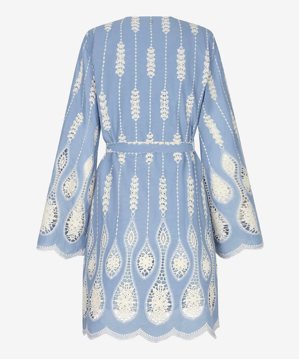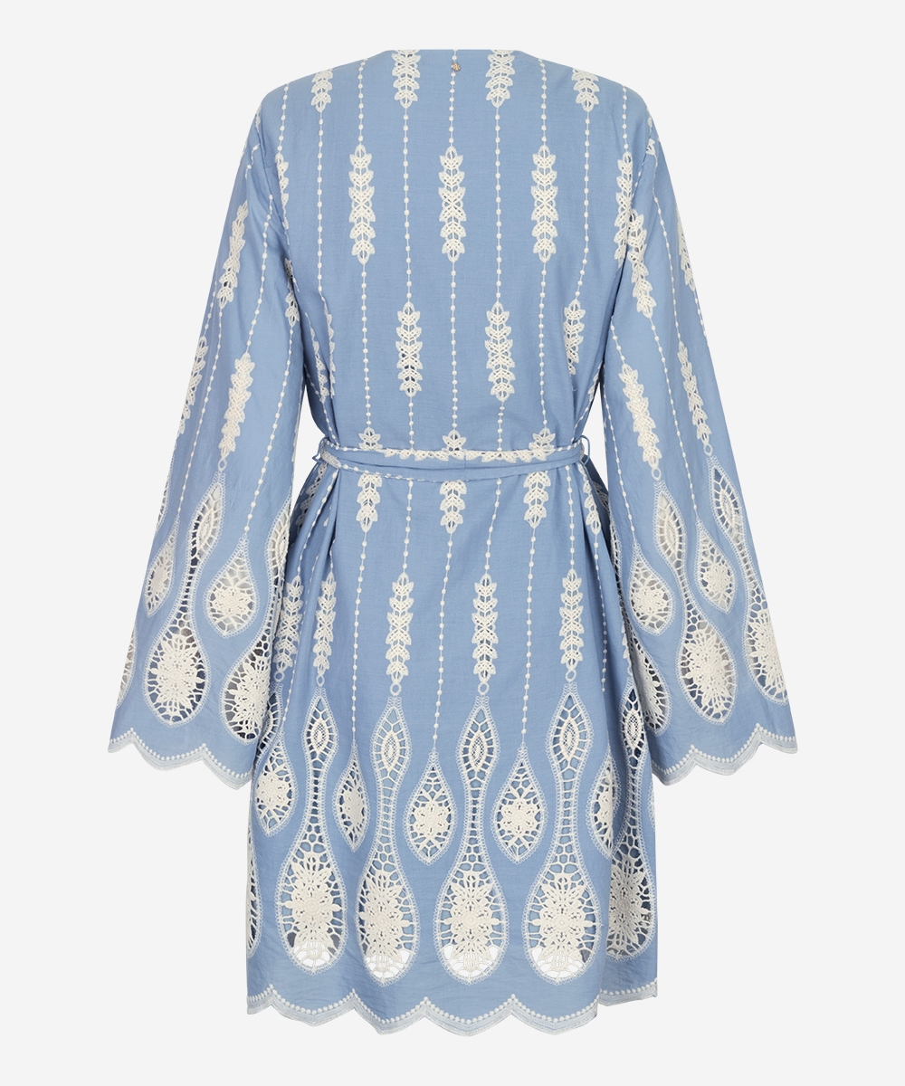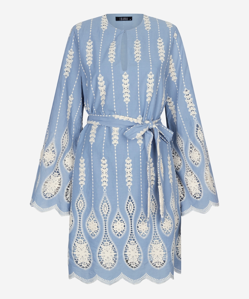 De Danna dress in de kleur Violetta Blue is een elegante zomerjurk met een romantische twist. Gemaakt van 100% katoen, heeft deze non-stretch jurk een flatterende v-hals, een regular fit en uitlopende mouwen. Het ceintuur in de taille accentueert het silhouet, terwijl de verfijnde embroidery de look een bohemian feel geeft. Combineer de Danna dress met leren sandalen of een woven bag uit de collectie.