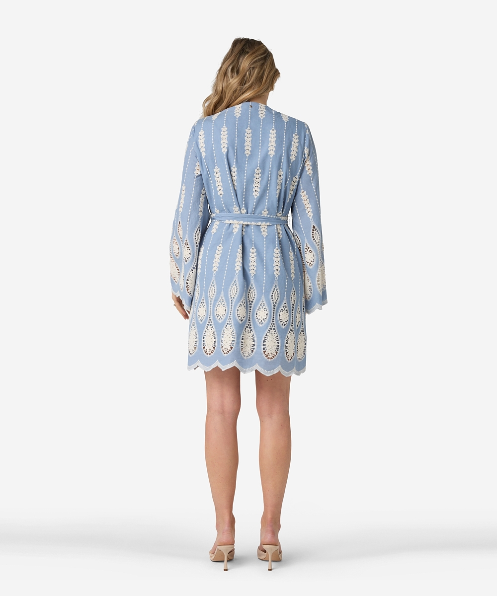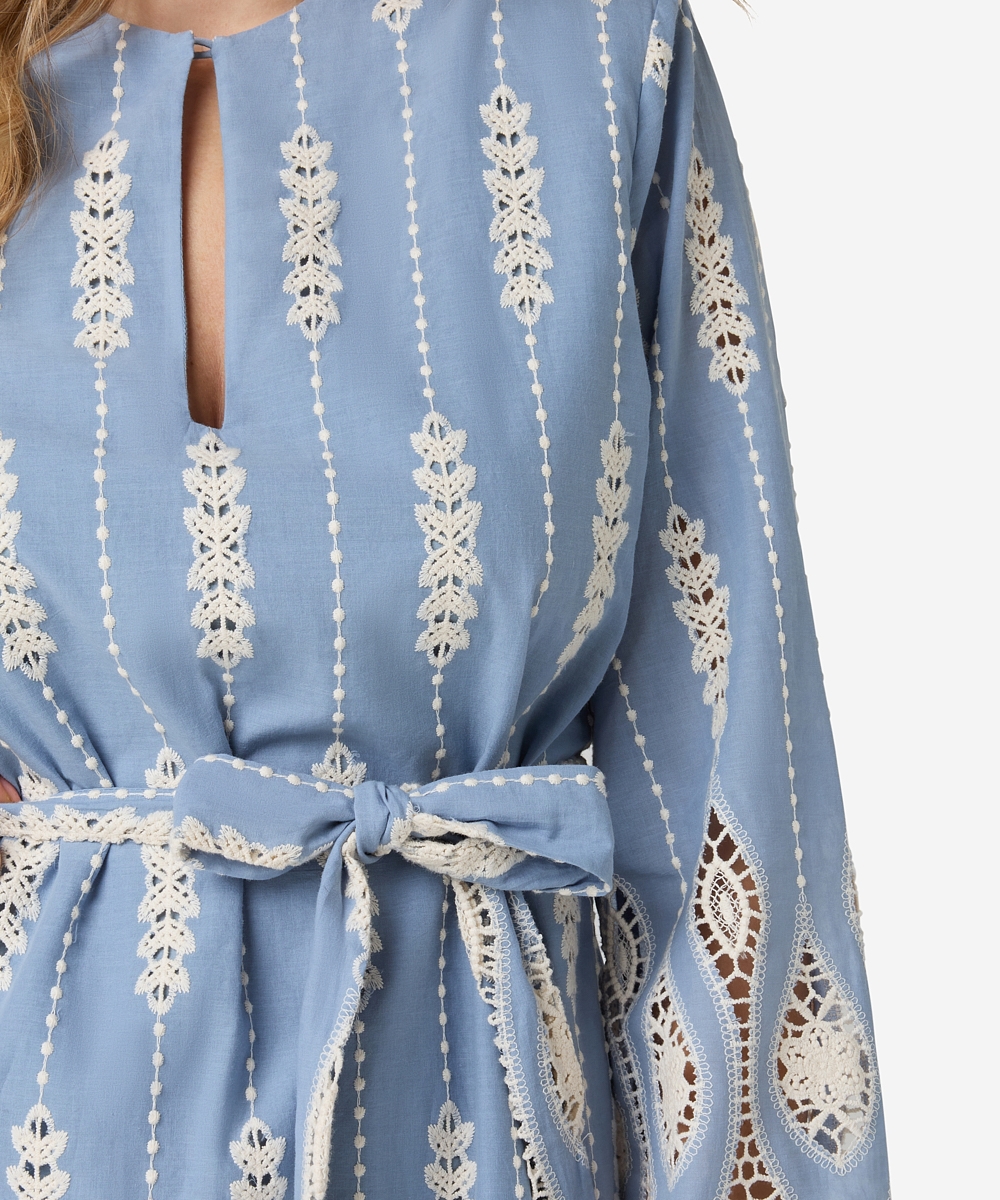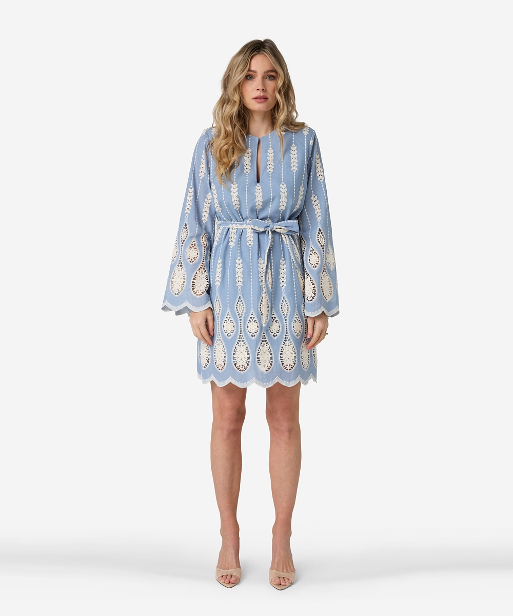 De Danna dress in de kleur Violetta Blue is een elegante zomerjurk met een romantische twist. Gemaakt van 100% katoen, heeft deze non-stretch jurk een flatterende v-hals, een regular fit en uitlopende mouwen. Het ceintuur in de taille accentueert het silhouet, terwijl de verfijnde embroidery de look een bohemian feel geeft. Combineer de Danna dress met leren sandalen of een woven bag uit de collectie.