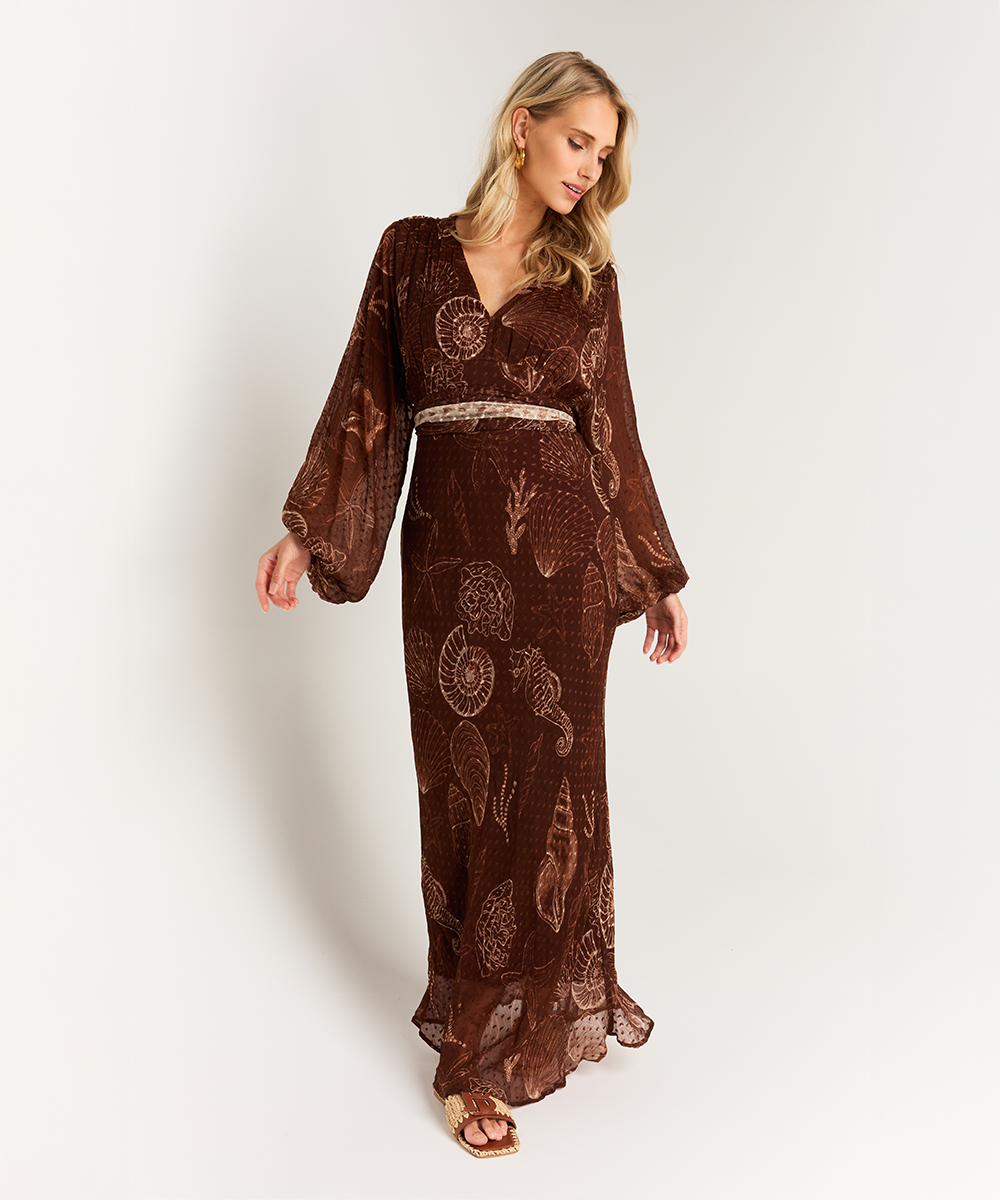 De Danoli Shell jurk in de kleur Shell Maron is een elegante maxi-jurk met een vrouwelijke V-hals en een subtiele getailleerde fit. De jurk is uitgevoerd in non-stretch materiaal en valt soepel, wat zorgt voor een verfijnde en tijdloze uitstraling. De rijke print geeft de jurk karakter en maakt de jurk geschikt voor zowel overdag als avondmomenten. Stylingtip: combineer de Danoli Shell jurk met sandalen of hakken en minimalistische accessoires voor een moeiteloos chique look.
