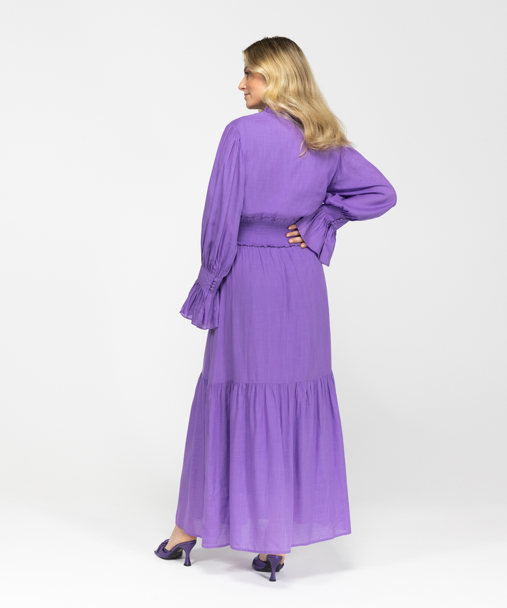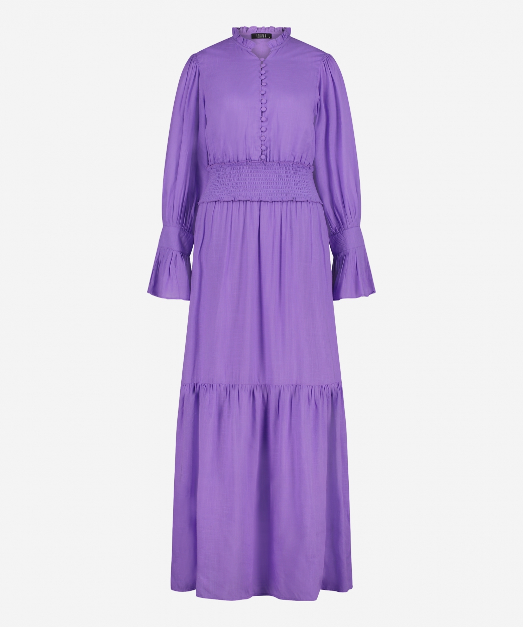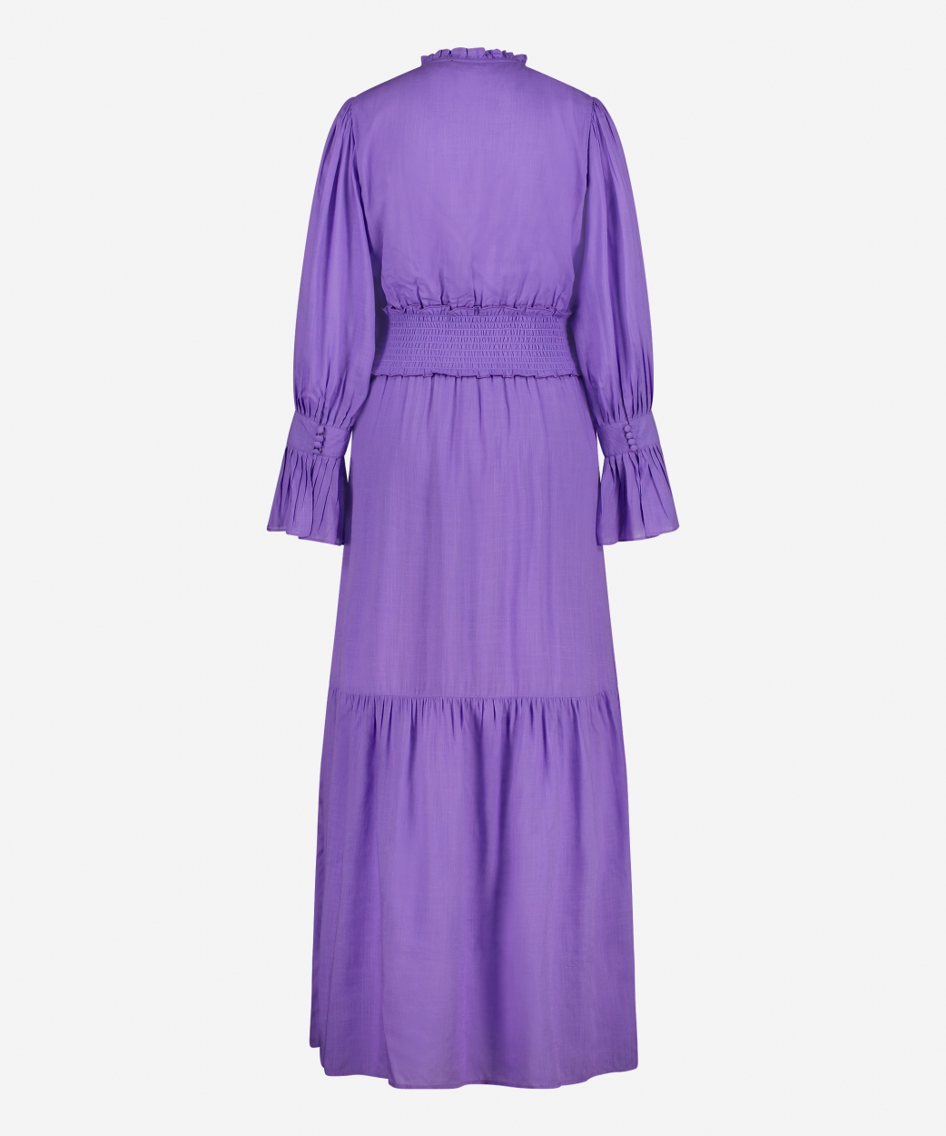 De Darti is een maxi dress die tot de enkels valt. De jurk heeft fijne details zoals de ruches, soepelvallende plooien en de opstaande kraag met een rij knoopjes. Het materiaal viscose zorgt dat de jurk fijn aanvoelt en je er makkelijk in kunt bewegen. De geaccentueerde brede tailleband is gemaakt van stretch materiaal.