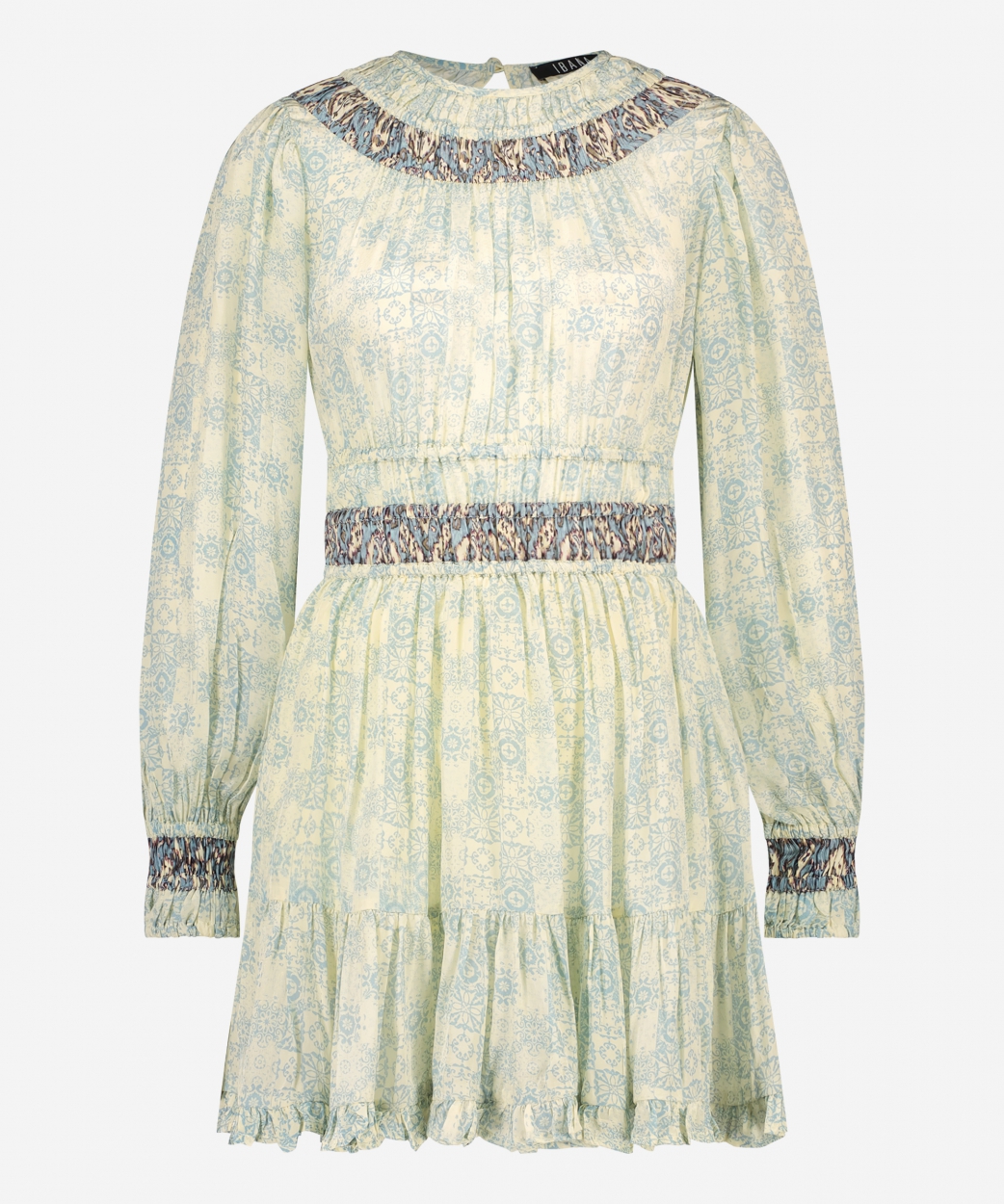 De jurk heeft een ronde hals en valt tot halverwege het bovenbeen. De jurk staat mooi met een paar stoere laarzen eronder maar kan ook met hele elegante muiltjes zoals de Adel worden gedragen. De lichtgroene print is in details afgewisseld met een blauwe bloemenprint wat een speels effect geeft aan de jurk. De jurk is mooi getailleerd en afgewerkt met volant. De pofmouwen maken de jurk on trend en zorgen voor een perfecte zomerse look voor een zonnige dag. De Davina jurk heeft een katoenen voering en een modal buitenlaag wat een paar voordelen met zich meebrengt: de jurk is luchtig, draagbaar en kreukt niet snel.