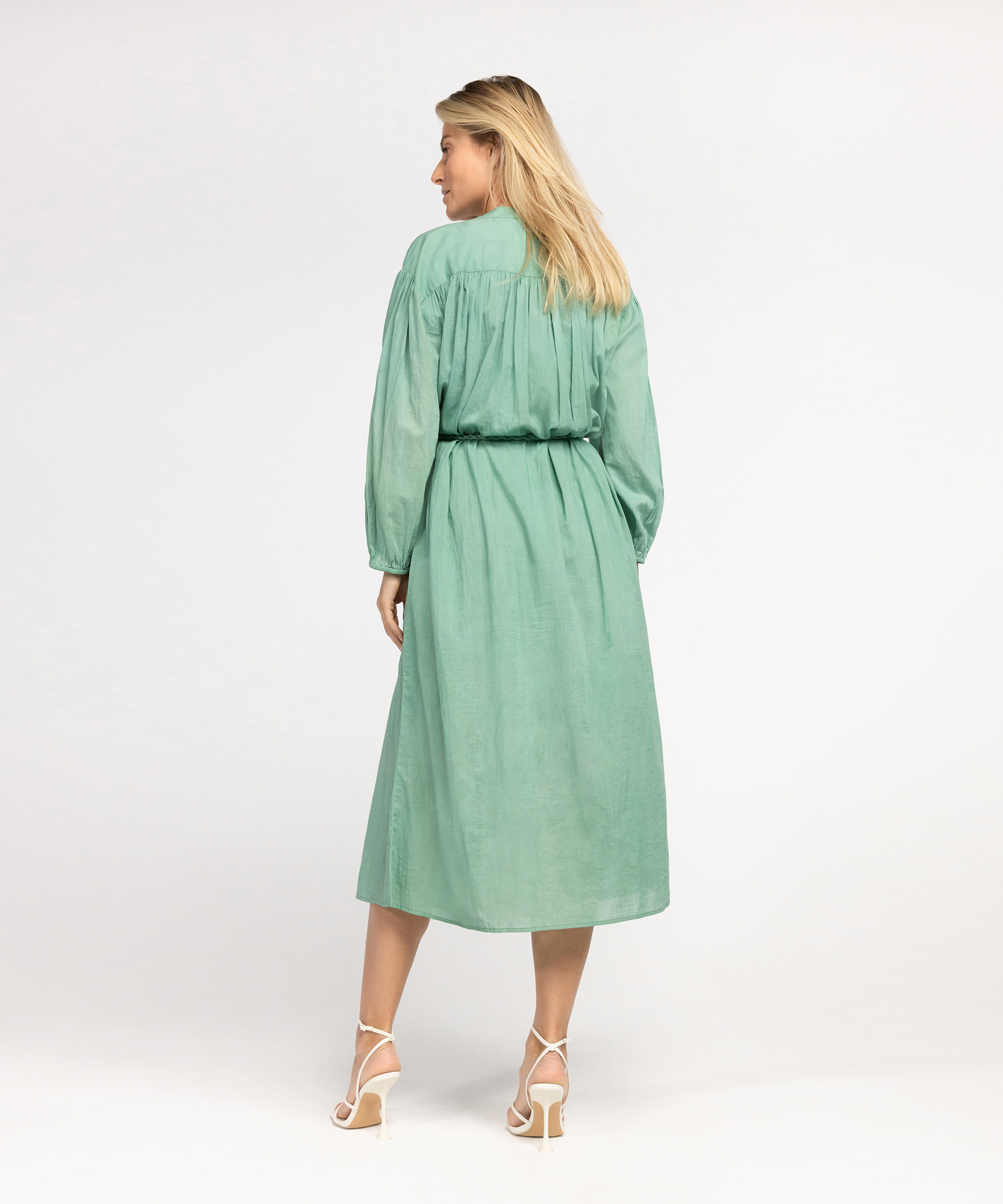 Opzoek naar de Donte jurk in een meer opvallende kleur? We've got you covered! De soepel vallende jurk is getailleerd door een touw in dezelfde kleur als de jurk, is helemaal doorgeknoopt en heeft een opstaand hoog gesloten kraag. Vanwege het feit dat de jurk van 100% katoen is gemaakt is deze bijzonder luchtig en comfortabel. De lengte is tot onder de knie. Stylingtip: Combineer de Donte jurk met sneakers voor een sportieve look of open schoenen zoals de Adel in Jade Green of in Almond White voor een meer elegante look. De Donte jurk is ook beschikbaar in Almond White.