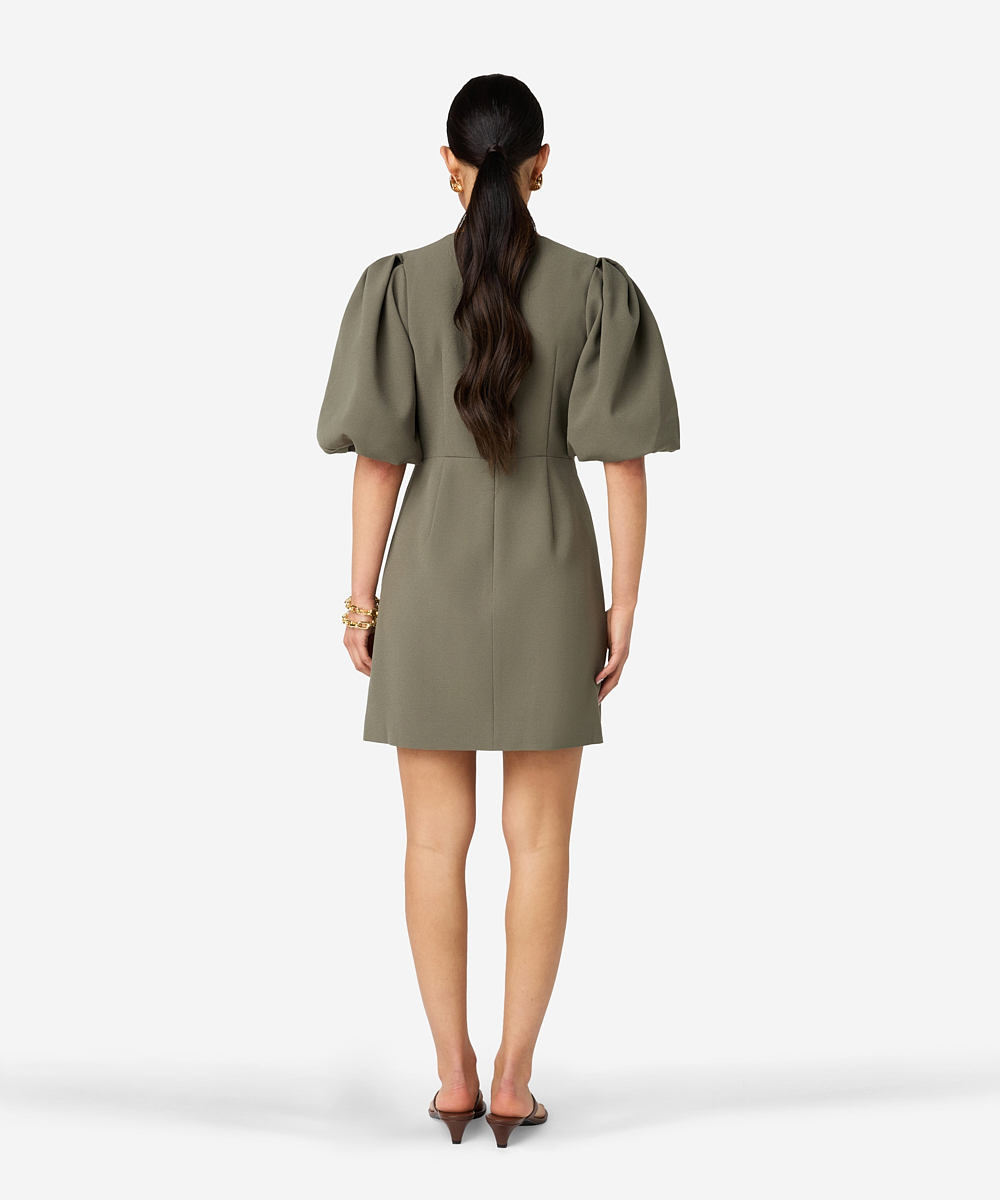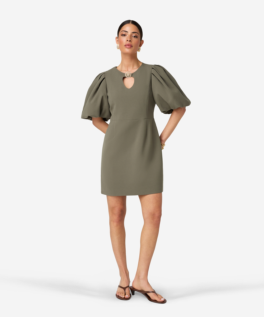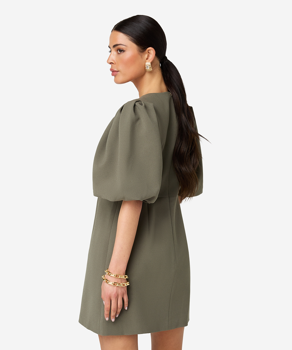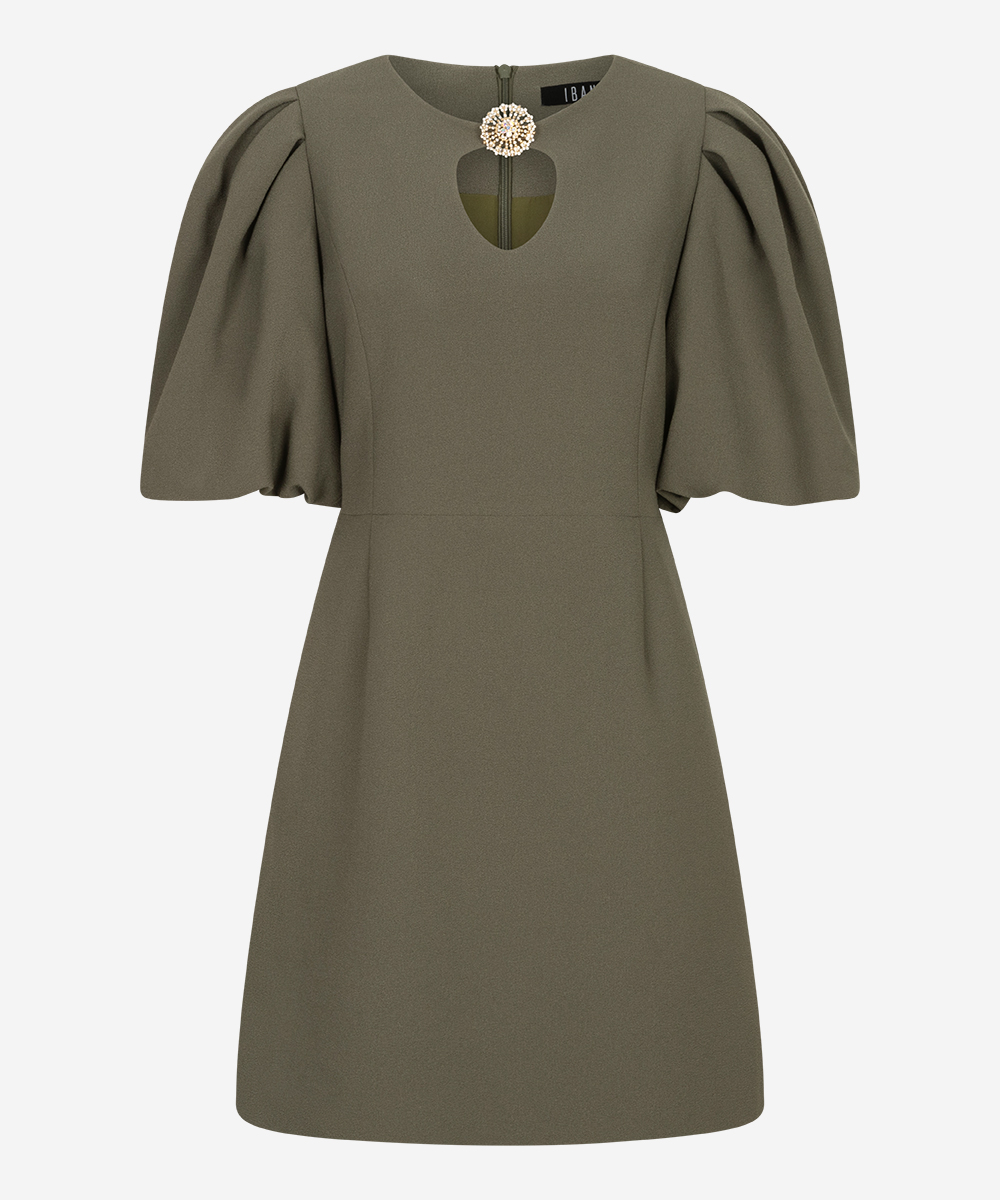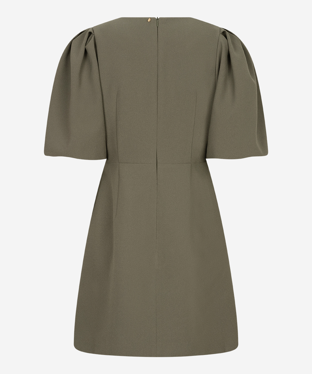 De Dura dress in Olive Green is een elegante A-lijn jurk met een ronde hals en een mooi stras-detail bij de hals. De pofmouwen geven een vrouwelijke touch, terwijl de rechte ritssluiting op de rug zorgt voor een mooie pasvorm. Deze non-stretch jurk is perfect voor bruiloften of andere speciale gelegenheden waar je stijlvol voor de dag wilt komen.