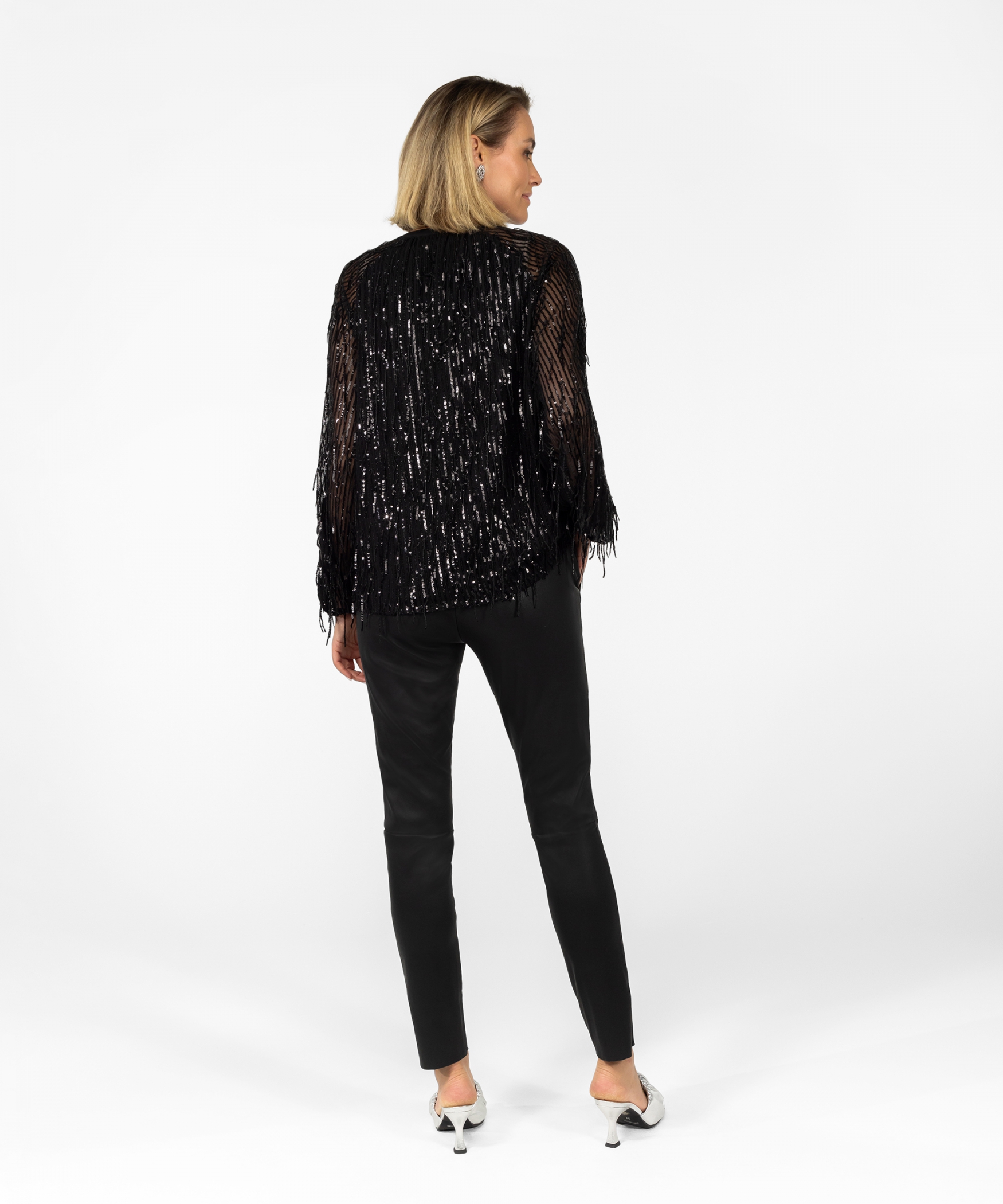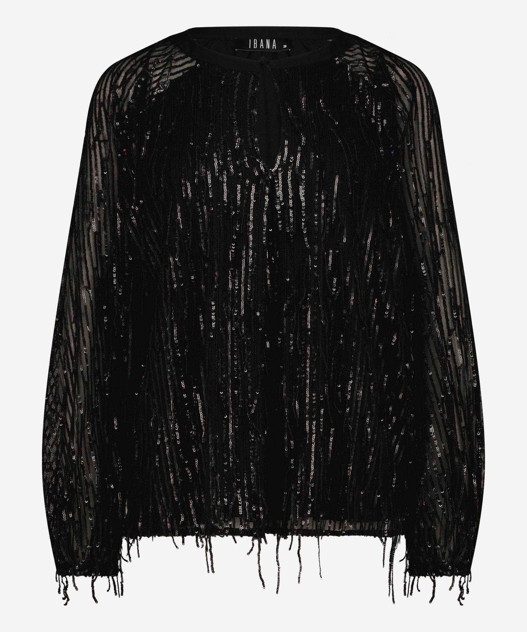 Maak kennis met de Folette Fringes blouse in de kleur black. Deze paillettenblouse is een ware blikvanger. De blouse omvat een elegante ronde hals met een subtiele, vrouwelijke touch dankzij een kleine, ronde opening. Dit model heeft een losvallende pasvorm en de licht doorschijnende, lange mouwen geven net wat extra's. Deze blouse is perfect met een pantalon of een rok voor een chique look, terwijl het ook met een jeans een meer ontspannen, casual look cre�ert.