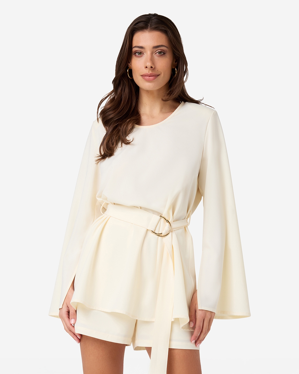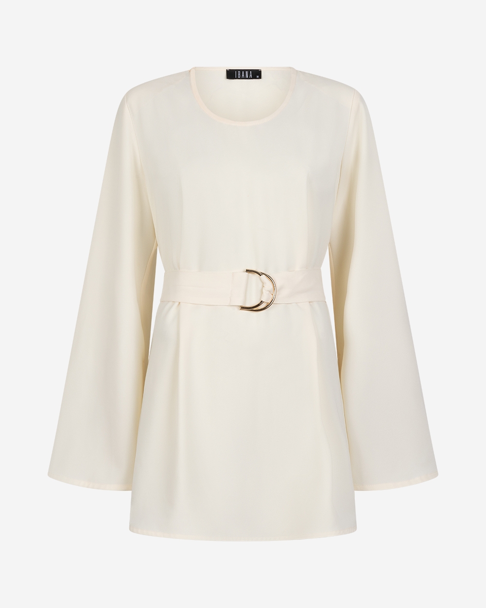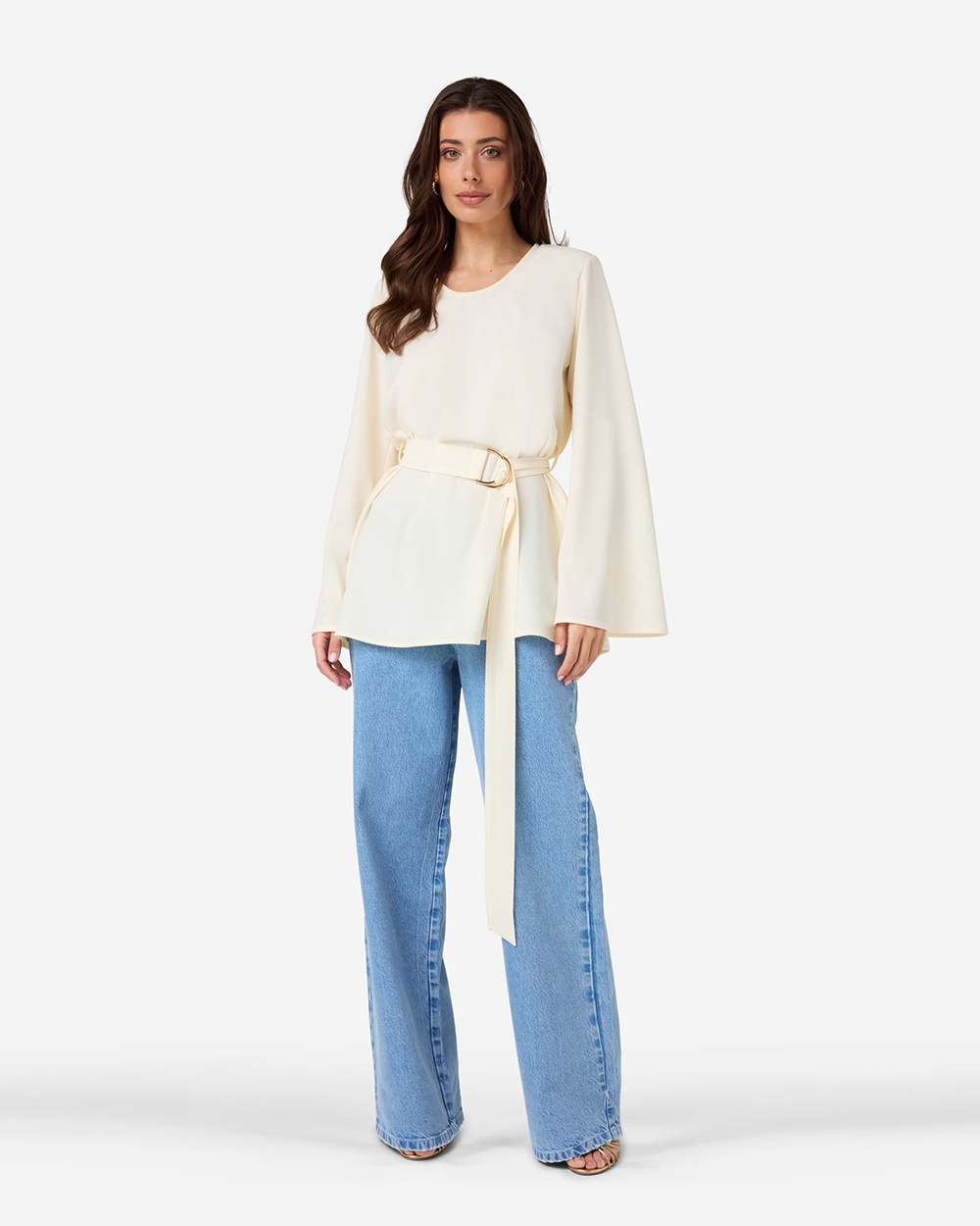 Meet Franky! Deze Off-White top met ronde hals en vleermuismouwen heeft een relaxte fit én een bijpassende ceintuur met lichtgouden gesp. Dat maakt de top net even anders dan anders! De top is voorzien van schoudervullingen welke gemakkelijk eruit te halen zijn door middel van drukknoopjes. Draag de Franky met de bijpassende Maasy Shorts voor een zomerse co-ord look of combineer met de Hailey Jeans voor een casual vibe.