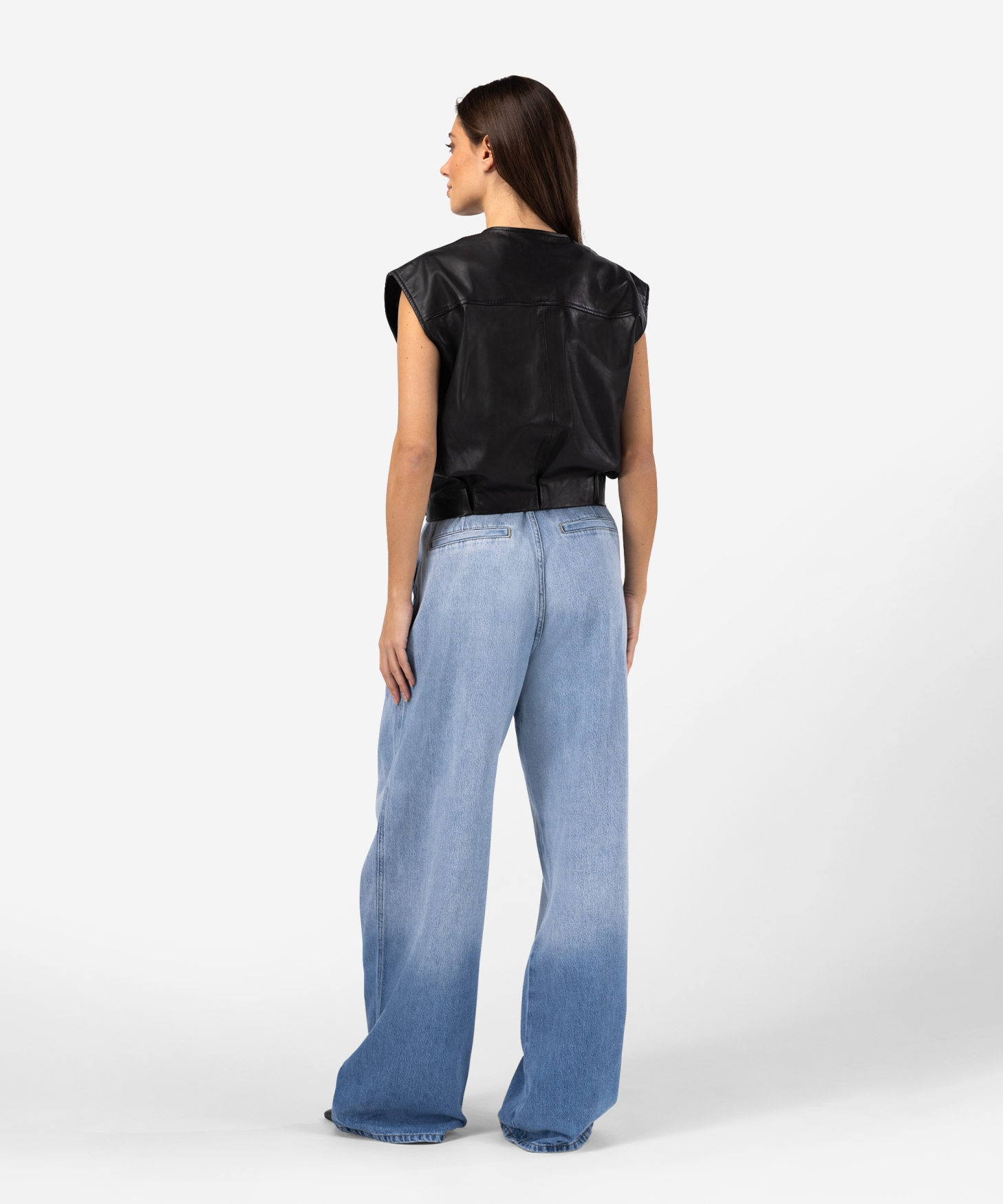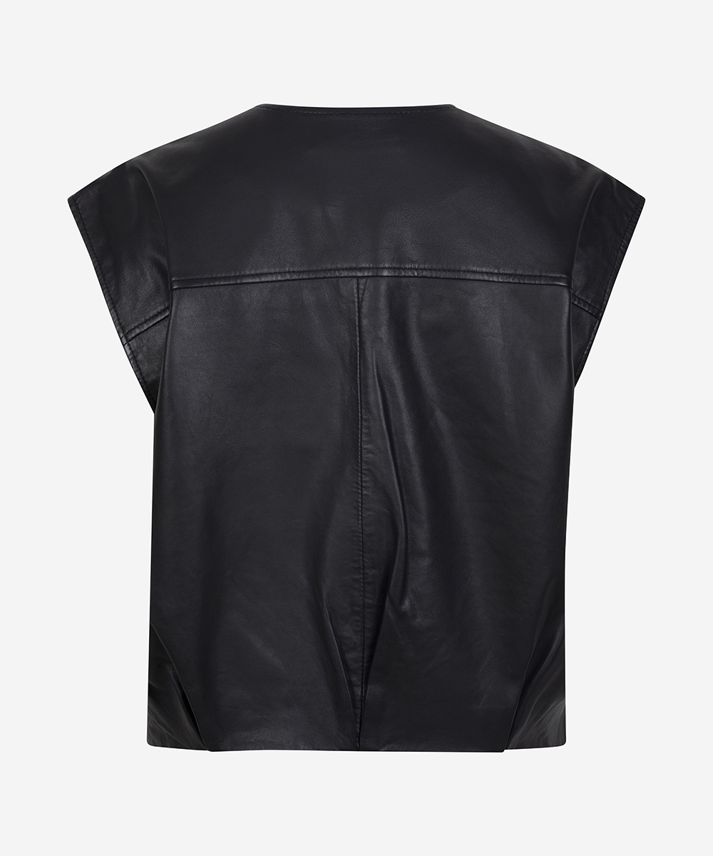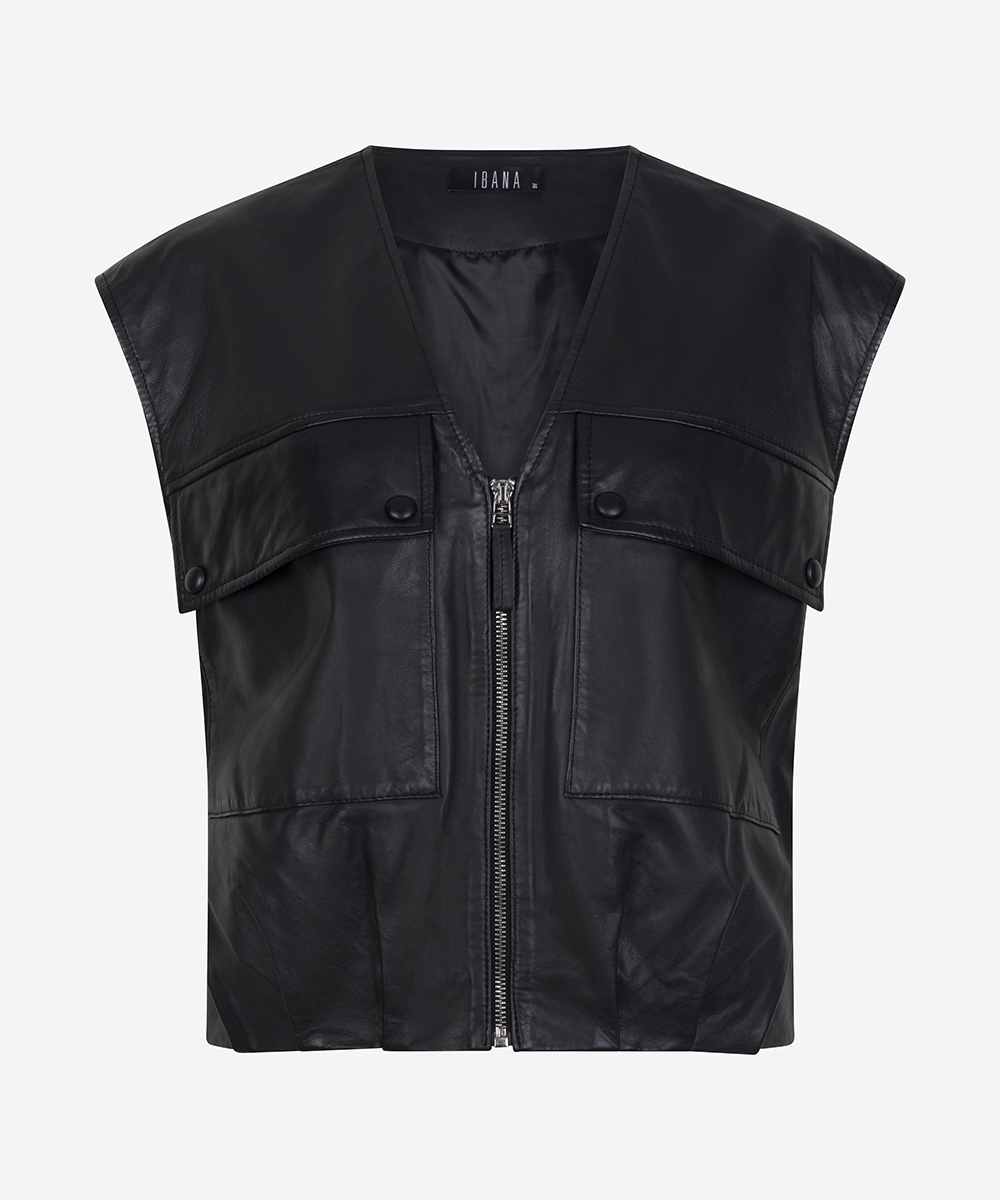 Eye-catching alert! Dit is het Gigi Gilet in de kleur Black. Dit gilet is gemaakt van hoogwaardig non-stretch kwaliteitsleer en maakt jouw outfit net wat stoerder. Het gilet heeft een V-hals, een zilveren rits en het gilet heeft twee klepzakken aan de voorzijde. Aan de achterkant bevinden zich er een aantal plooien waardoor de Gigi een speels boxy-effect krijgt. Combineer het gilet net als het model met de Pristina Jeans.| Buitenzakken: | 2 borstzakken |