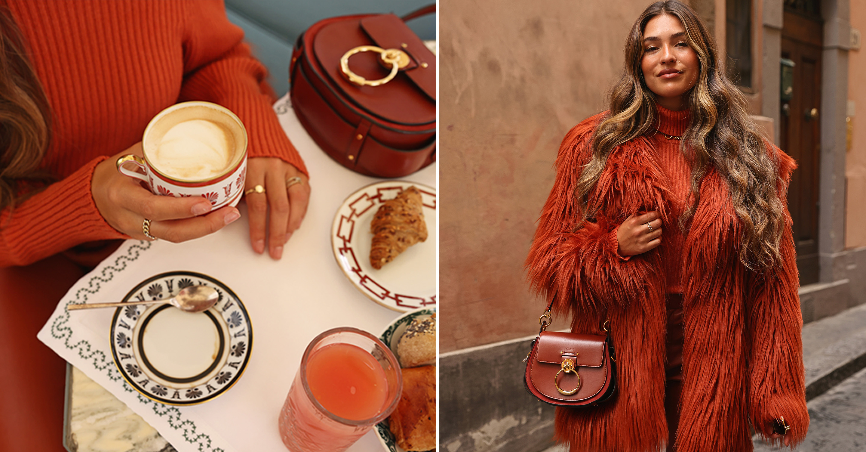 We zijn aangekomen in Florence. Met een heerlijk ontbijtje in de zon, beginnen we deze dag. Isaya draagt onze eye-catching Candy coat met de matching Tandra top en Paula pants in Terracotta.
