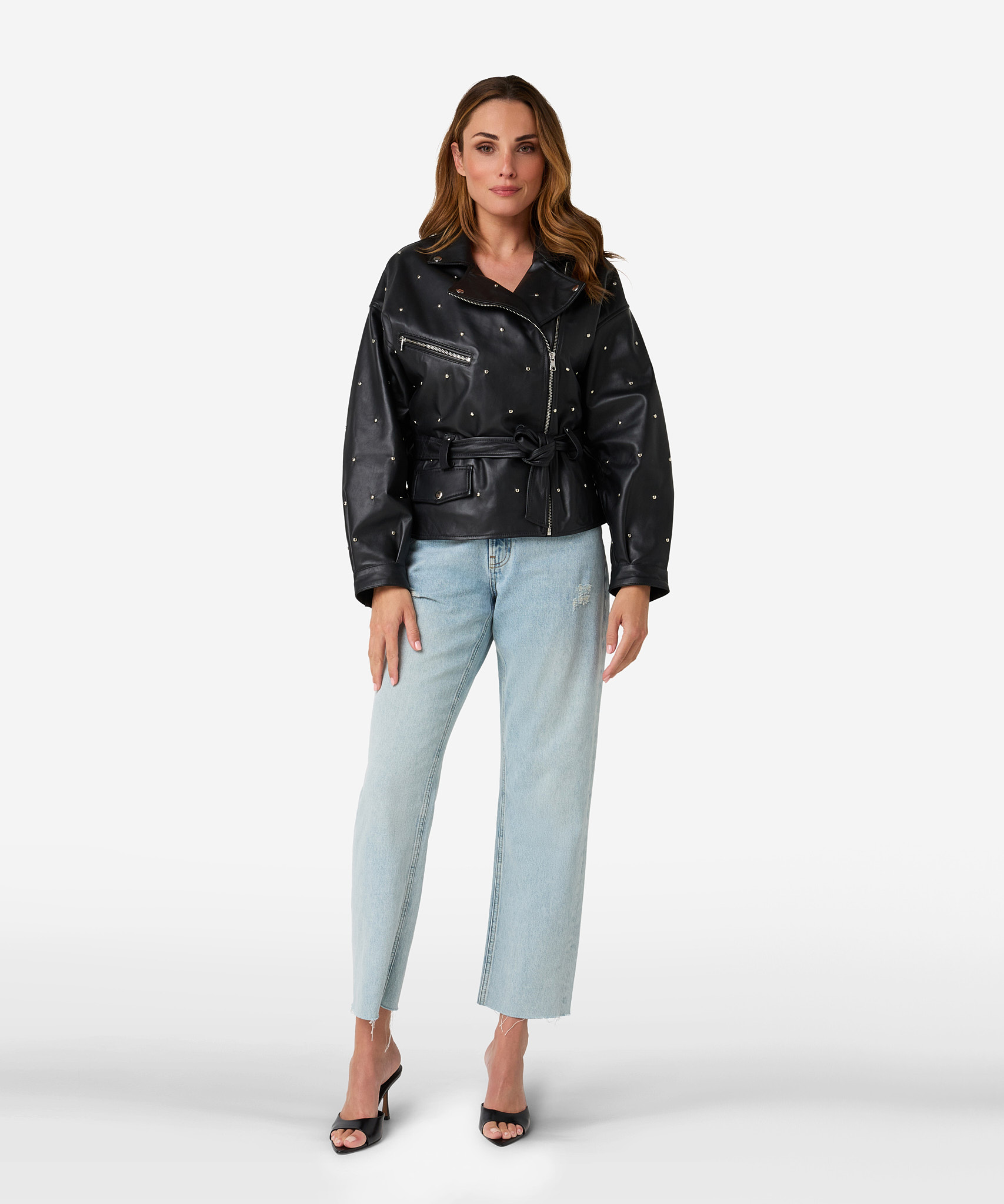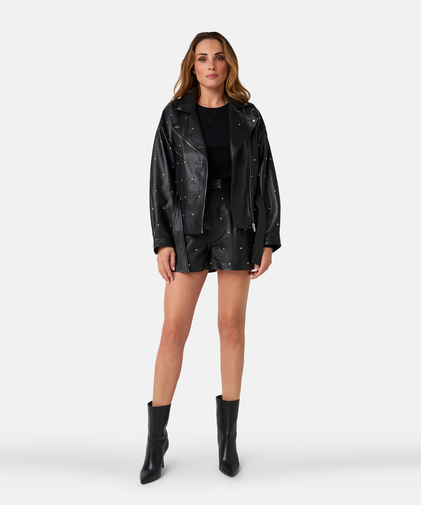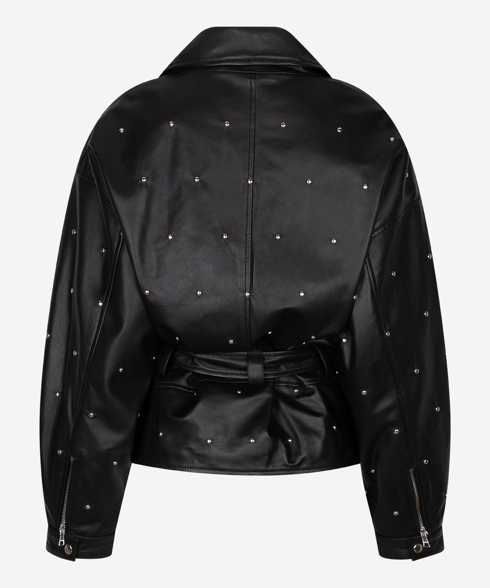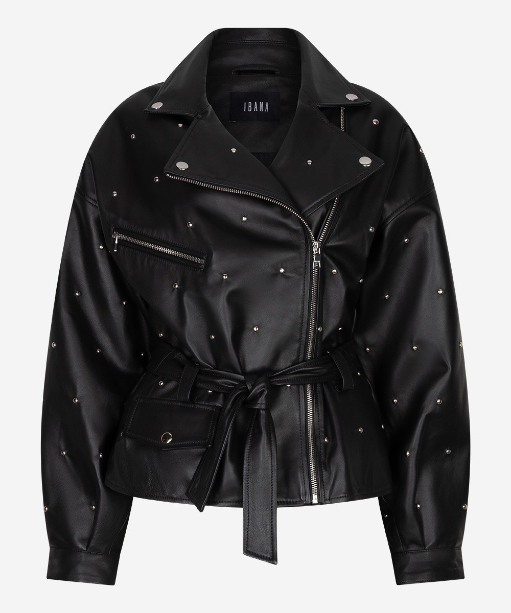 De Jaffron studs jacket in zwart is een leren statement item met een wijde boxy fit en stoere uitstraling. Het jack is non-stretch, voorzien van meerdere zakken en wordt geleverd met een ceintuur om de taille elegant te accentueren. Combineer met de bijpassende Sicily shorts of draag het casual met een jeans zoals de Phelan.