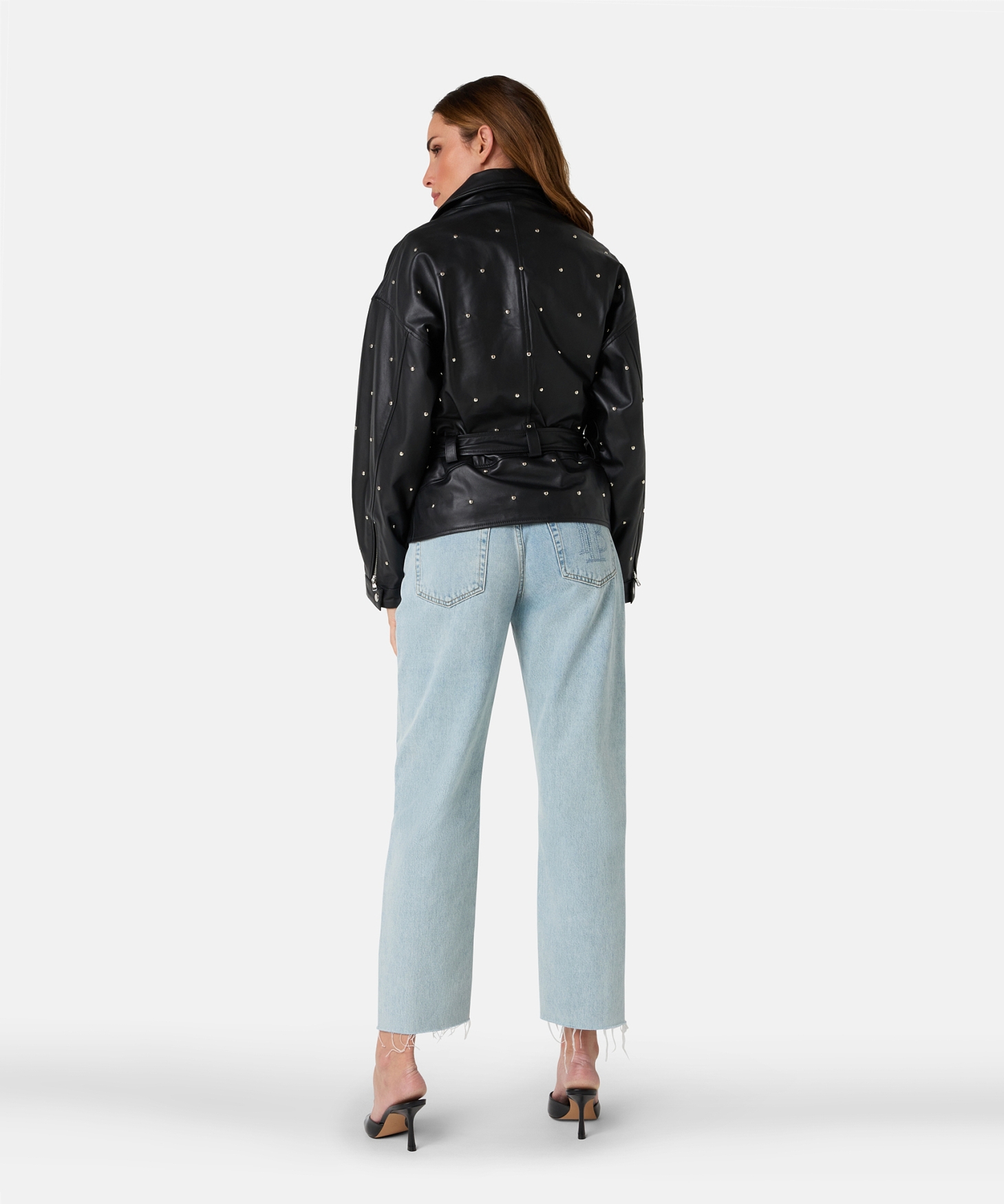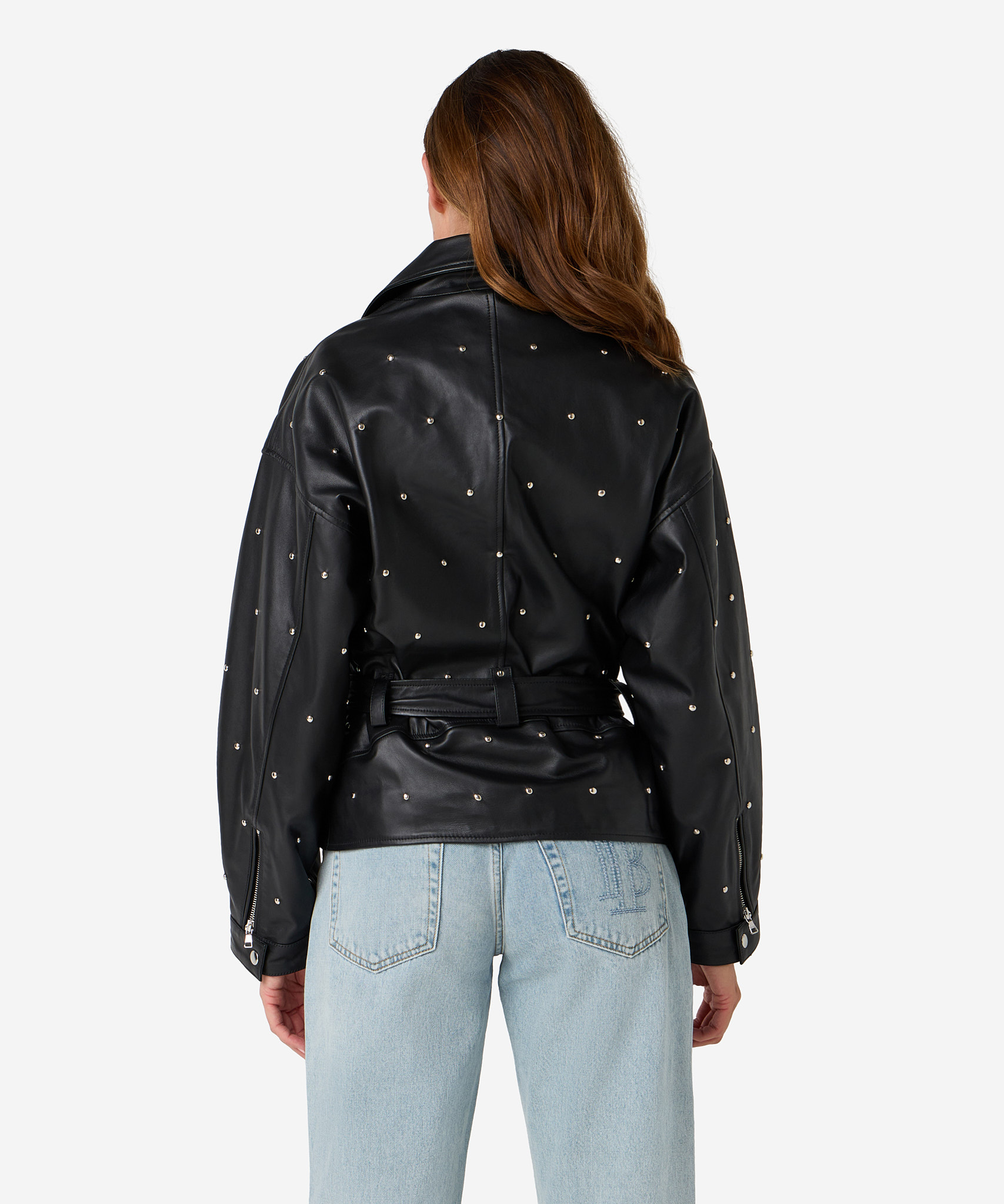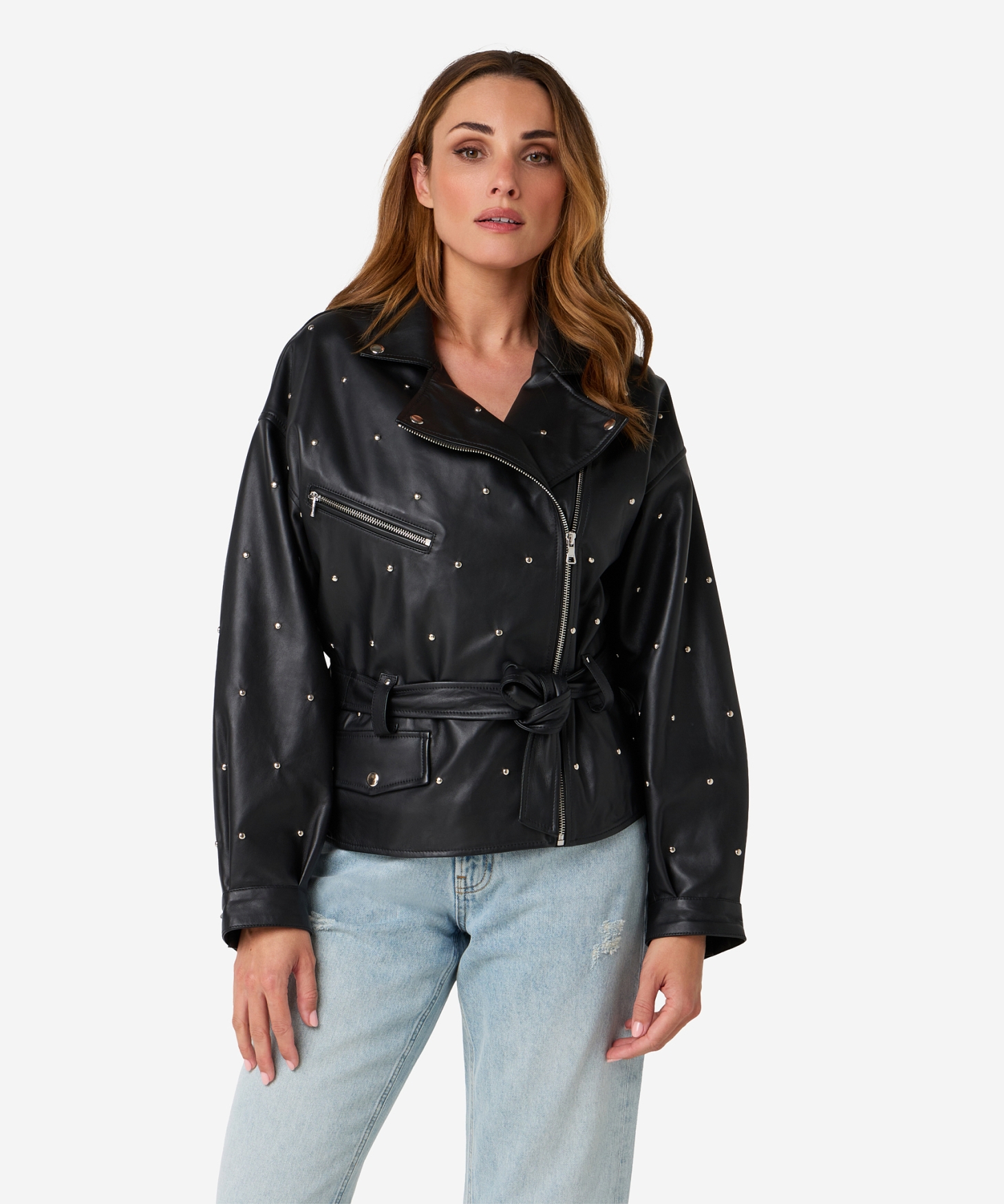 De Jaffron studs jacket in zwart is een leren statement item met een wijde boxy fit en stoere uitstraling. Het jack is non-stretch, voorzien van meerdere zakken en wordt geleverd met een ceintuur om de taille elegant te accentueren. Combineer met de bijpassende Sicily shorts of draag het casual met een jeans zoals de Phelan.