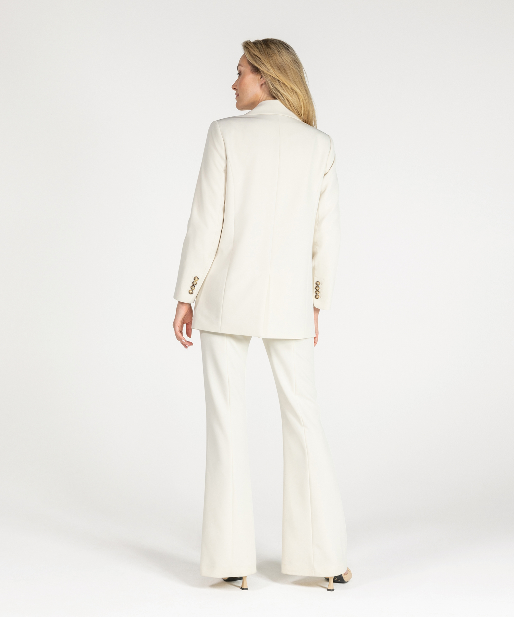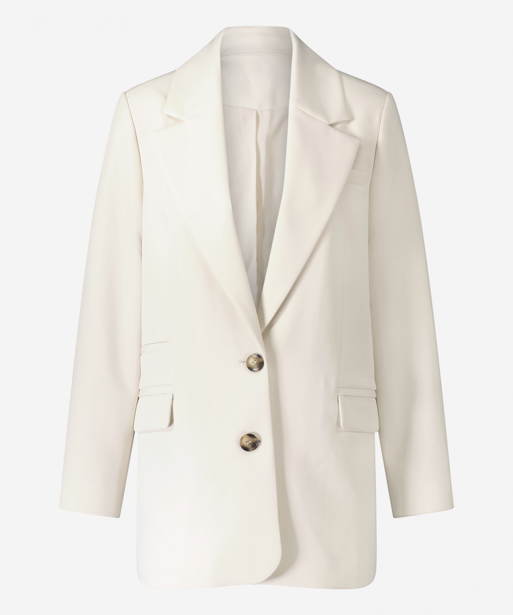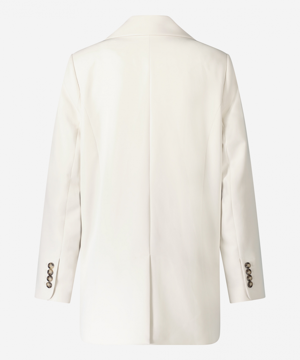 Met de Jaivy blazer in de kleur Creamy White ben jij helemaal on trend. De blazer is voorzien van een reverskraag en heeft een sluiting met twee knopen. Daarnaast heeft de blazer aan de voorzijde twee klepzakken met links boven op de borst en rechts onder een paspelzak. De achterzijde is voorzien van een split en de lange mouwen zijn aan de onderzijde afgewerkt met 4 knopen onder elkaar. De Jaivy blazer vormt een set samen met Priya pantalon in de kleur Creamy White. Dit pak is multi inzetbaar, leent zich perfect voor zakelijke gelegenheden maar kan ook goed sportief worden gedragen met een sportschoen en coltrui onder de blazer. ��n van onze favoriete items dit seizoen!Buitenzakken: | Twee zijzakken |