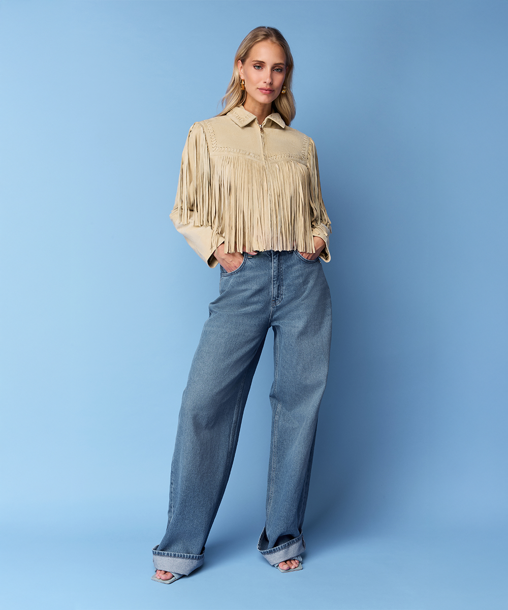 De Jeeya jacket in de kleur Manteca Yellow is een echte statement piece met een speelse western touch. Dit leren jasje heeft een kraag, een regular fit en is afgewerkt met opvallende franjes. De non-stretch kwaliteit zorgt voor een gestructureerde look. Combineer de Jeeya jacket met de Phelan jeans.
