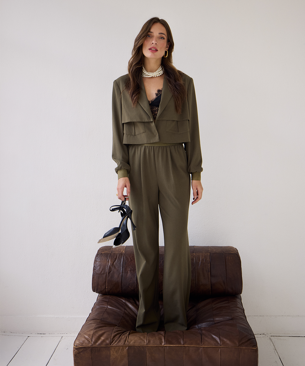De Jayge blazer in Dark Elm Green is een korte, rechtvallende blazer met een moderne, gestructureerde look. De subtiele schoudervullingen en klepzakken aan de voorkant geven het item een elegante, tijdloze uitstraling, terwijl het elastiek aan de mouwuiteindes zorgt voor een eigentijdse twist. Stylingtip: draag de Jayge als co-ord set met de bijpassende Paige broek voor een krachtige, ton-sur-ton look of combineer met je favoriete jeans voor een meer casual maar stijlvolle outfit.| Buitenzakken: | Twee steekzakken |