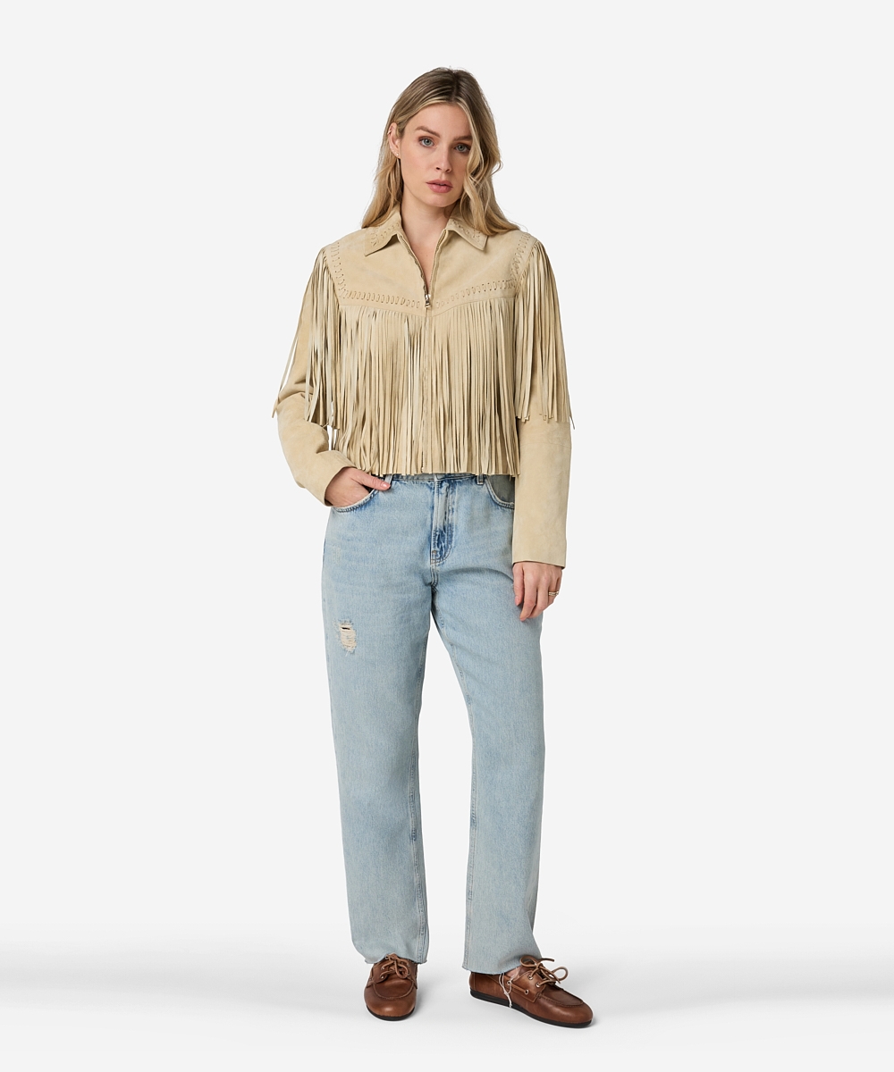 De Jeeya jacket in de kleur Manteca Yellow is een echte statement piece met een speelse western touch. Dit leren jasje heeft een kraag, een regular fit en is afgewerkt met opvallende franjes. De non-stretch kwaliteit zorgt voor een gestructureerde look. Combineer de Jeeya jacket met de Phelan jeans