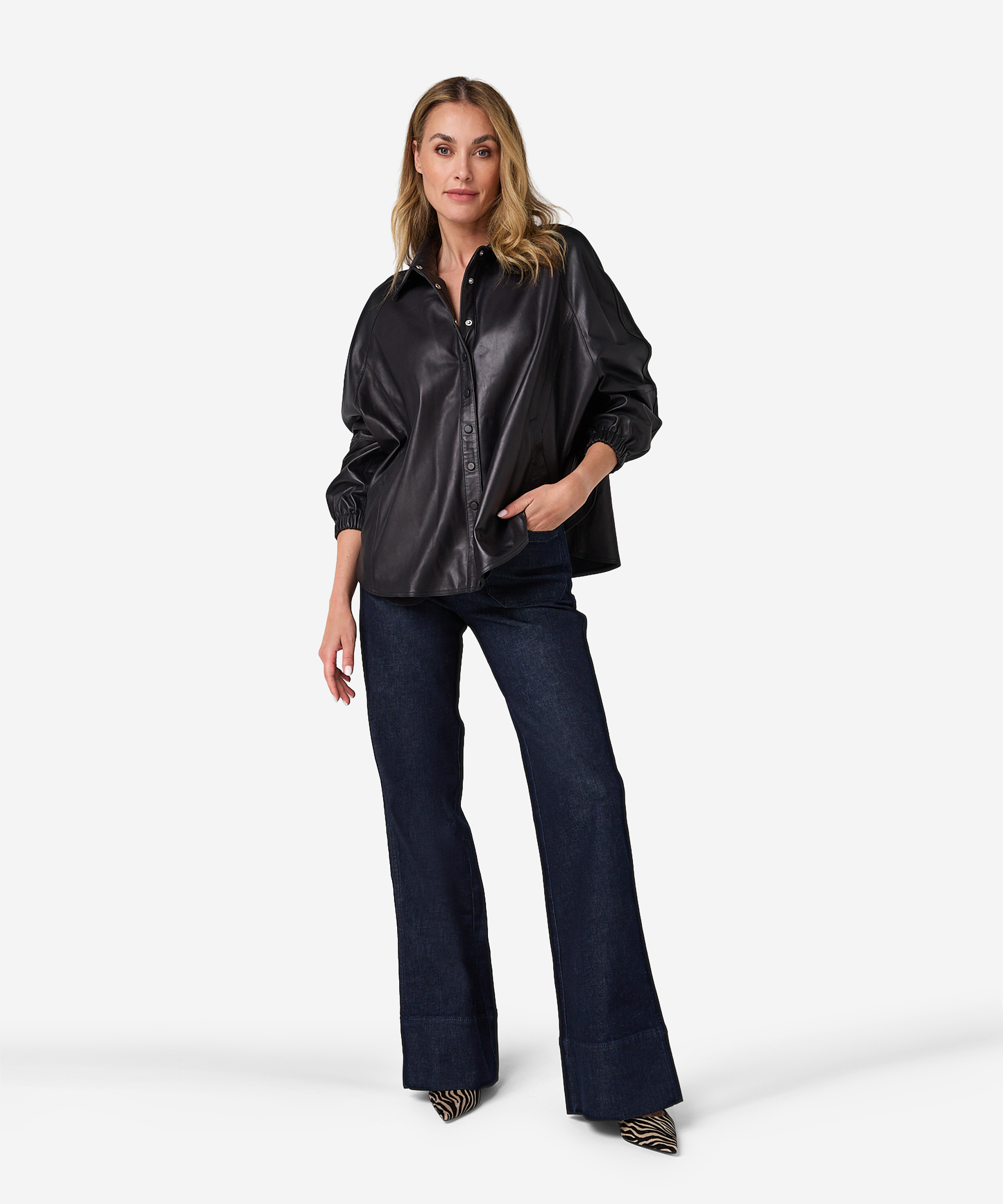 De Jessie jacket in Black is een leren jas met wijde pasvorm en drukknoopsluiting. De elastieke mouwuiteinden zorgen voor een speels silhouet, terwijl het leer een stoere touch geeft. Stylingtip: Combineer de Jessie jacket Black met de Penda pants in Dark Denim om een donkere, wat stoerdere look te creëren.