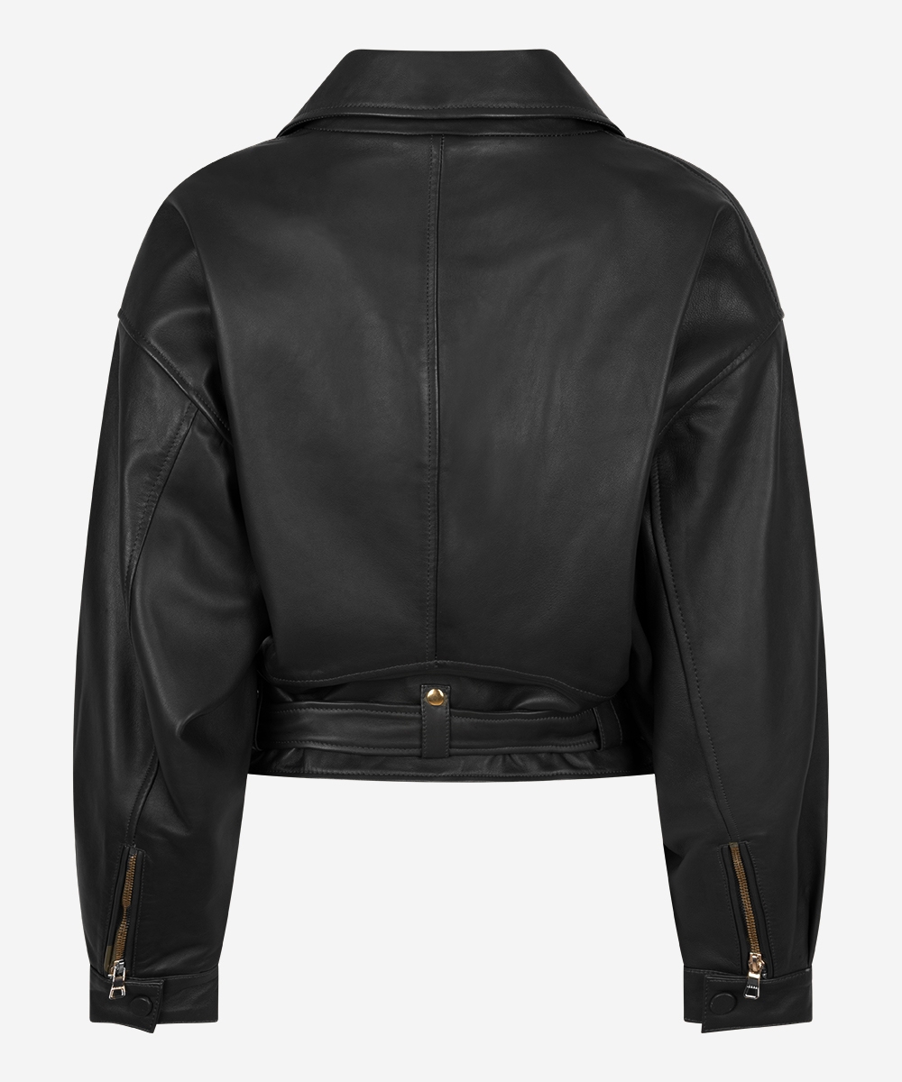 De Jonet jacket in de kleur black is een hoogwaardig kwaliteitsleren jas met wijde fit en openstaande kraag. Het jack is volledig gevoerd, heeft twee zijzakken en voelt luxe aan door het zachte leer. Dankzij de non-stretch kwaliteit blijft de pasvorm elegant en vrouwelijk.Buitenzakken: | Twee zijzakken |