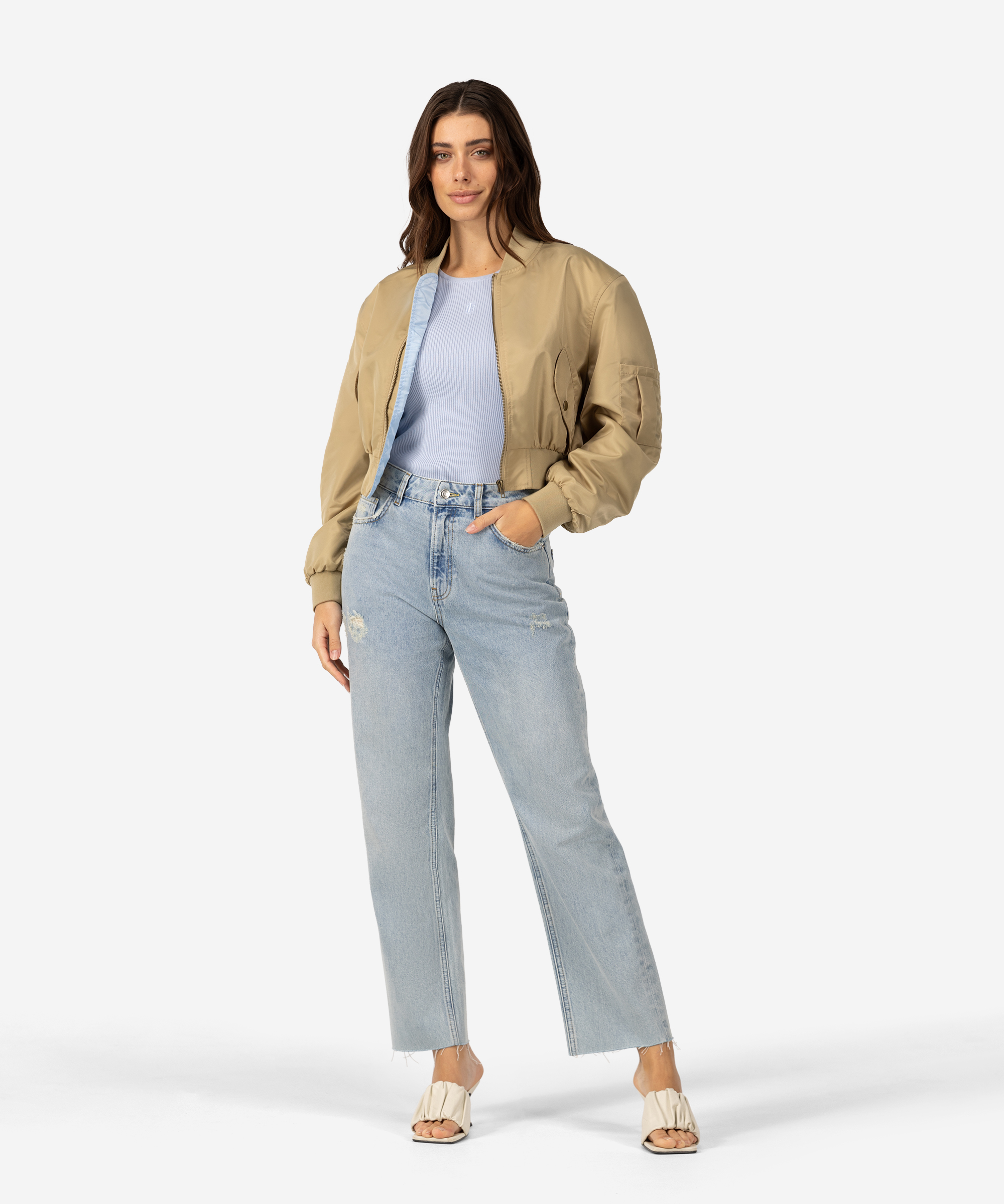 Maak kennis met onze best-selling Joseph Jacket in de kleur Soldato. Deze cropped en 100% Nylon bomberjas heeft lichte schoudervullingen en heeft aan de voorkant twee zakken met drukknopen. De elastieken tailleband en mouwuiteinden zorgen voor een boxy en speels effect. De Joseph is een echte musthave voor jouw garderobe want dit jasje kan het hele jaar door gedragen worden! Het model op de foto heeft de bomber gecombineerd met de blauwe Tamora Top en Phelan Jeans.Buitenzakken: | Twee zijzakken |