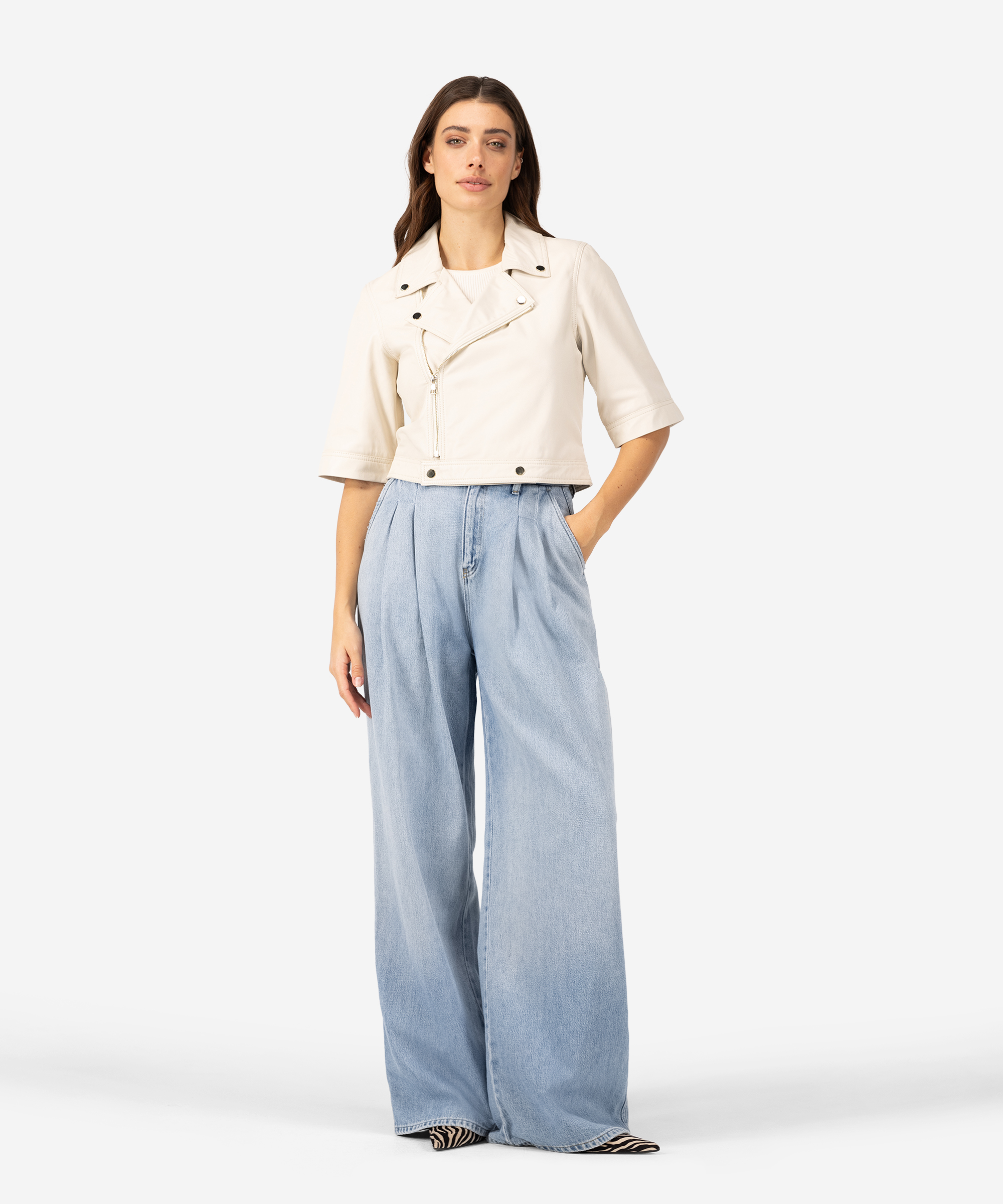 Het Juliana jasje in de kleur Blanco is een fashionable leren biker jasje met korte mouwen. Dit unieke en stijlvolle jasje heeft een cropped boxy-fit model met een assymetrische rits. De Juliana is gemakkelijk te combineren, je draagt hem net als het model op de foto superleuk met onze Pristina Jeans en witte Tamora Top.