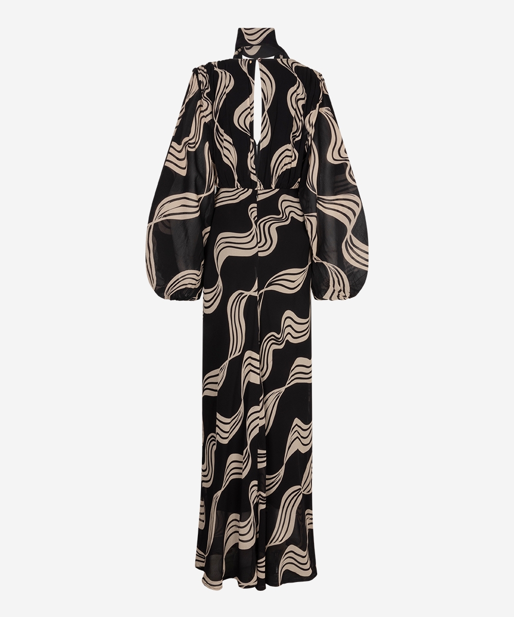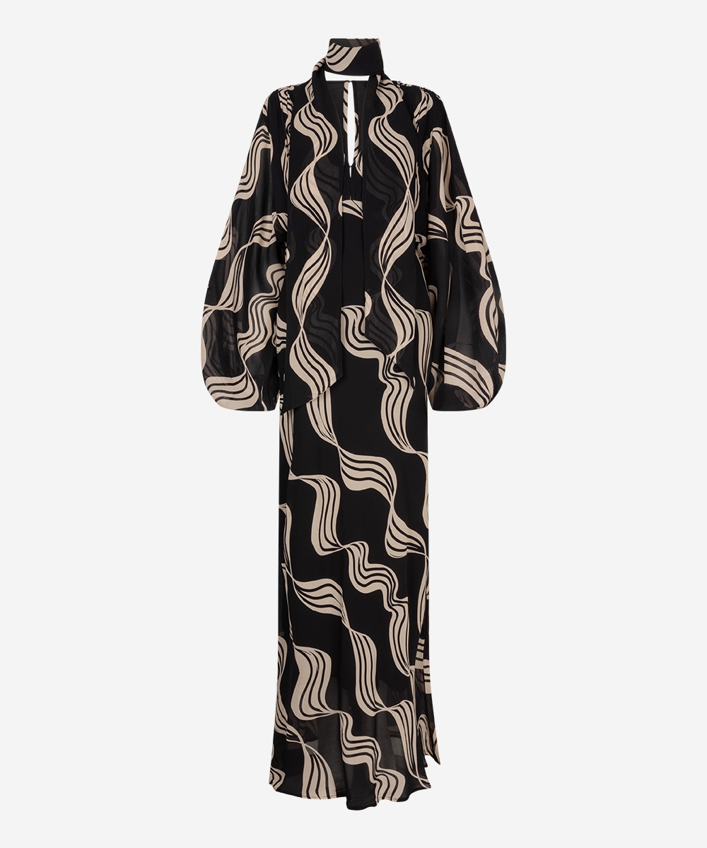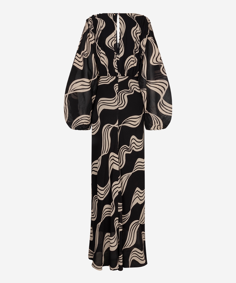 De Danoli Waves dress in de Dune Waves print heeft een V-hals en een wijde pasvorm met een getailleerd silhouet. De jurk is gemaakt van 100% viscose en heeft een non-stretch kwaliteit. De lange mouwen geven de jurk een elegante uitstraling en bij de jurk hoort een klein sjaaltje in dezelfde print. Draag de jurk met een slippertje voor een zomerse dag of met een haklaarsje wanneer het wat kouder is.