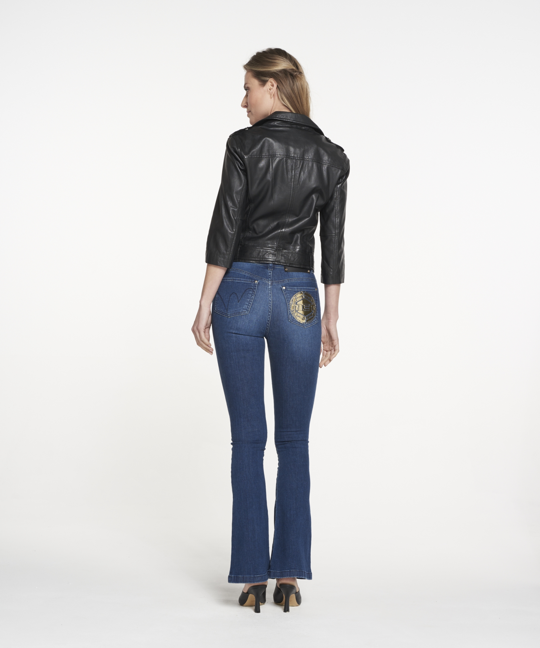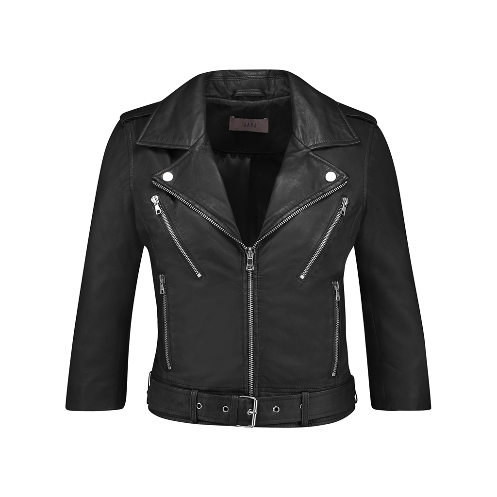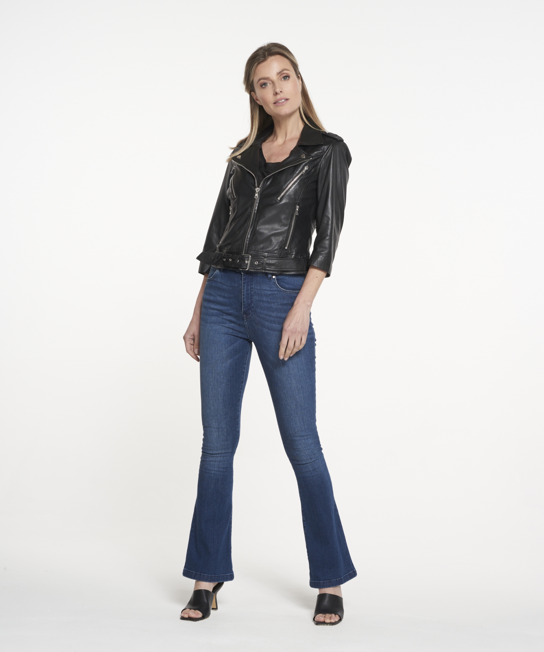 De Kate Moss biker jas is een iconisch kledingstuk dat een edgy en stoere uitstraling geeft. Met zijn aansluitende pasvorm, revers kraag, vier steekzakken met rits, driekwart mouwen en schuine rits op het voorpand, is deze jas een tijdloze must-have voor wie op zoek is naar een rebelse en modieuze stijl. De jas is ideaal voor de koudere dagen om binnen te dragen of in de zomer als buiten jas.