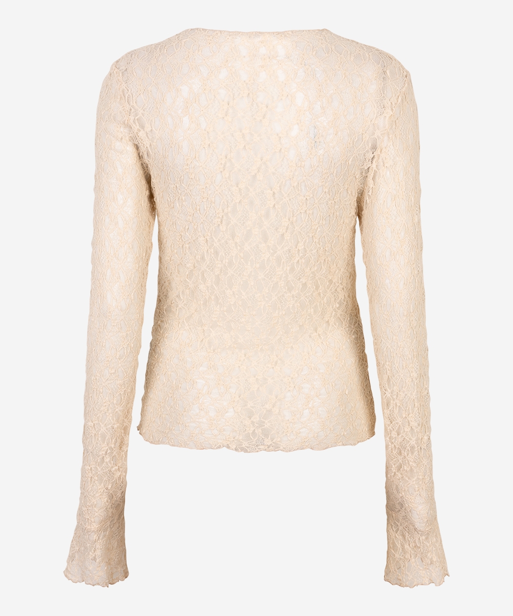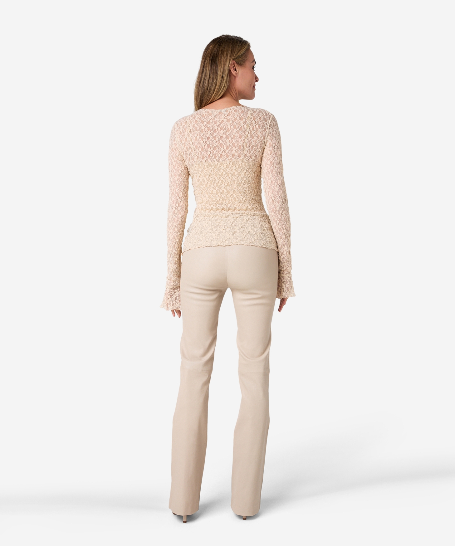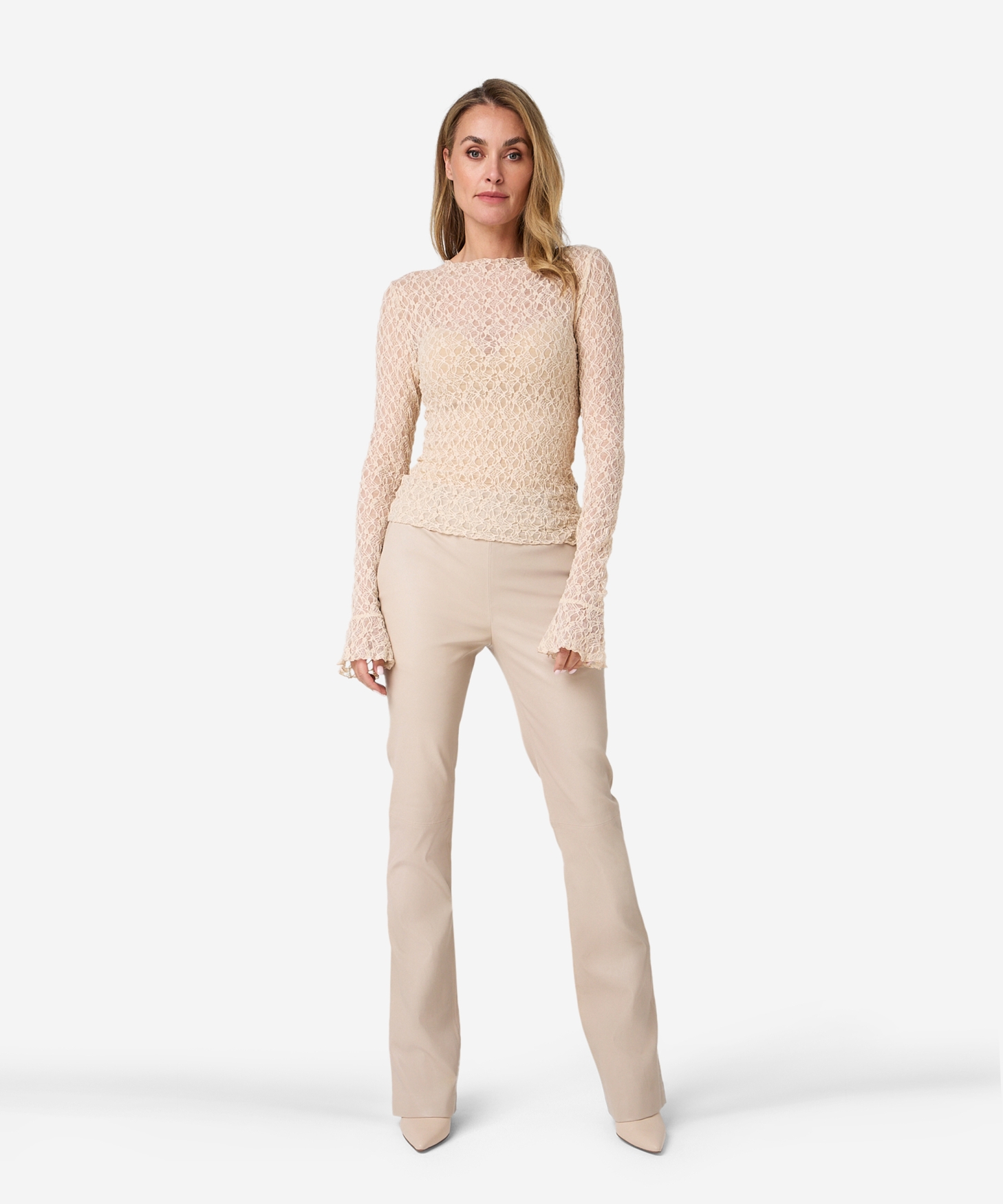 De Taola top in Buttercream is een luchtige, transparante top met ronde hals en elegante trompetmouwen. Deze aansluitende fit is gemaakt van een rekbare nylonmix en laat zich prachtig combineren in zachte tinten. Stylingtip: Draag onder deze doorschijnende top de beige Eden top.| Categorie: | Tops en Truien |