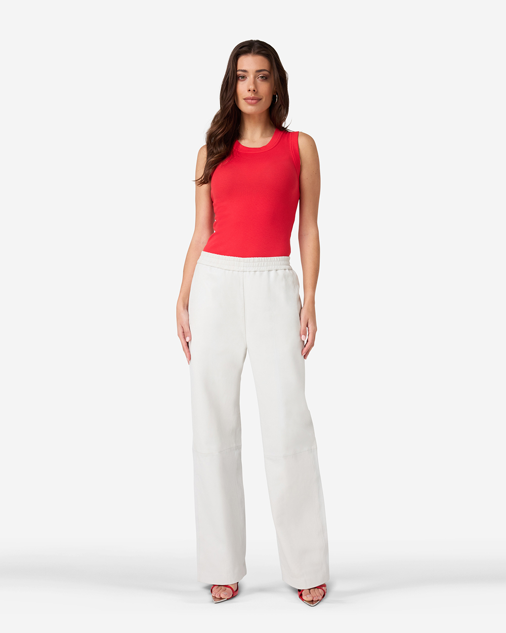 De Miley Pants in Bounty White is een wijde leren broek met een mid waist fit en non-stretch materiaal. De binnenbeenlengte van 83 cm maakt de broek ideaal voor een elegante, lange look. Combineer de broek met de rode Indy Top voor een frisse, moderne outfit die perfect in balans is.