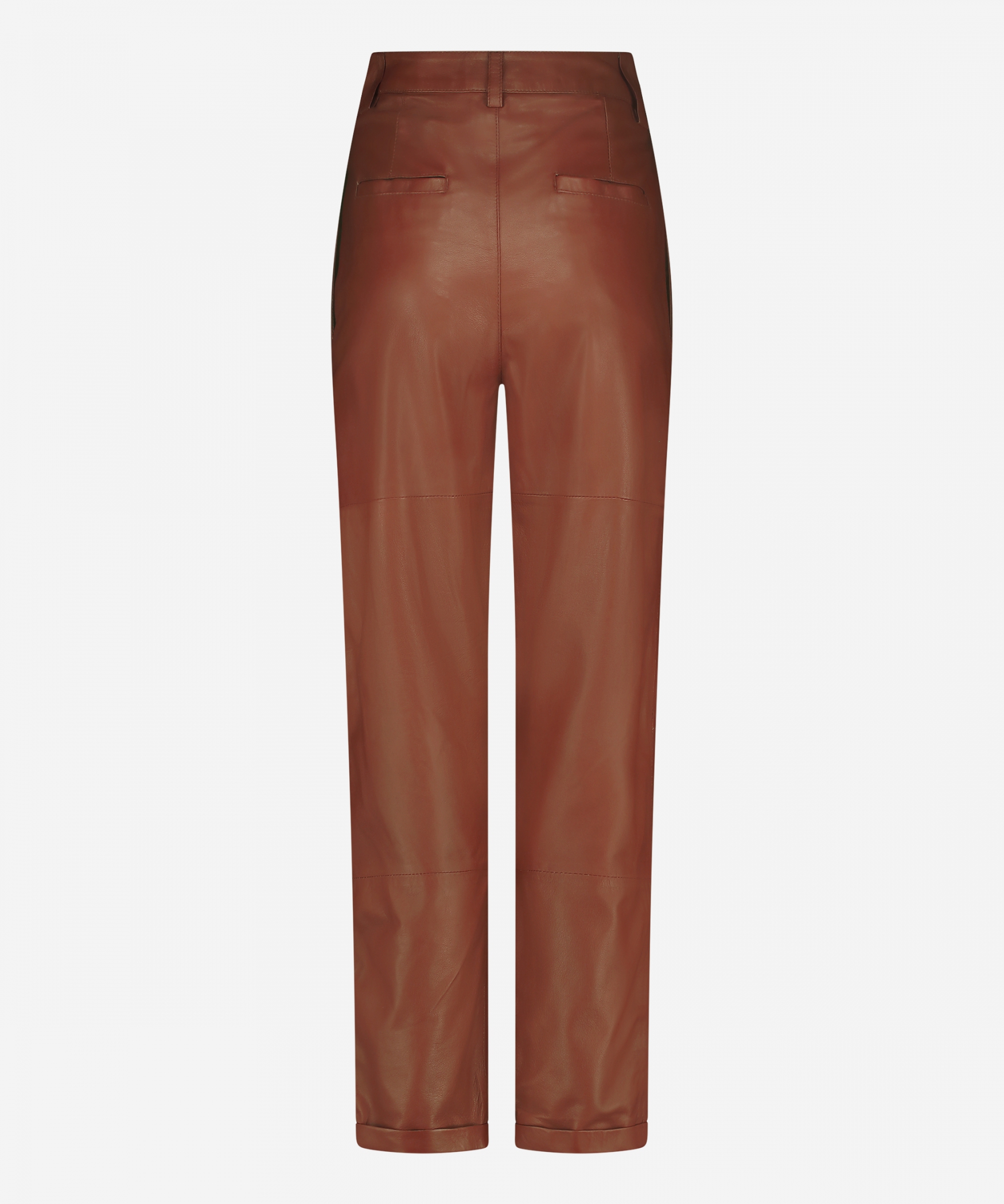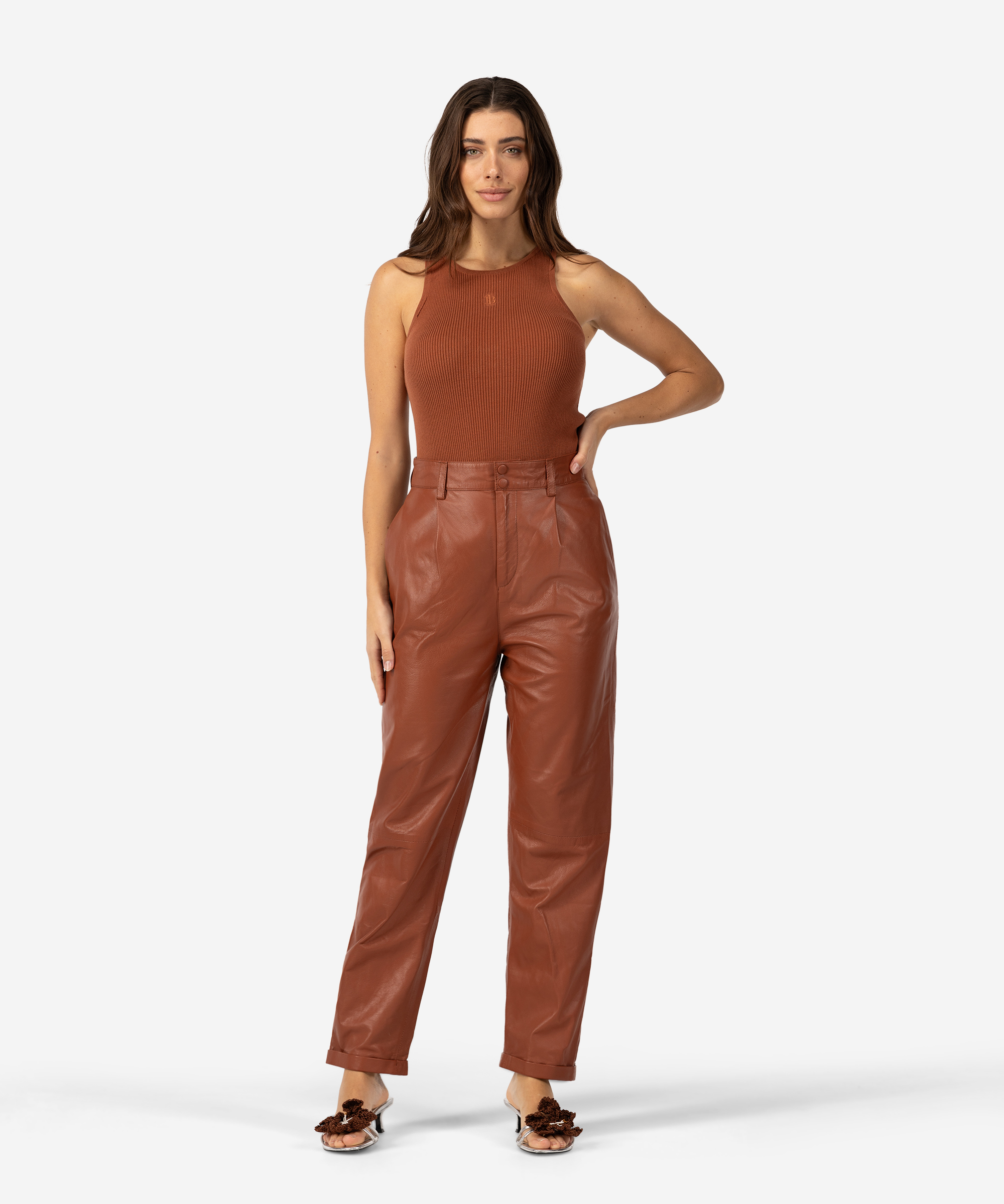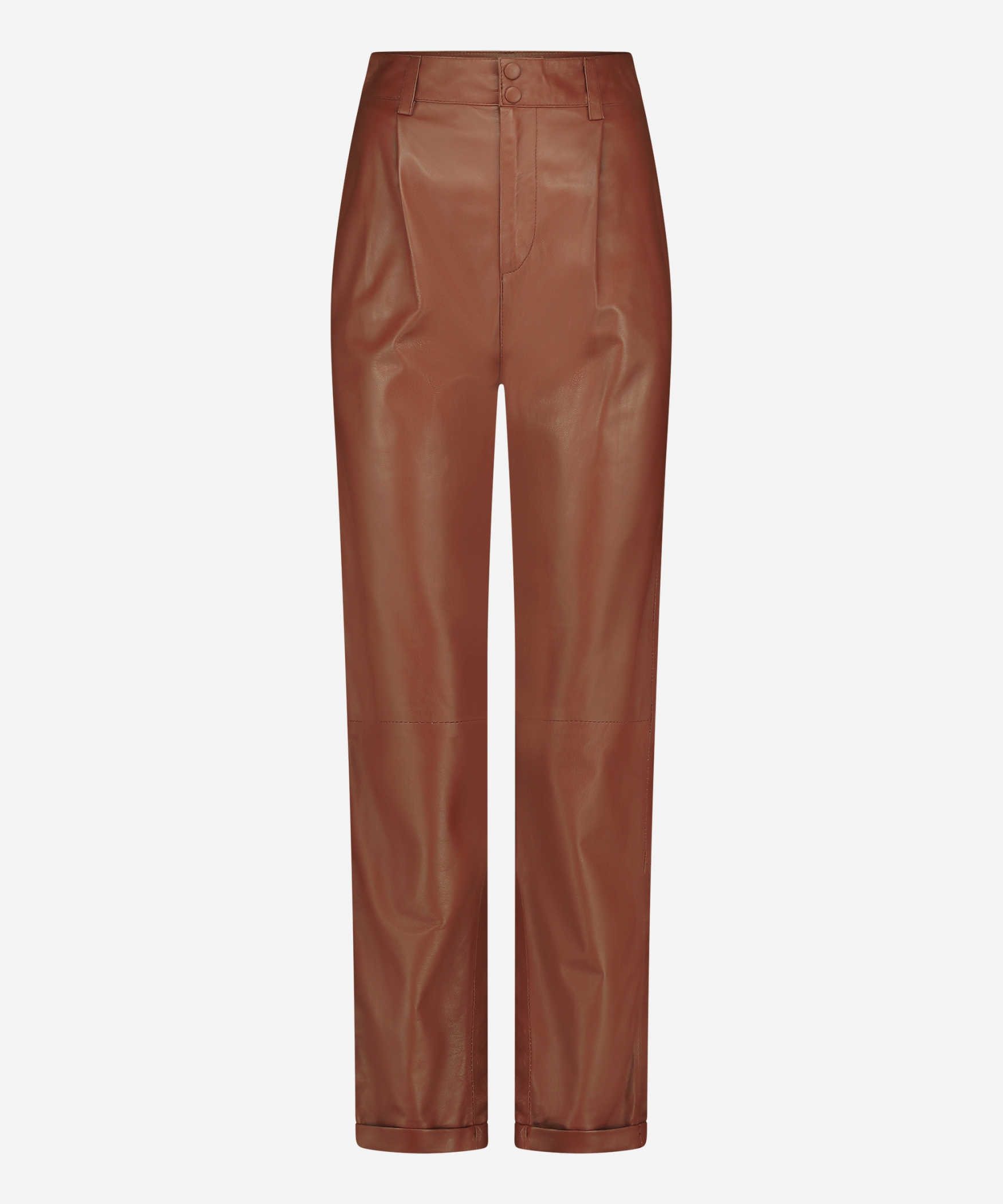 Ontdek ons nieuwe Pamina Pants in de kleur Caramello. Deze non-stretch leren broek heeft een high-waisted en lichte wide fit met een omslag detail aan de onderkant. De Pamina is voorzien van steekzakken en twee drukknopen met rits sluiting. Ga voor een ton-sur-ton look met een van onze andere items in Caramello. Het model op de foto heeft de Pamina gecombineerd met de best basic Tamora Top.| Binnenbeenlengte: | 74cm |