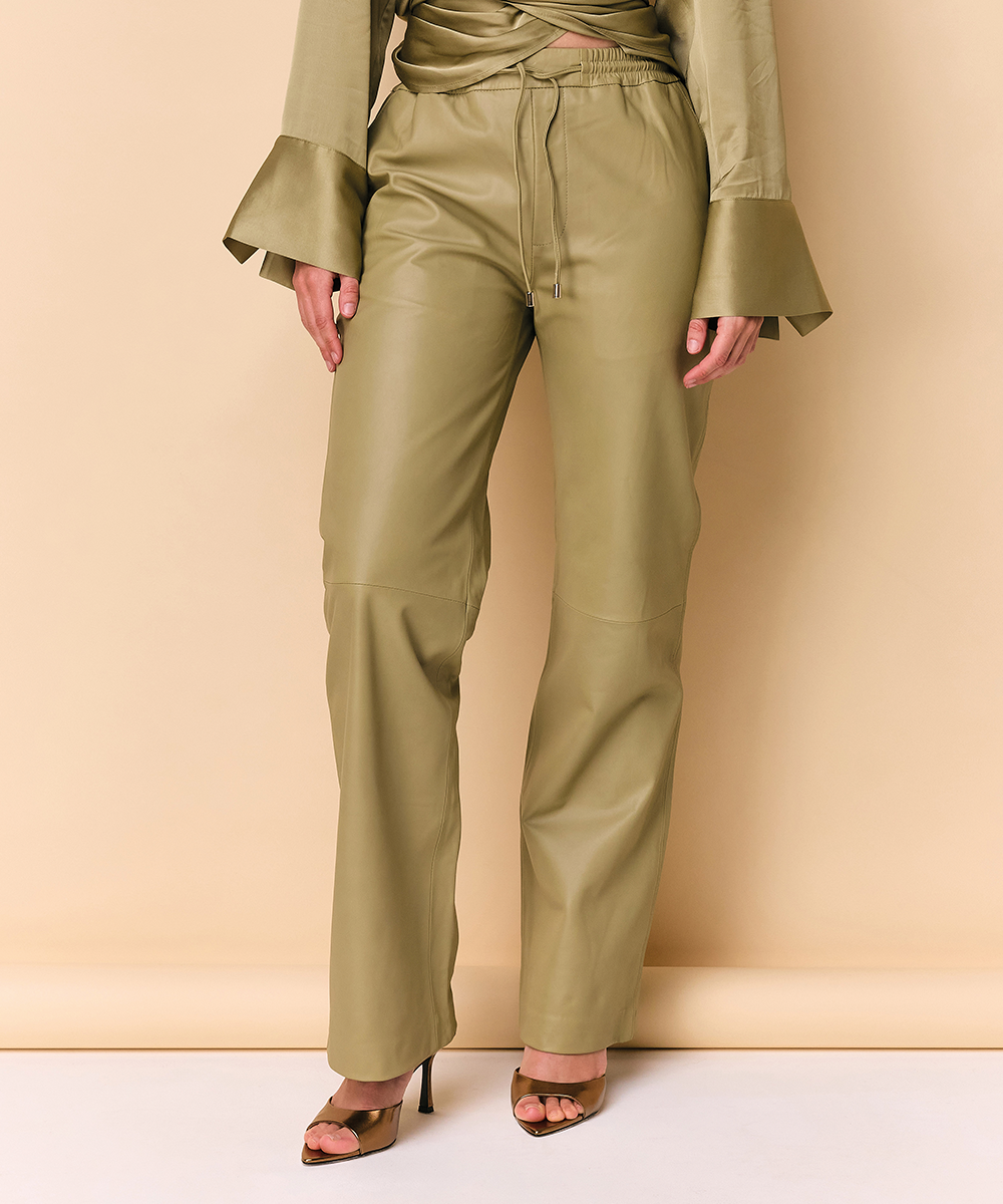 De Panna pants in Elm Green is een elegante leren broek met een rechte fit en mid-waist pasvorm. De non-stretch kwaliteit zorgt voor een luxe uitstraling, terwijl de elastieken tailleband met strikkoord zorgt voor extra draagcomfort. De binnenbeenlengte van de broek is 80 centimeter. Styling tip: De combinatie met de Tatum wikkelblouse zorgt voor een verfijnde en luchtige uitstraling door het contrast tussen het leer en glanzend satijn.| Binnenbeenlengte: | 80cm |