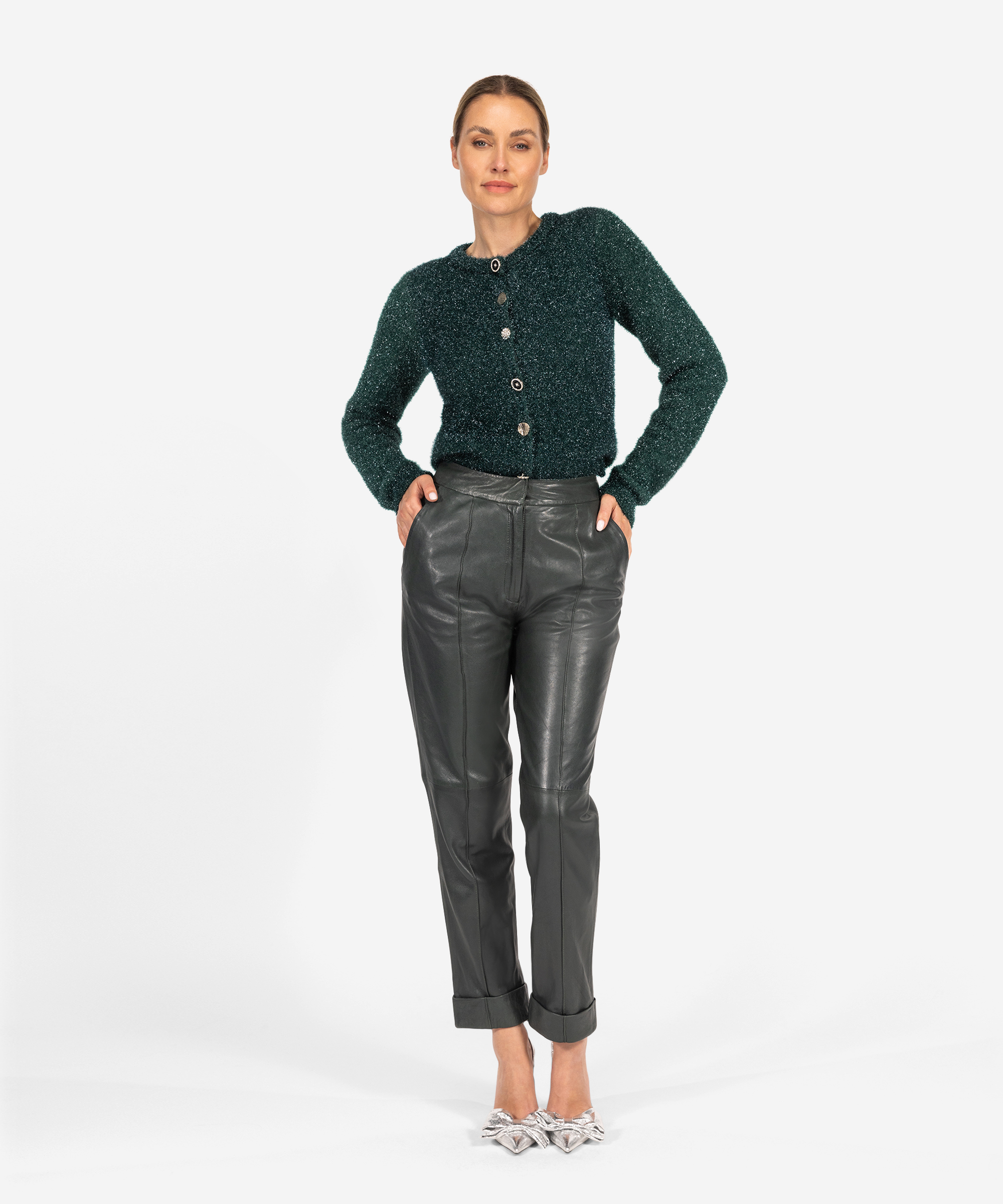 Maak kennis met onze Peggy broek in de donkere warme kleur Deep Teal. Deze mid-waist broek heeft wijdere broekspijpen en is gemaakt van hoogwaardig leer, met omgeslagen broekspijpen als stijlvol detail. De broek bevat twee handige steekzakken en sluit met een rits en hook and eye sluiting. Voor een complete en elegante look combineer je de Peggy broek met de Chrissy knit in Deep Teal zoals het model op de foto. Deze combinatie zorgt voor een samenhangende en trendy outfit, perfect voor verschillende gelegenheid.