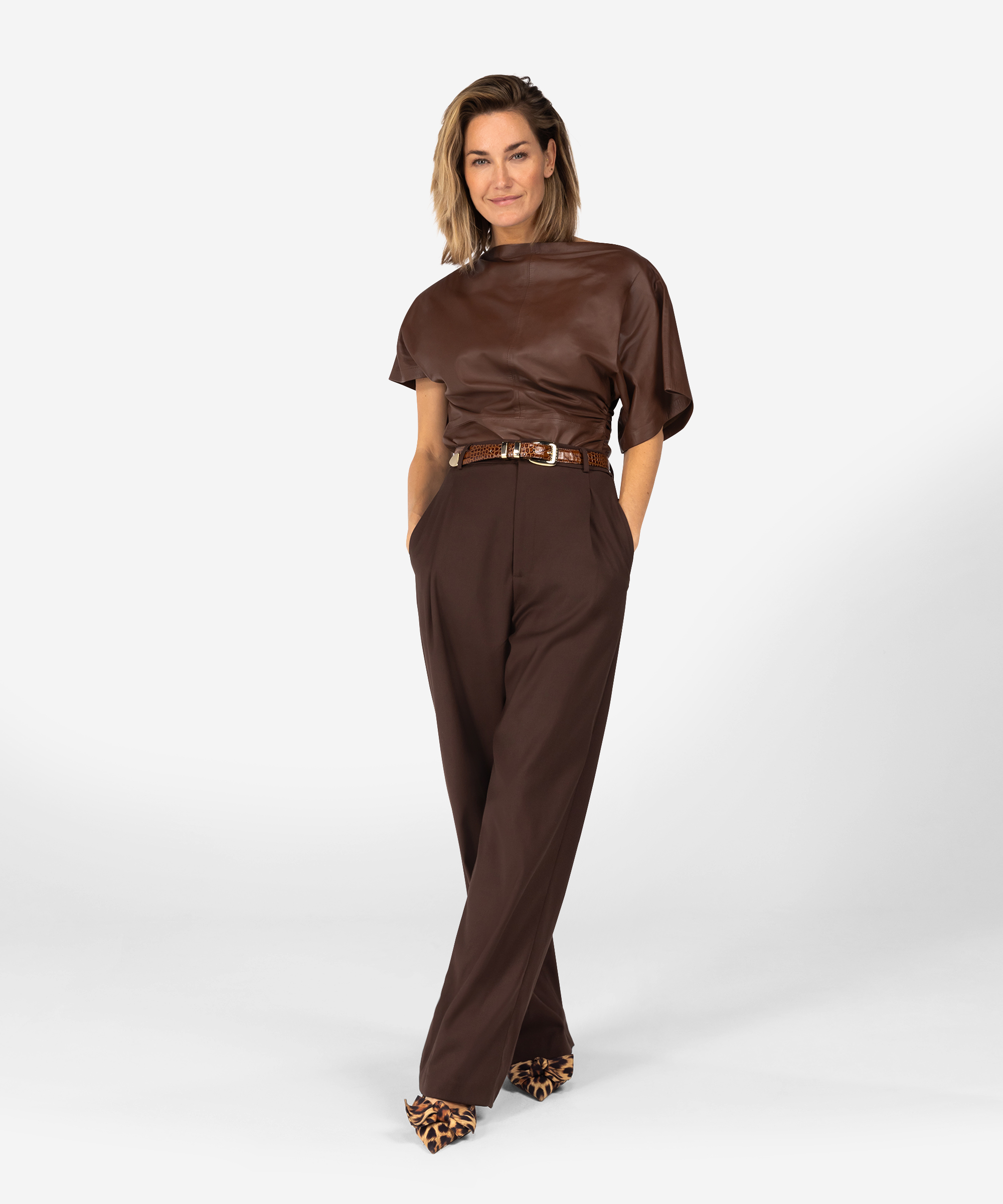 De Perria Pantalon in de kleur Hazelnut is een goede basis voor jouw herfst en winter garderobe dit seizoen. De broek heeft een high waisted fit, de broekspijpen zijn wijd en straight en de Perria kan gesloten worden doormiddel van een rits en knoop. Het model op de foto combineert de Perria met de Tyna Blouse in dezelfde Hazelnut kleur en stijlt de look af met de Acro Riem.
