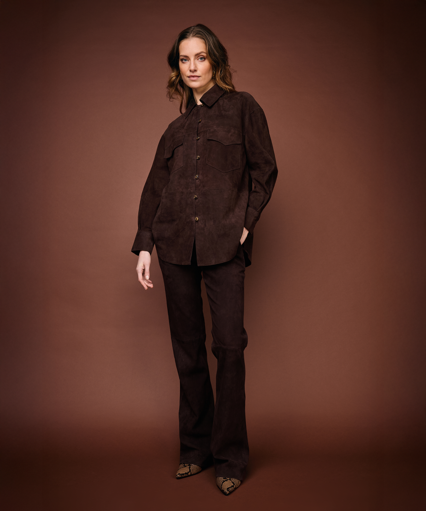 De Pienna Suede in de kleur Coffee Bean is gemaakt van hoogwaardig kwaliteitsleer en heeft een aansluitende fit. De broekspijpen hebben een lichte flared en geven jou daarmee een vrouwelijke en elegante uitstraling. De Pienna is voorzien van twee steekzakken en heeft een elastische tailleband voor extra comfort. Stylingtip: Combineer net als het model de broek met de Tamora Turtleneck in de kleur Coffee Bean.| Binnenbeenlengte: | 87cm |