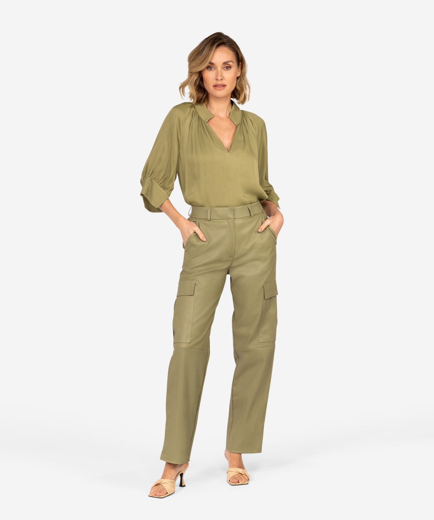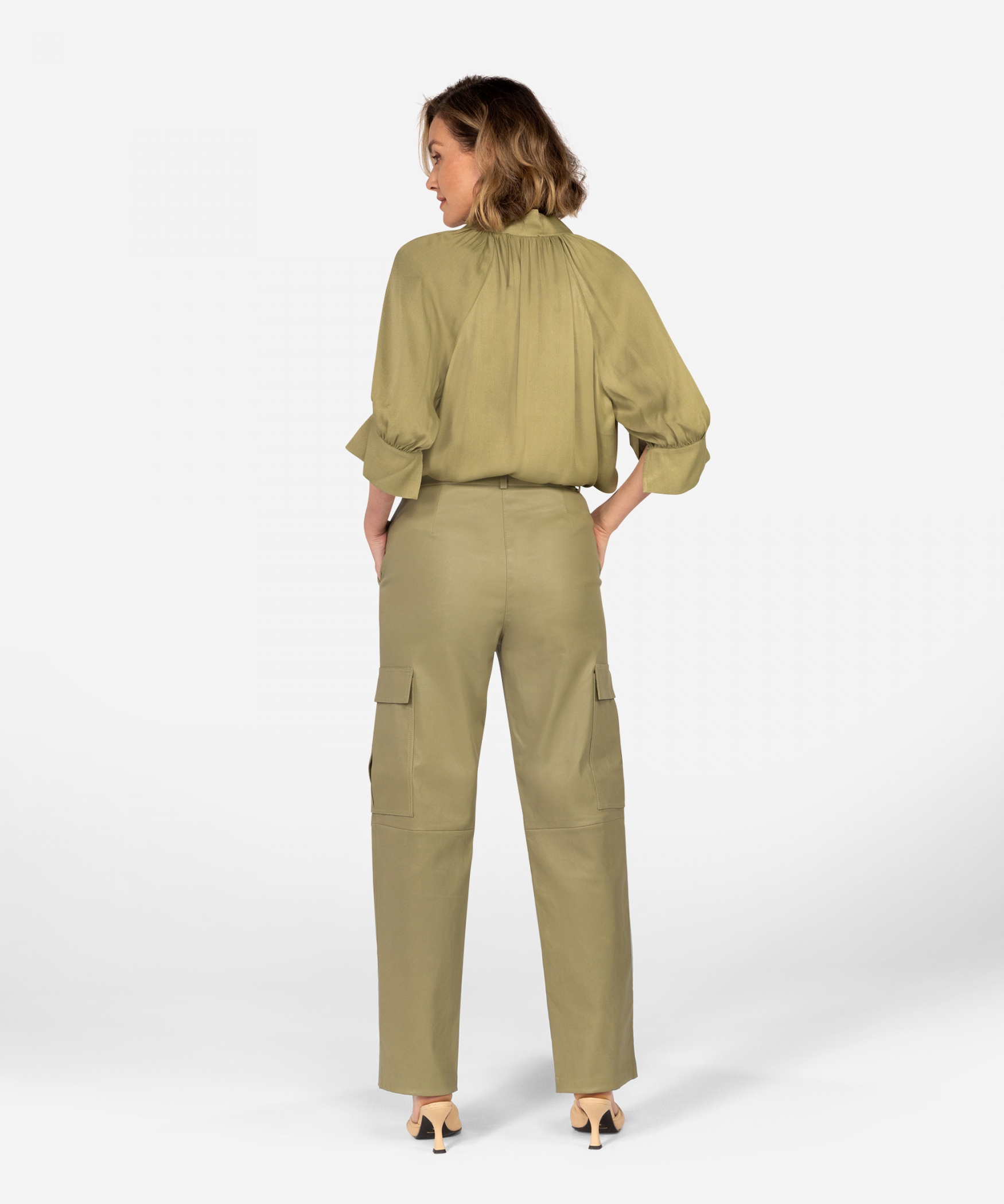 Maak kennis met onze nieuwe broekmodel, de Pleuni. De broek is gemaakt van boterzacht leer en heeft enkele aspecten van een cargobroek. De voorkant heeft een rits met knoop sluiting en de broek heeft twee klepzakken. Het model valt los en de pijpen lopen recht naar beneden. Combineer de broek met de bijpassende Taleen top of andere Moss Green top uit de collectie.