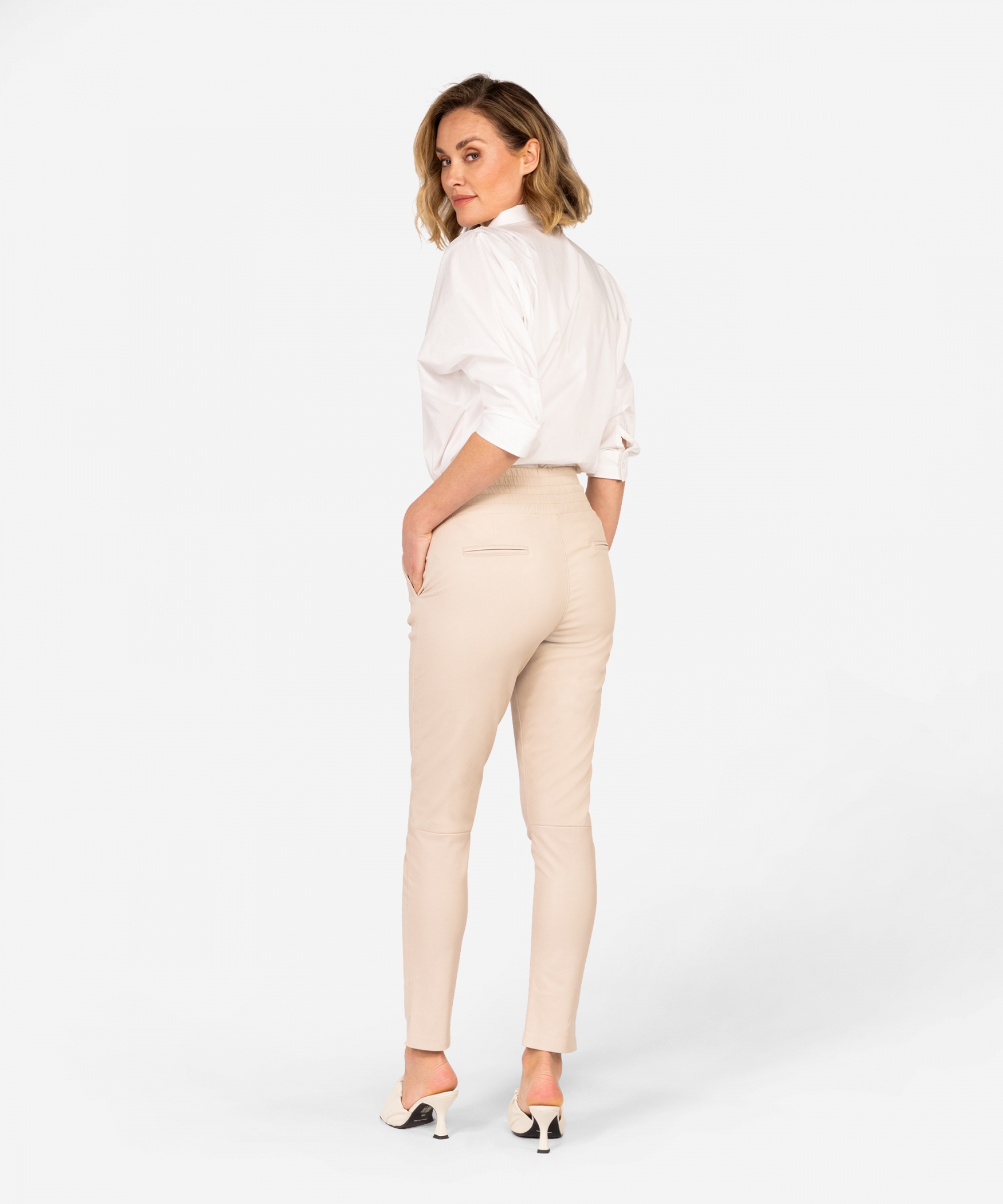 Ontdek de perfecte combinatie van stijl, comfort en hoogwaardige kwaliteit met de Poggy in de kleur Almond White. Deze broek is gemaakt van luxe stretchleer, waardoor de Poggy niet alleen een verfijnde uitstraling heeft maar ook een veel pasvorm en bewegingsvrijheid biedt. De Poggy Almond White heeft een high-waisted fit die jouw silhouet flatteert. De verbrede band is voorzien van een leren koortje en de kwaliteit van het stretchleer zorgt ervoor dat de Poggy comfortabel aanvoelt en perfect aansluit op jouw lichaamsvorm.