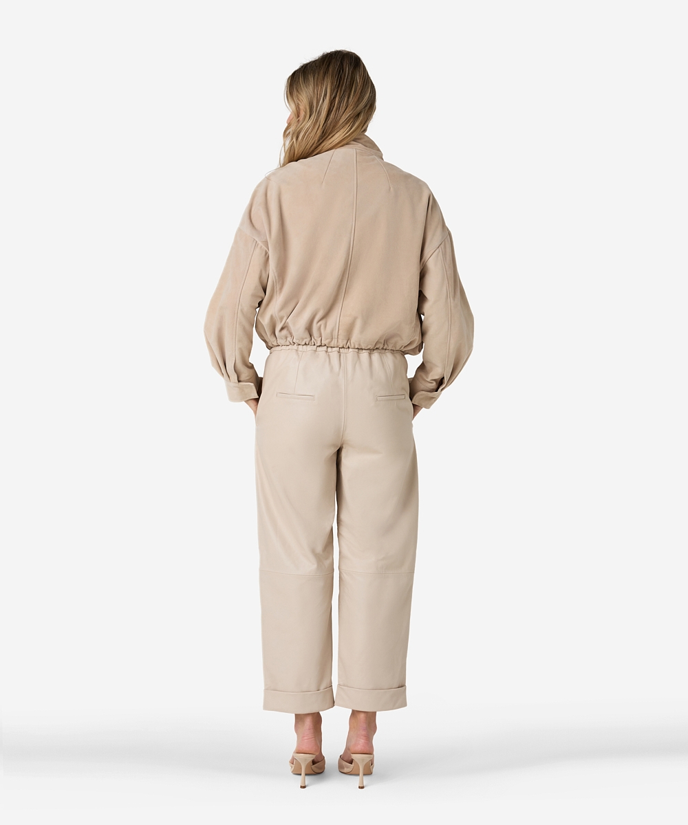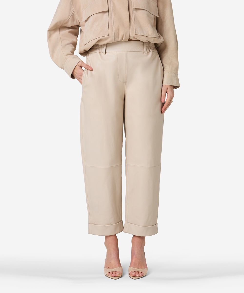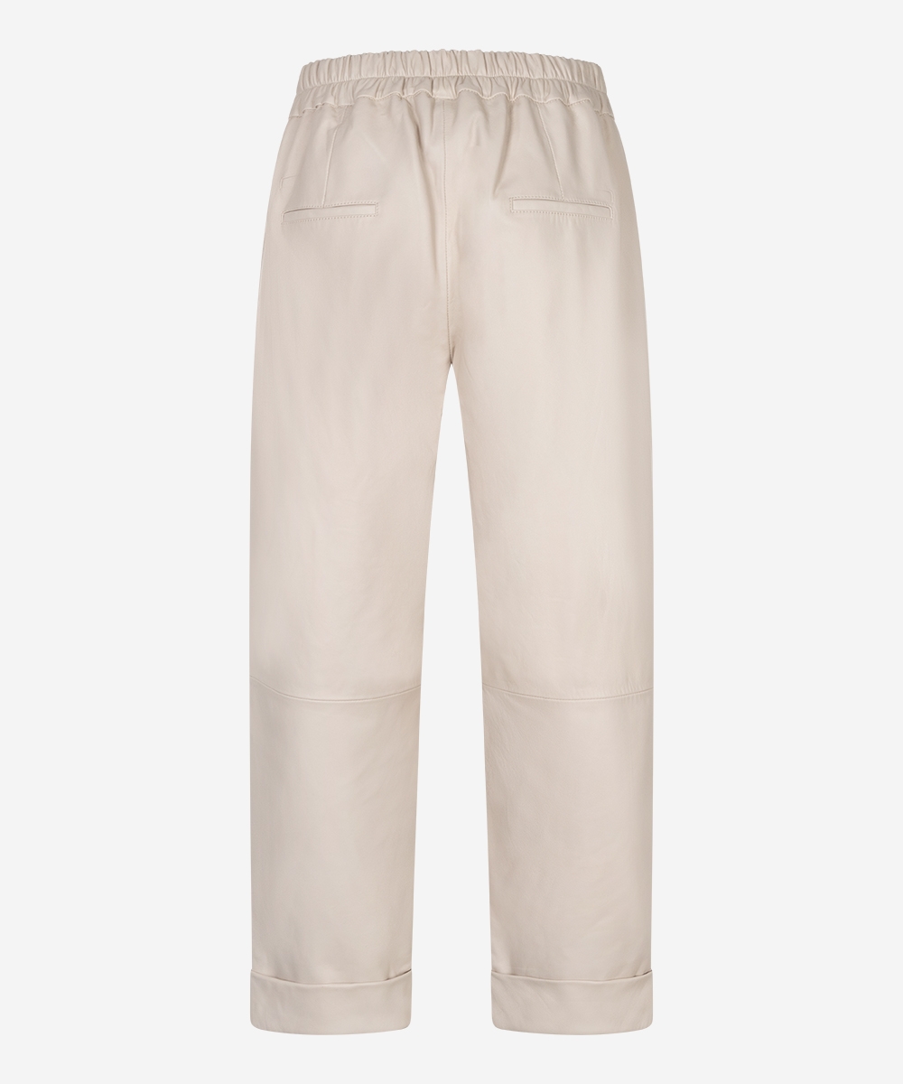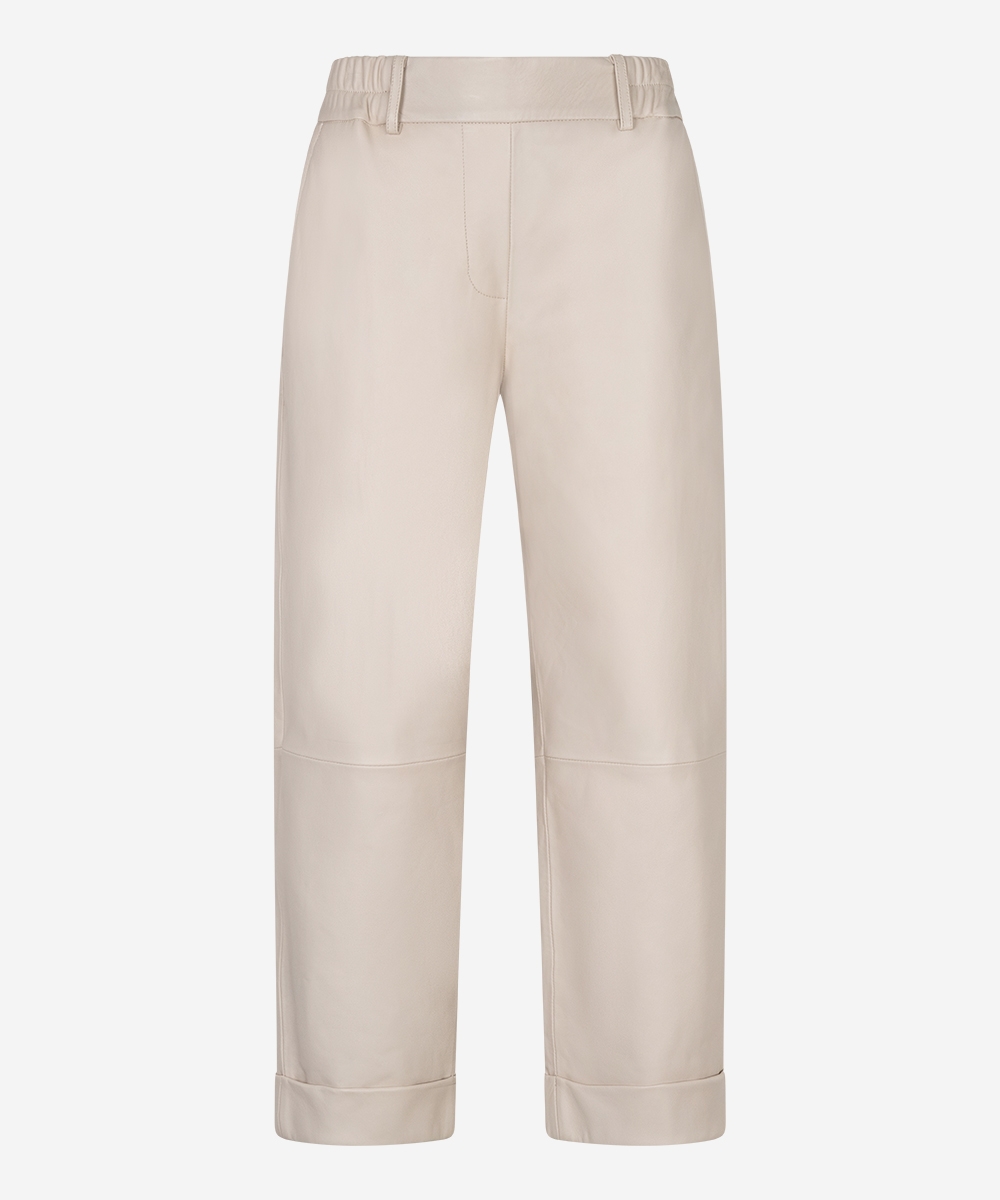 De Promise broek in de kleur Ostra Beige heeft een wijde fit en is gemaakt van non-stretch hoogwaardig kwaliteitsleer. De broek heeft een binnenbeenlengte van 64,5 centimeter en heeft daardoor een wat cropped fit. Door de elastische high-waisted tailleband zit de broek erg comfortabel