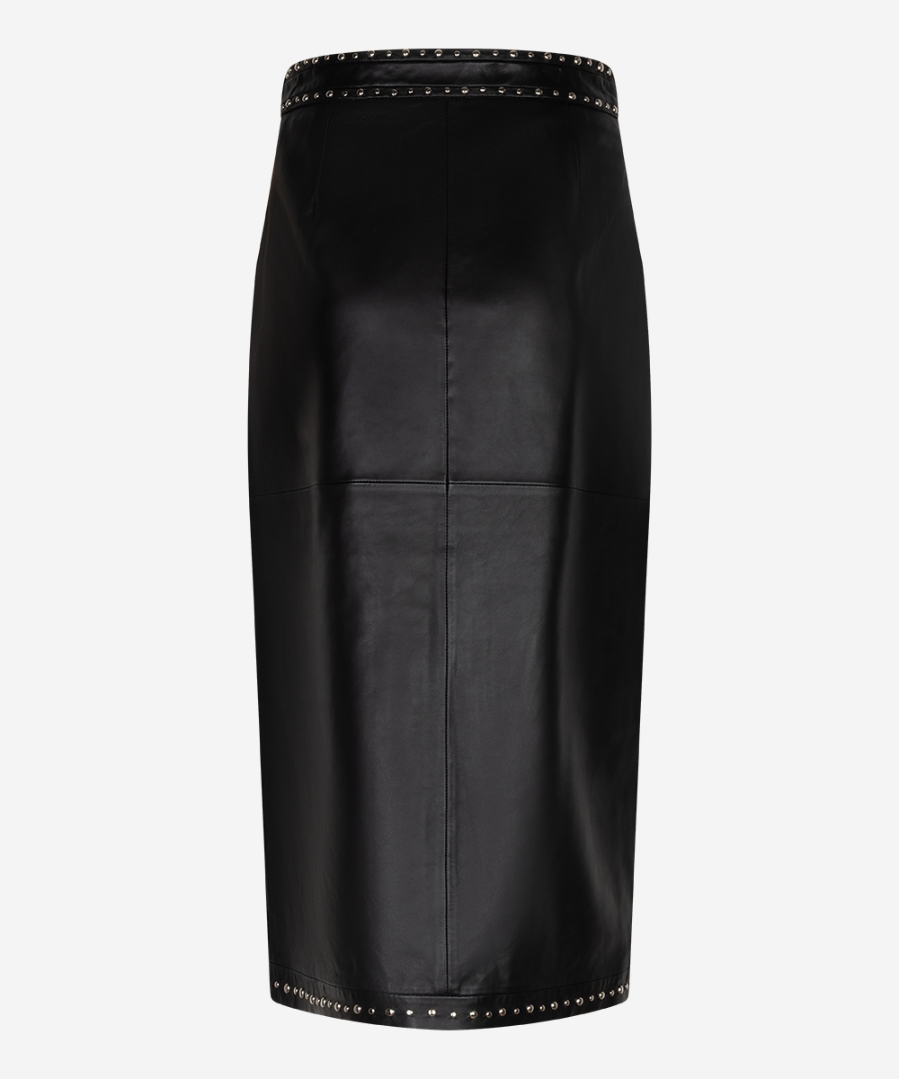 De Saffron rok in zwart is een leren midi-rok met een elegante, stoere twist. De rok is gemaakt van non-stretch leer en heeft een ritssluiting aan de achterzijde. Subtiele studs en een splitje aan de voorkant geven het item een eigentijdse uitstraling. Een veelzijdige rok die moeiteloos te combineren is voor zowel dag als avond.| Categorie: | Shorts en Rokken |