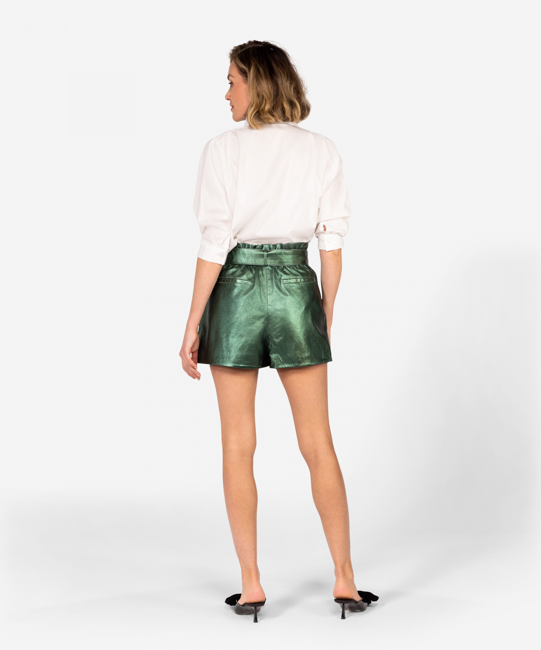 Look at this statement piece! Met de leren Sasha shorts in de te gekke kleur Metallic Shagreen weet je zeker dat je de blits maakt. De Sasha shorts heeft een high waisted fit. Het elastiek in de taille van de shorts zorgt voor een perfecte pasvorm en de strik aan de voorkant geeft een speels effect. Een leren korte broek is multifunctioneel in de zomer met blote benen en in de winter super leuk met een panty eronder.| Buitenzakken: | Twee steekzakken |