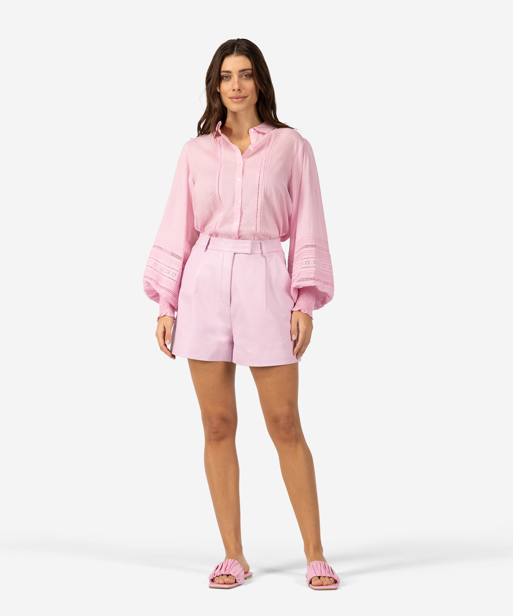 De Sicily shorts in de kleur Pinka. Deze non-stretch leren shorts hebben een highwaist fit, met een rits en hook and eye sluiting en twee steekzakken. Voor een ton-sur-ton look combineer je de Sicily met de Treabhar top in Pinka of zoals het model met de Tegra top.Buitenzakken: | Twee steekzakken |