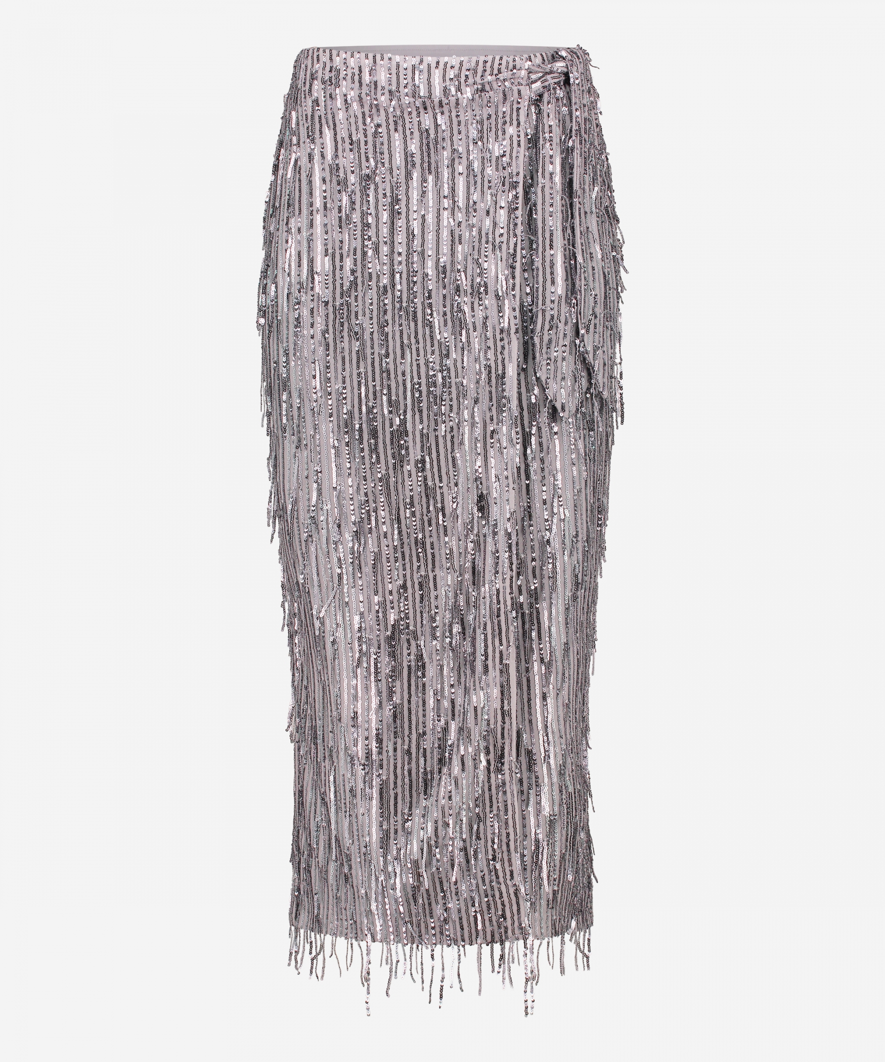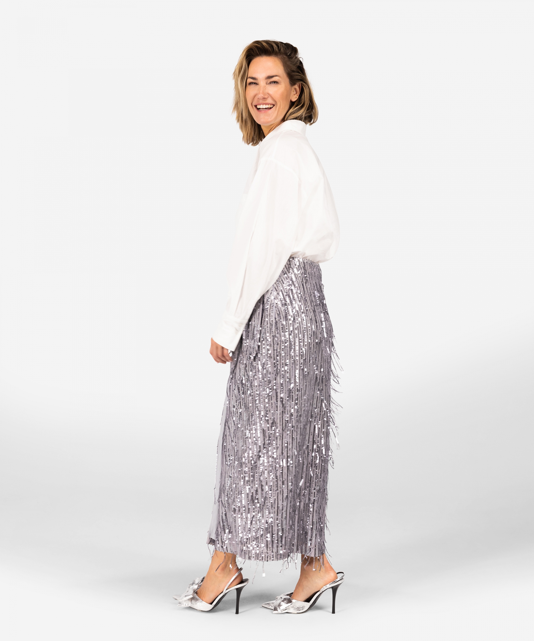 Met deze té gekke Siera rok steel jij de show! Deze omslagrok heeft prachtige zilveren pailetten en door middel van een strik kan je de rok naar eigen wens dichtknopen. Het model op de foto draagt de rok samen met de witte Teula Blouse. Maar wil jij uitpakken tijdens de feestdagen of een andere speciale gelegenheid? Combineer de rok dan met de matching Folette Top.