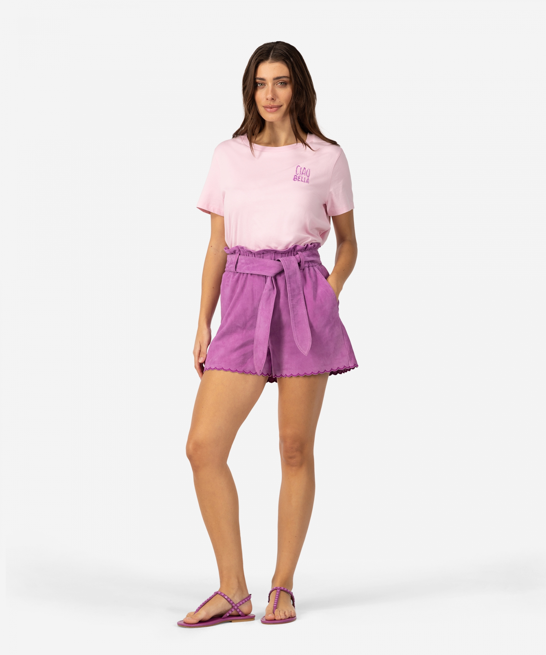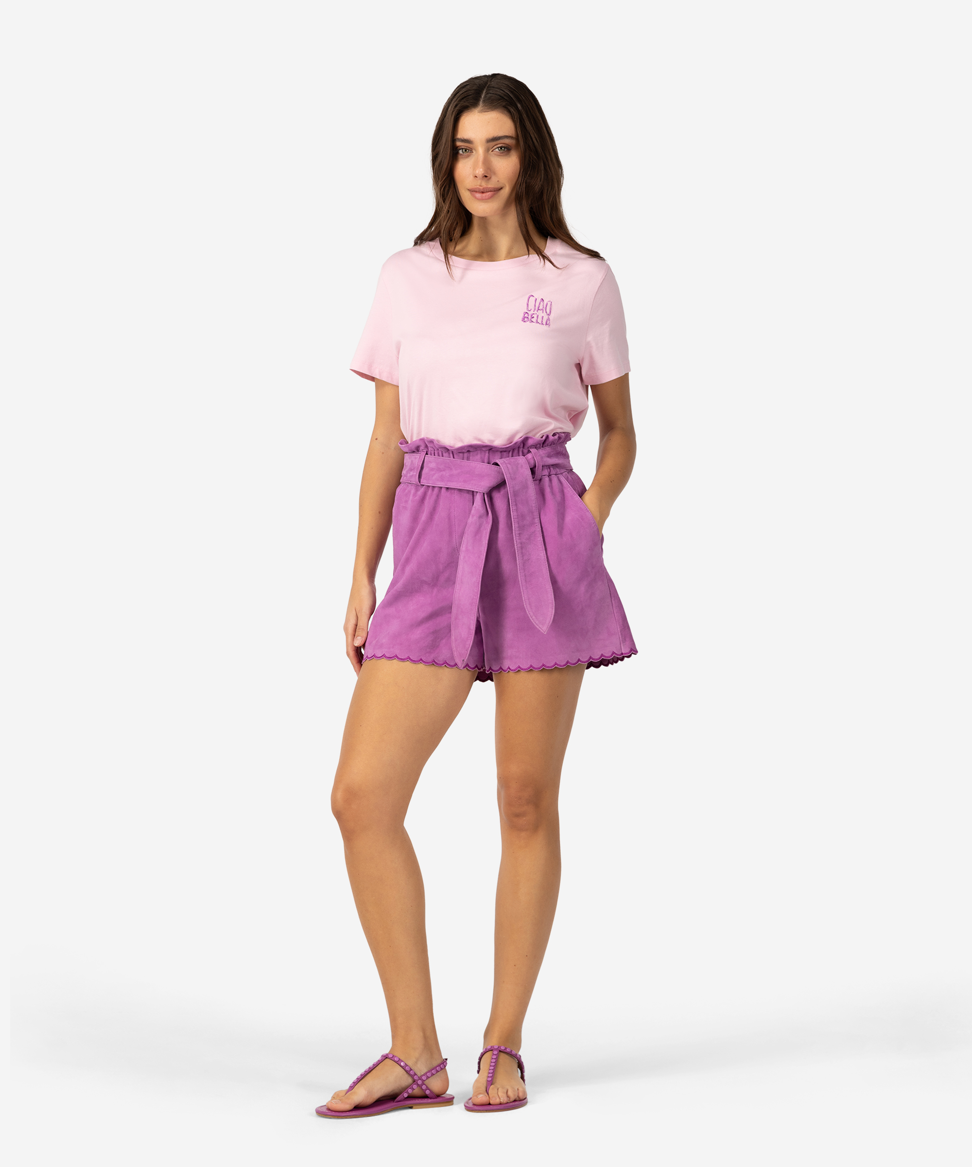 Ontdek ons favoriete t-shirt: de Taylin. Het shirt is gemaakt van 100% katoen en heeft een rechte fit. Boven de linkerborst heeft de top een prachtige 'Ciao Bella' borduursel. Draag de Taylin net als het model op onze suede Sandira Shorts voor een fashionable zomerse look! Maak je outfit af met de bijpassende Aroline sandalen!| Categorie: | Tops en Truien |