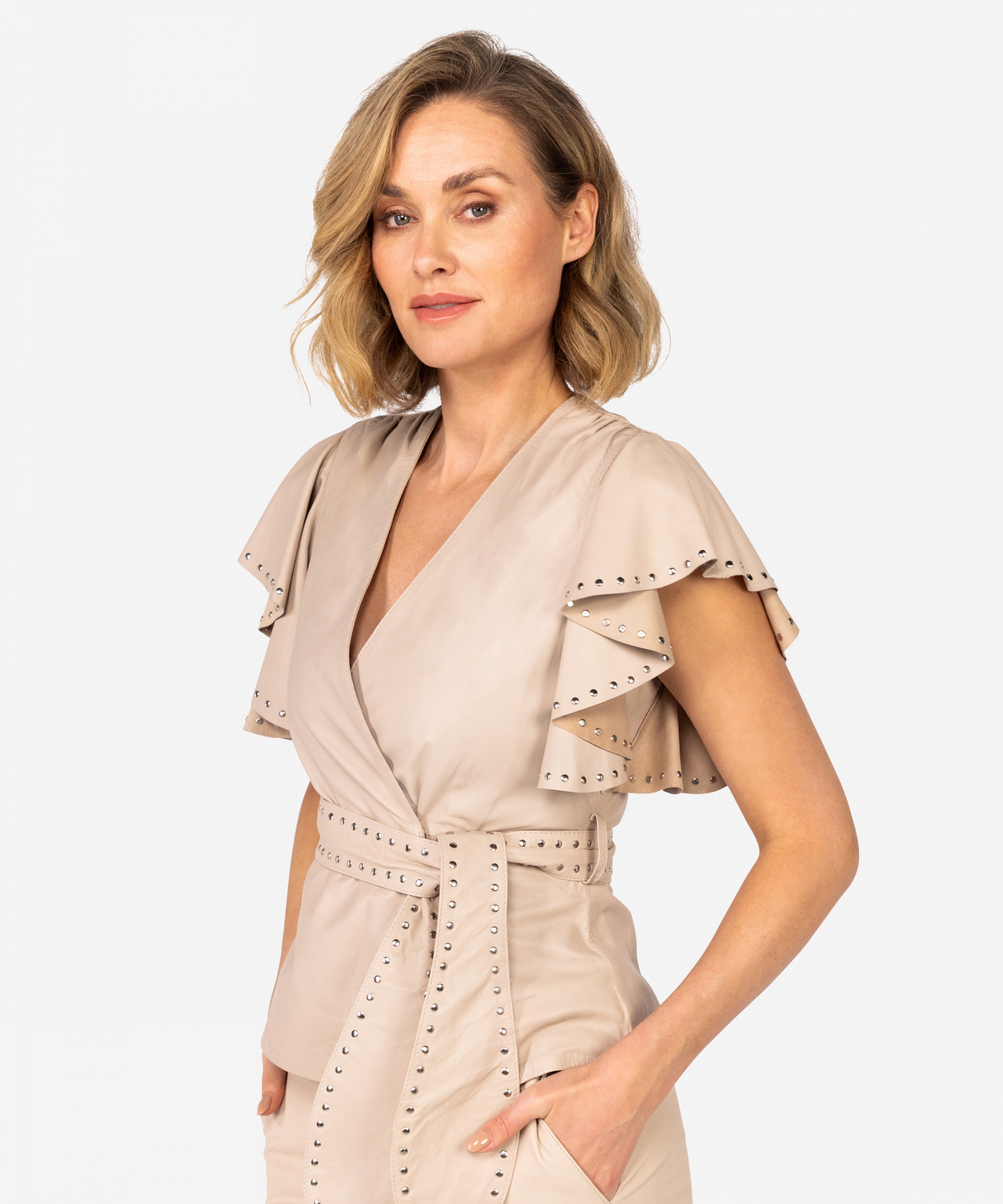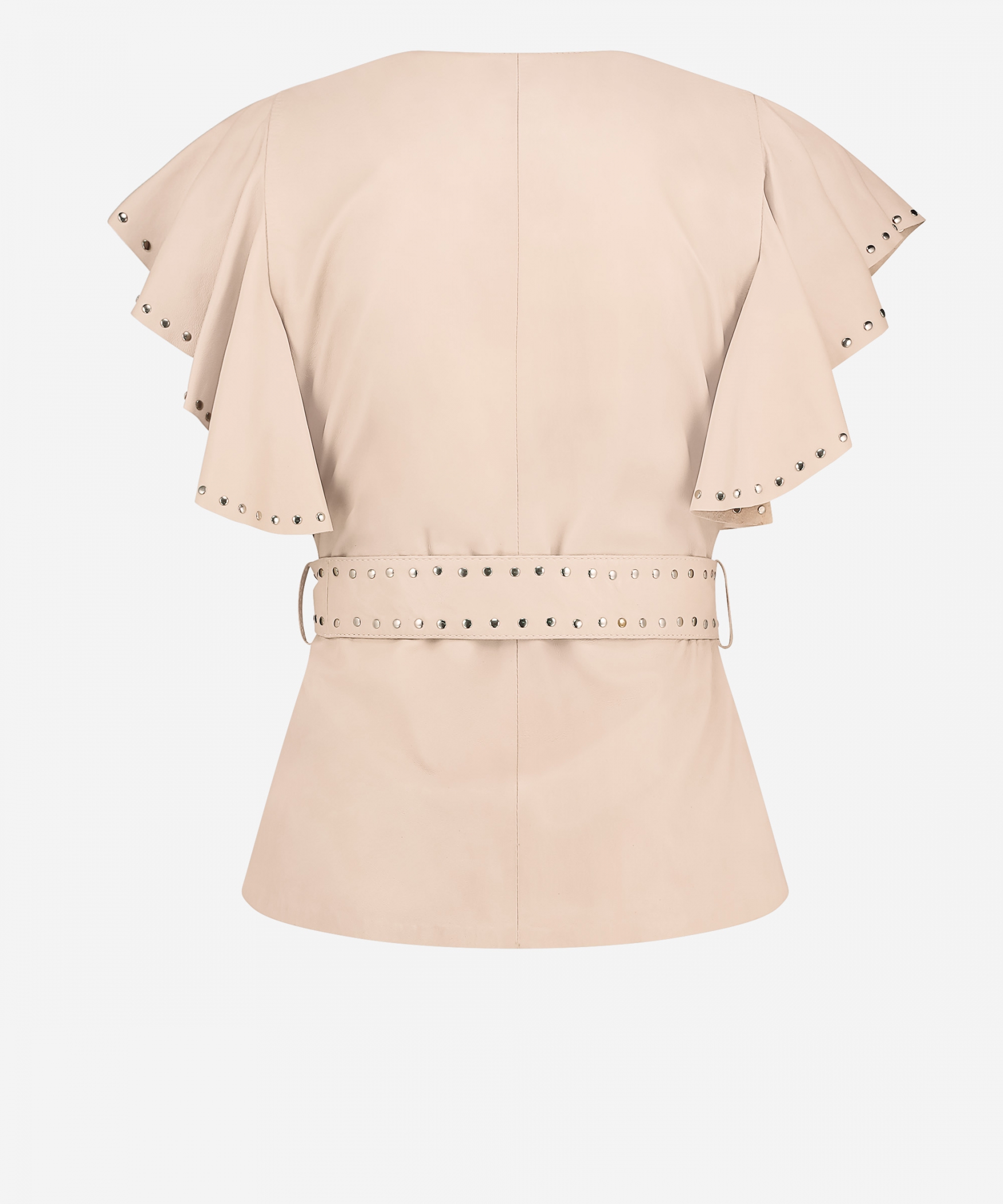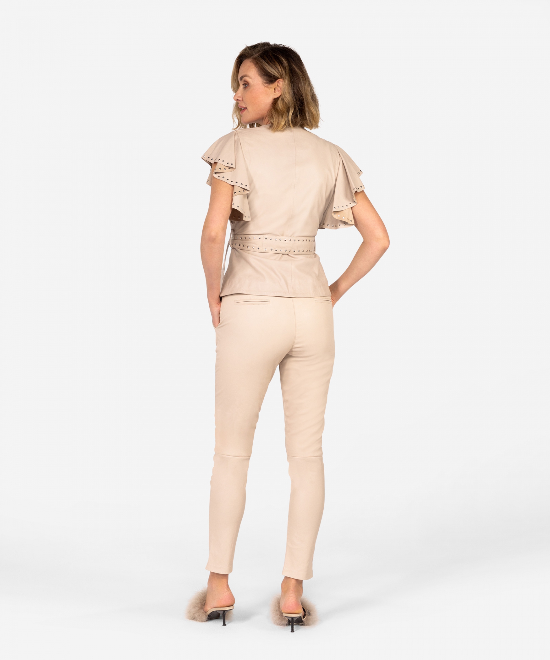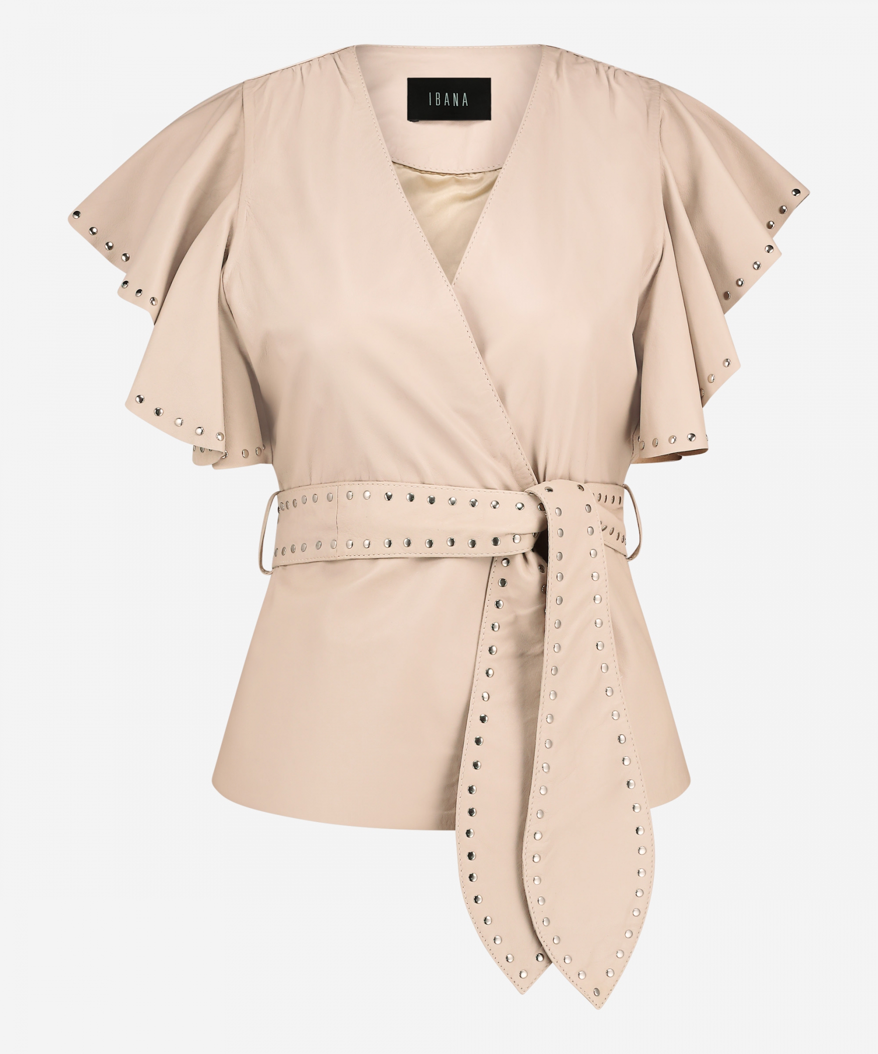 Onze leren Tazara top in de kleur Almond White is een echt fashion item. Deze top valt op door de unieke details, zoals de studs op de mouwen en tailleband. De pasvorm is regular en door de overslag sluit de top mooi aan in de taille. Combineer de Tazara top met de Colette broek in dezelfde kleur voor een prachtige ton-sur-ton look.
