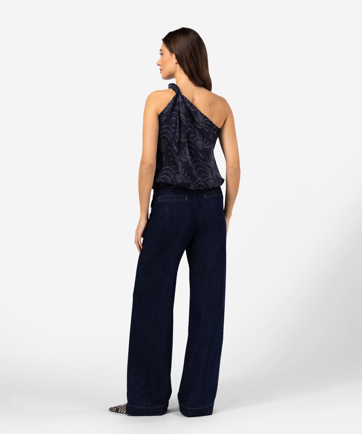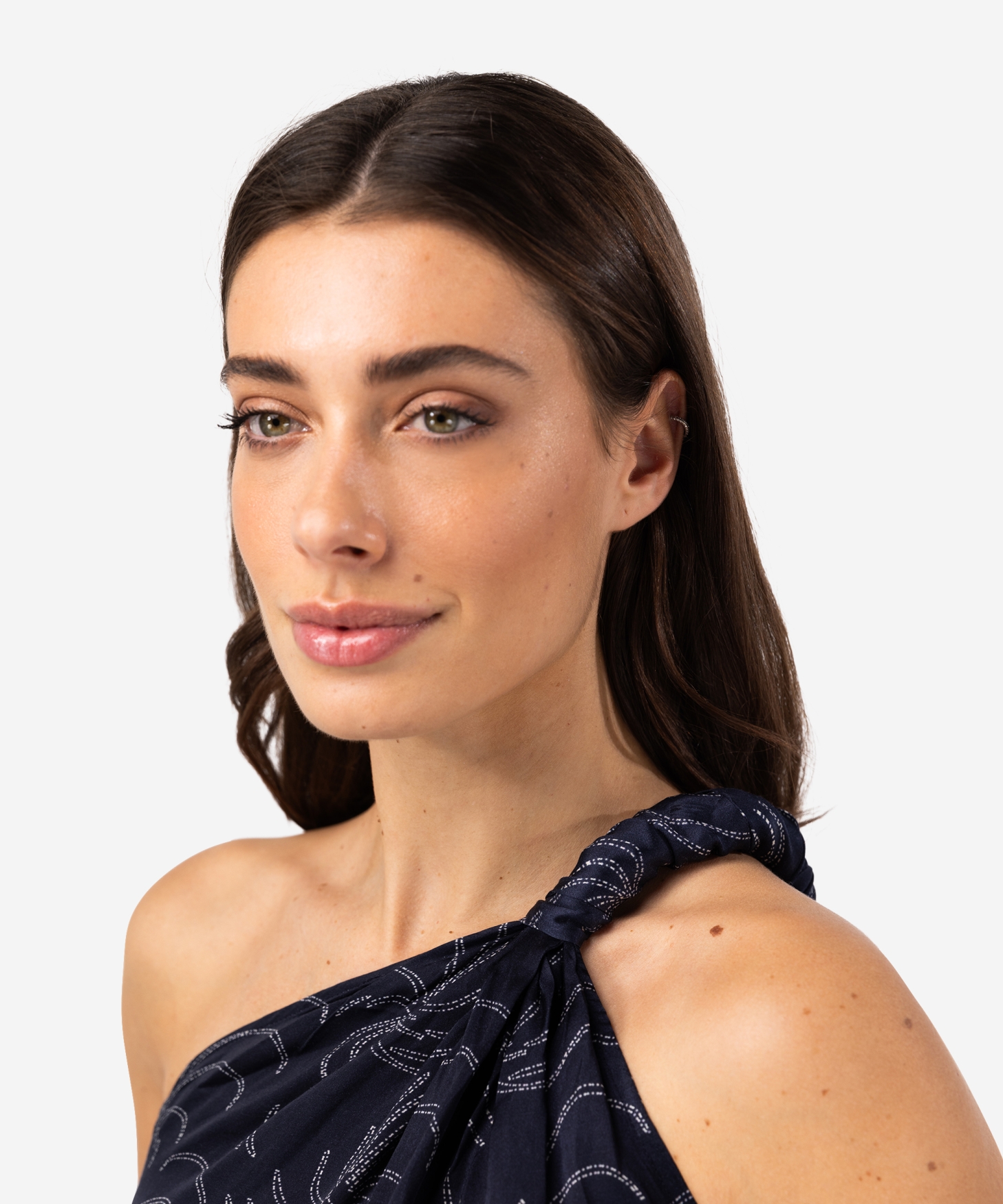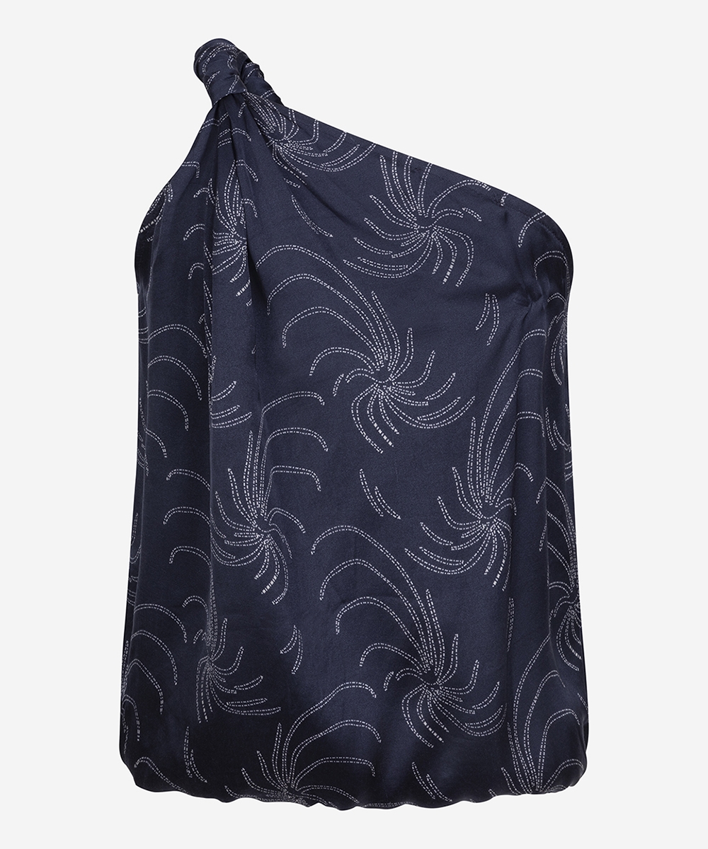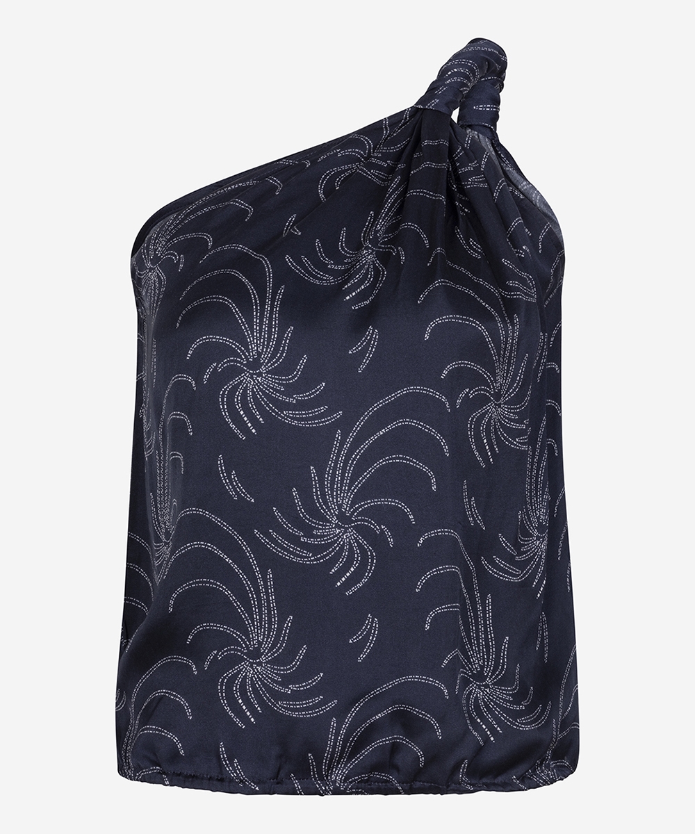 Ontdek de one-shoulder Terry Top. De donkerblauwe top heeft een prachtige Dotted Palm print, een regular fit en is gemaakt van viscose. Het schouderbandje dat over je linker schouder gaat heeft een gedraaid detail wat de top net wat speelser maakt. De onderkant van de top is voorzien van een elastieken band waardoor de top een luchtig effect krijgt. Combineer de Terry met de bijpassende Pae Pants voor een fashionable co-ord look.| Categorie: | Tops en Truien |