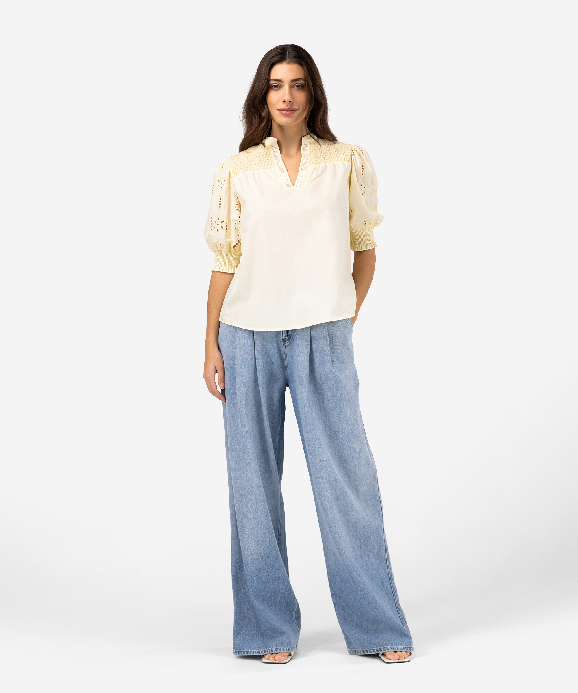 Maak kennis met de Tesja Top in de trendkleur Giallo Tenue. De 100% katoenen blouse heeft korte broderie mouwen met aan de onderkant een smokdetail. Daarnaast heeft de Tesja een V-hals en combineer je de top gemakkelijk met bijvoorbeeld onze Pristina Jeans.Categorie: | Tops en Truien |